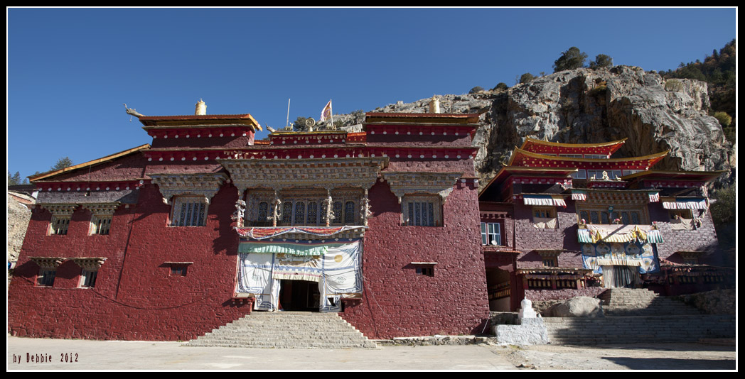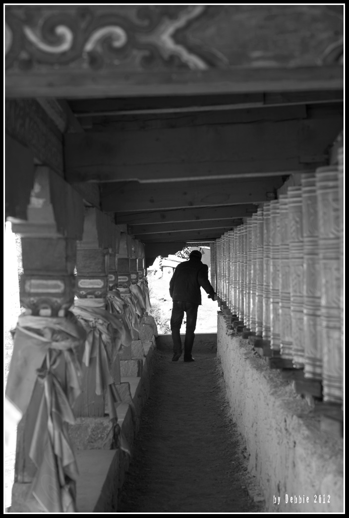 吃過溫暖的早餐後就繼續開車,沿著稻城河走,不多久就到達桑堆,遠遠已看見一些白塔,原來我們到了稻城最古老的寺廟蚌普寺,又叫奔波寺。這是一間白教(噶舉派)寺廟,也是今次旅程中唯一參觀的白教寺廟。它建在桑堆一座山下,靠近河流,風景秀麗。我們把車停在寺廟外的空地,司機說他沒有興趣入內參觀,便叫我們到處去看看。寺廟很大,被一條長長的迴廊圍著,而迴廊裏就掛滿一個個用銅鑄成的大經筒,外面刻有六字真言。一個朝聖者正在遂一轉動著經筒,每轉動一回,就等於誦讀了一遍經文。來到大殿前的廣場,隱約的誦經聲傳到我們的耳中,我們走到大殿的門前,門關上了,正猶豫可不可以入內之際,就有一位喇麻走出來,還邀我們入去參觀,但不可拍照。九點多的陽光已很猛烈,當推開門什麼也看不見,要等十多秒才能適應殿內昏暗的光線。一般寺廟內都很昏暗,光線主要都是來自酥油供燈的燭光,偶爾夾雜晨曦淡淡的光線,令寺廟的宗教色彩更濃。大殿樓底很高,在殿中放了噶舉派始創人噶瑪巴‧都松欽巴的塑像。我們很快地走了一圈,在門外拍些照片便離開。