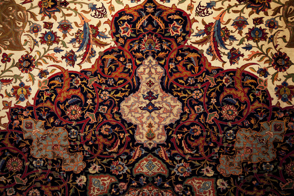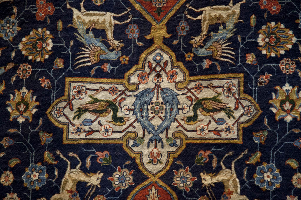 在地下這一層的地氈都是跟時代展覽,最古老的一張是5th Century B.C.的地氈,可惜放在這裡的是仿製品,真品放在聖比得堡的冬宮。另外還有16~17世紀薩法維皇朝的地氈,圖案有雀鳥、動物和植物。跟遜尼派不同之處,什葉派可以在藝術品上加入動植物和人物的元素,較為生動。
