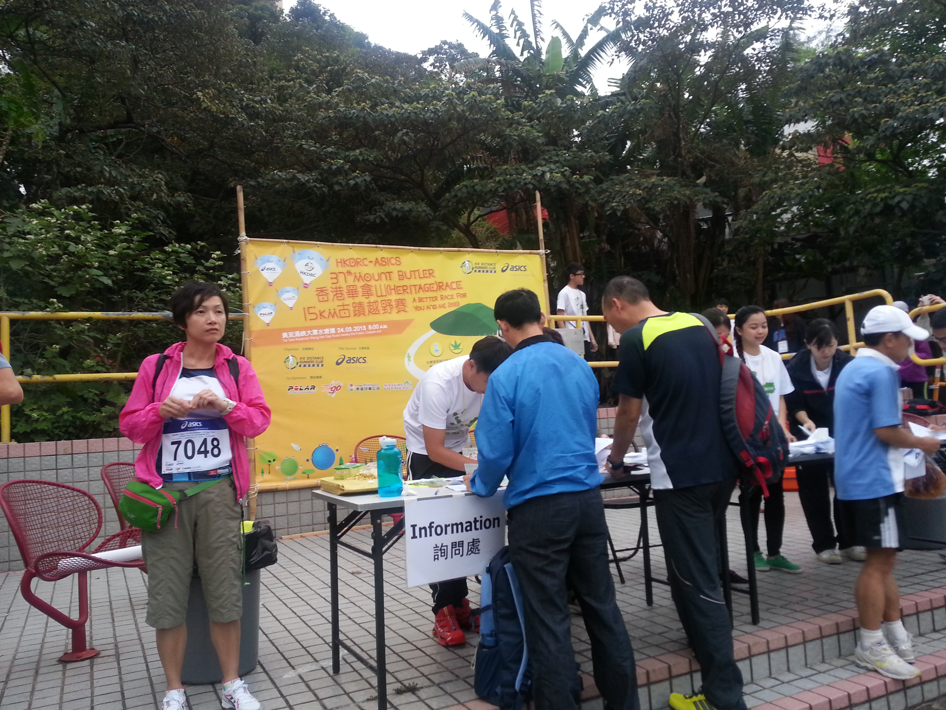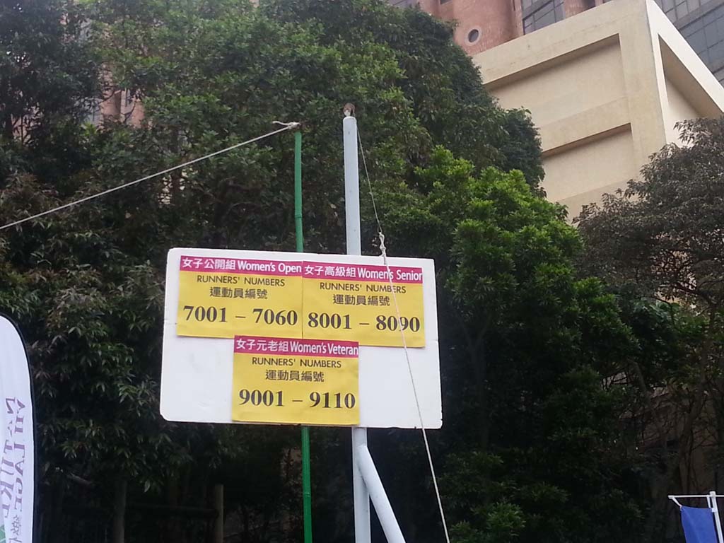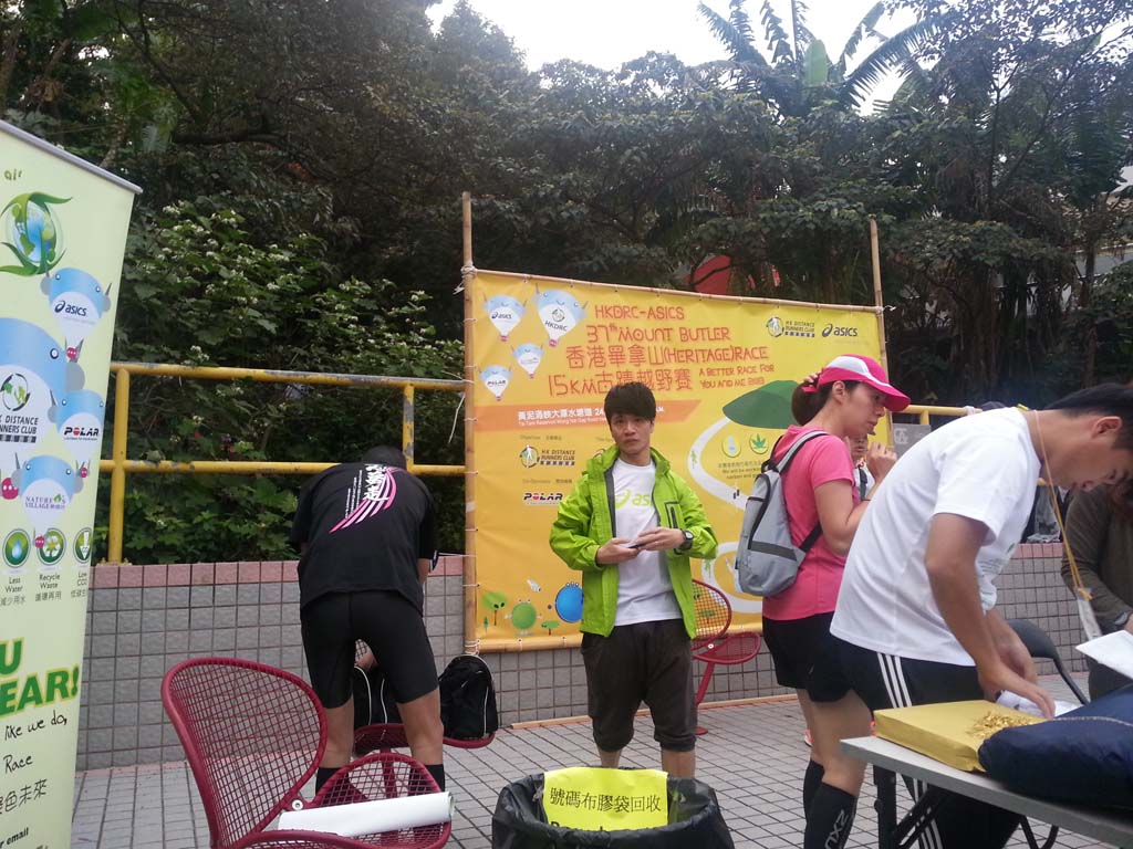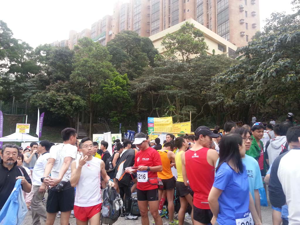 比賽當天很早起床,因要在尖沙咀搭6:30am的shuttle bus去大潭水塘附近停車場集合,8am開跑。據說今年參加人數比上年多,所以集合點很擠迫。拿了號碼報後便匆匆把行李寄存好,做好熱身準備開跑。