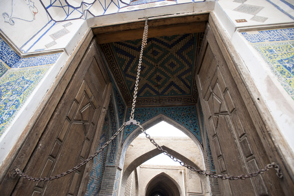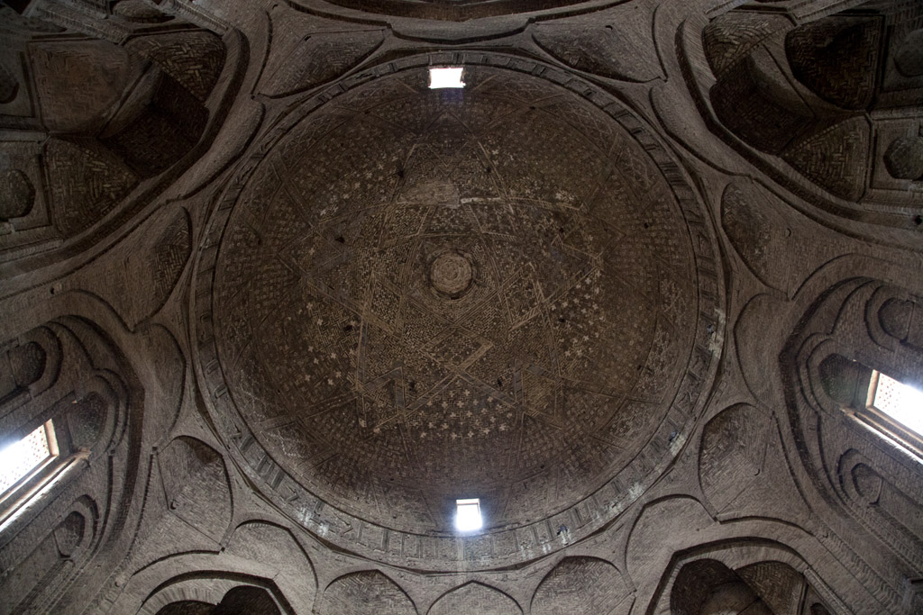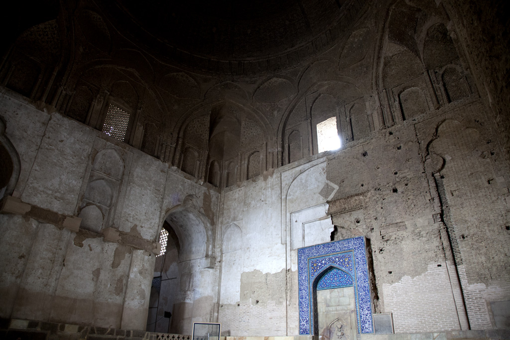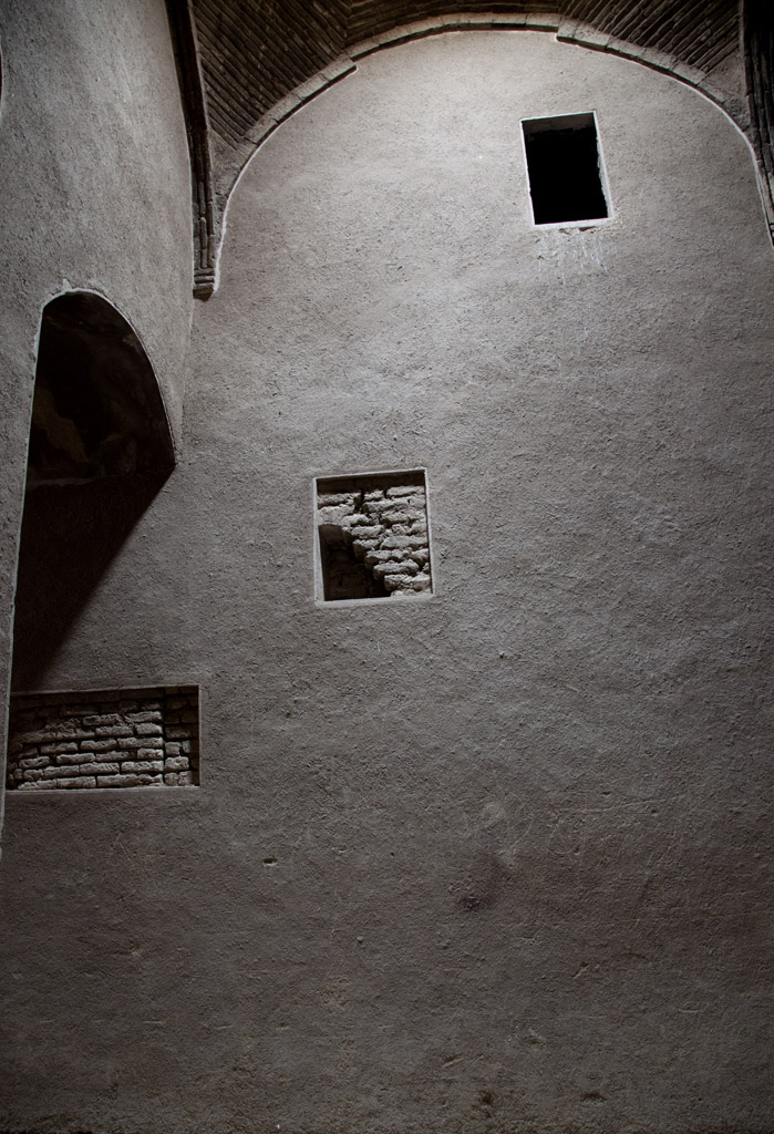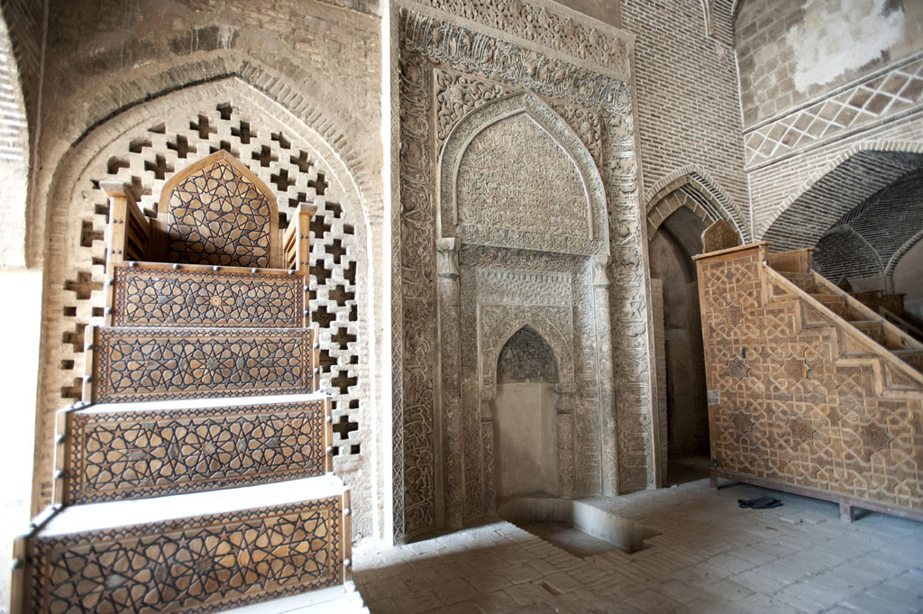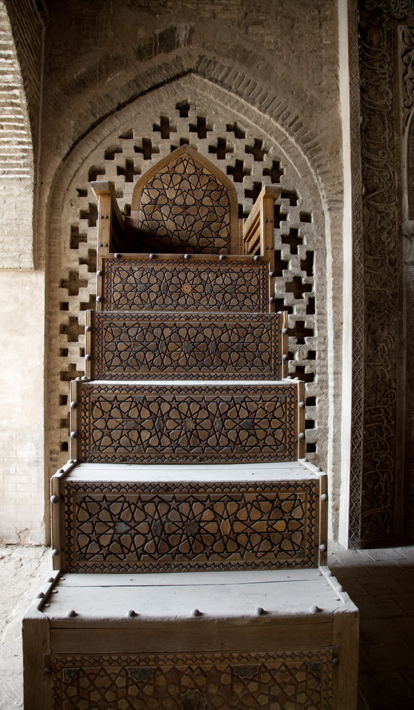 清真寺的內部是以素色的土磚砌成不同的幾何圖案,線條分明,形成深淺不一的顏色,很有層次。 細看之下牆上的花紋也變化多端,還用藝術書法刻上了可蘭經文。大殿內有很多根用磚砌成的柱廊,別小看這些柱,它們是用來支撐著各個圓頂,很宏偉。徘徊於柱廊之間,可以看到變化萬千的光影,非常特別。我們經過一個小房間(Room of Sultan Uljetu),裡面有一個用陶土做成的mihrab壁龕,朝向麥加,凹了下去的坑是祈禱用,上面刻了伊斯蘭花卉圖案和可蘭經的銘文。在壁龕兩邊是木做的講經壇,每一級都刻了細緻的的花紋。接著我們走進了隔壁的冬天祈禱室(beit al-Sheta),平常是關上門,所以要麻煩管理員老佰打開給我們參觀。裡面很清涼,地下鋪滿了一塊塊有紅色傳統花紋地毯。這裡雖然沒有窗,但一點也不覺悶熱,想必炎夏時走進來一定很舒服。 當我想按下快門之際,老佰突然把門和燈也關了,叫我們等一下。大約半分鐘後,當眼睛適應黑暗後,漸漸地看見祈禱室。雪白的牆身開始發出微弱的光,頓時把整個祈禱室照亮了。原來老佰讓我們進來就是要給我們看這效果。