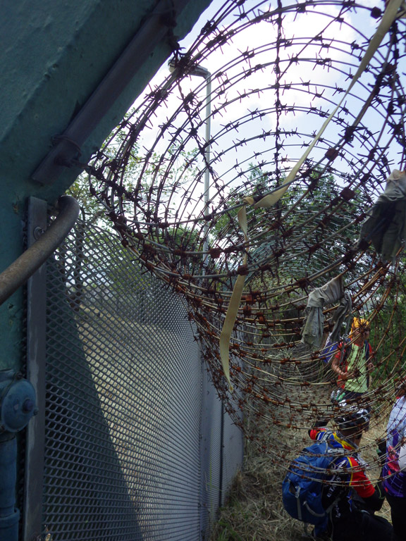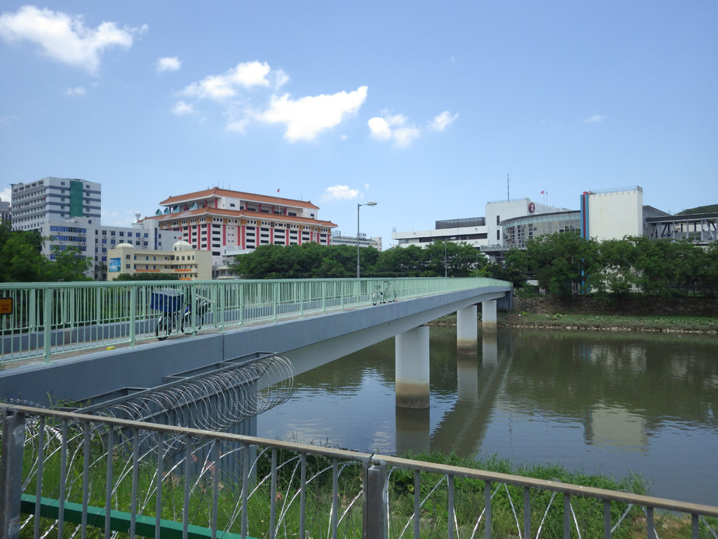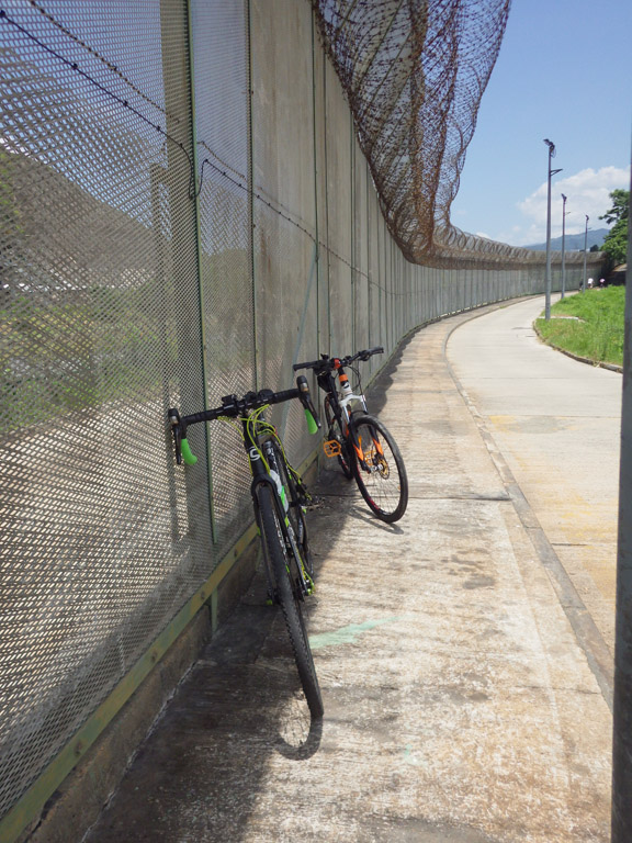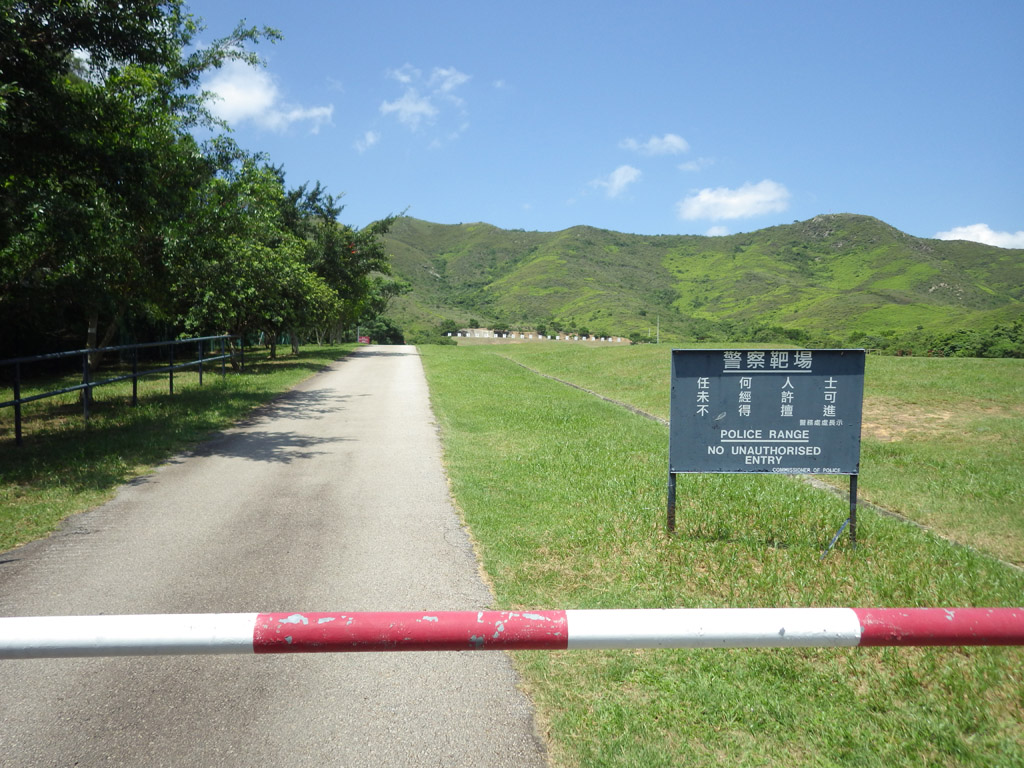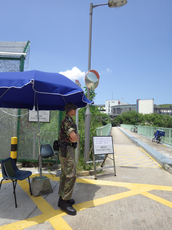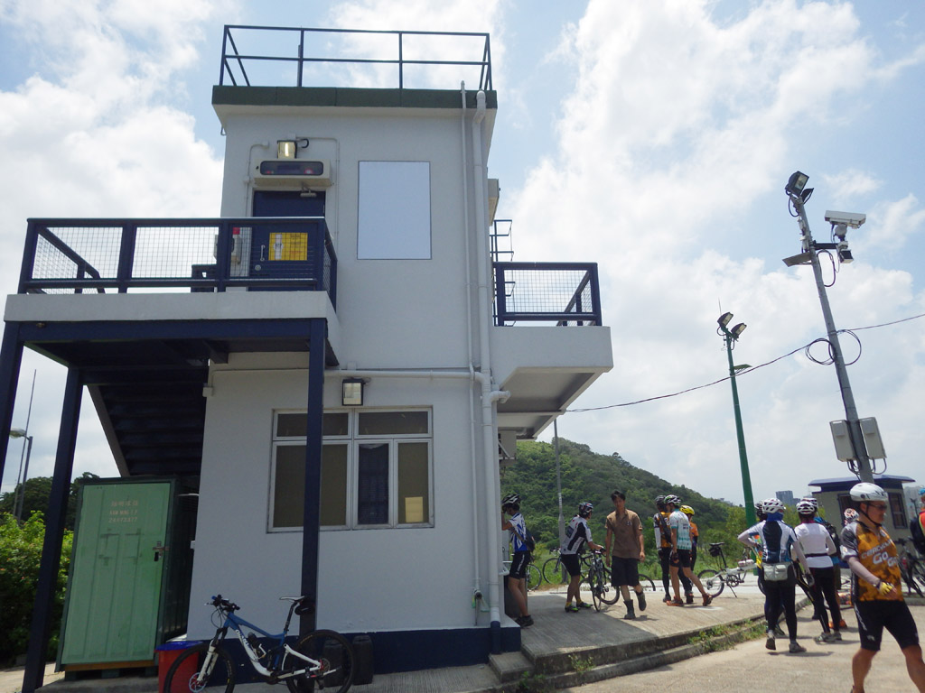 離開河上鄉我們一行二十多人便浩浩蕩蕩向開放了禁區進發。沿梧桐河踩了一段平坦的石屎路到盡頭便來到德月樓的禁區警崗前,等了一會駐守的警察便打開鐵閘讓我們進去,各人便急不及待走到警崗前拍照。警崗前的石橋是禁區,可通往羅湖火車站及深圳,我們沒有禁區紙,當然不能進去。接著便沿料壆路往料壆村,拍過大合照後就要準備踩一段大斜路上山丘到另一景點麥景陶碉堡。麥景陶是一九四六年來港任職的警務處處長,為了讓警員能在安全環境下監視深圳河對岸,堵截非法入境者和犯罪活動,便下令在邊境地帶的山丘上興建警崗及派警員駐守。由放外形特別,所以被稱為碉堡。在三十五度高溫下踩上斜路頗吃力,我們有些人也在半路放棄改為推車行。雖然辛苦,但上到山丘頂後盡賞深圳市沿海景色,便不覺甚麼了。
