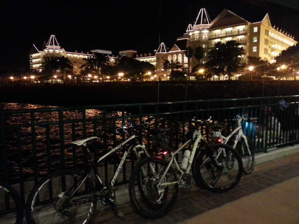 最近天氣炎熱,最適合踩夜車。今晚在東涌馬灣村天廚菜館吃完晚飯,七點半起步,由裕東路去翔東路,一直踩入迪士尼碼頭。晚上天氣很涼快,很多人在垂釣。剛好9點,迪士尼放煙花,但我們站在碼頭剛好被酒店阻擋了,偶而看到一點點。可能在售票處那邊會好看一些。看完後經陰澳沿海邊踩,再經翔東路返馬灣村咪錶停車場取車。