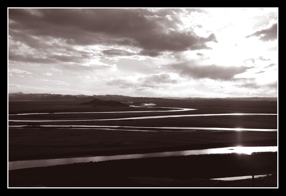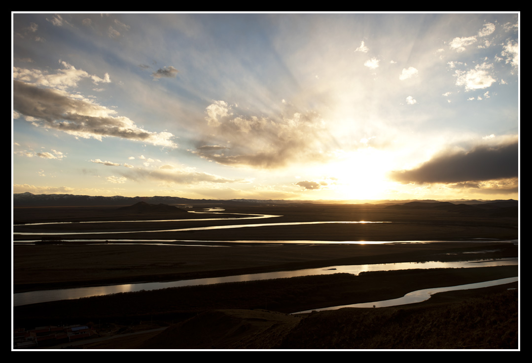 師傅叫我們不要在這裡逗留太久,因為之後還有更壯麗的景觀要在夕陽西下前去到。沿著這唯一的國道前進,不多久就到了去位於唐克鄉和瑪曲縣交界處的黃河九曲第一灣。為了欣賞到最美麗的時刻,我們開了GPS錶確定日落時間後,便把車停在再找一個小山丘上,是拍攝黃河九曲第一灣最好的位置。當我們準備下車,突然有兩個藏民走過說如把車停在這山丘上就要付”入場費”,否則就不能停車。我們覺得沒理由給他們,見還有個多小時才日落,便把車駛下去。這時還遇到了幾個從其他省份來自駕遊的男女,大家都在等待拍攝日落景色。師傅見和他們談得來,還把一直放在尾箱的反光板拿出來替我們拍人像照。一個小時很快地過去,大家趕快拿著相機登上小山丘,剛好太陽開始下山,向遠方望去,灣灣曲曲的S形黃河在夕陽下好像一條血紅色的絲帶劃過草原,美麗之極。夕陽一瞬間便落下,火紅的天空漸漸地變得暗淡,這是我看過最壯麗的日落,令我想起了”夕陽無限好,只是近黃昏”這句說話。