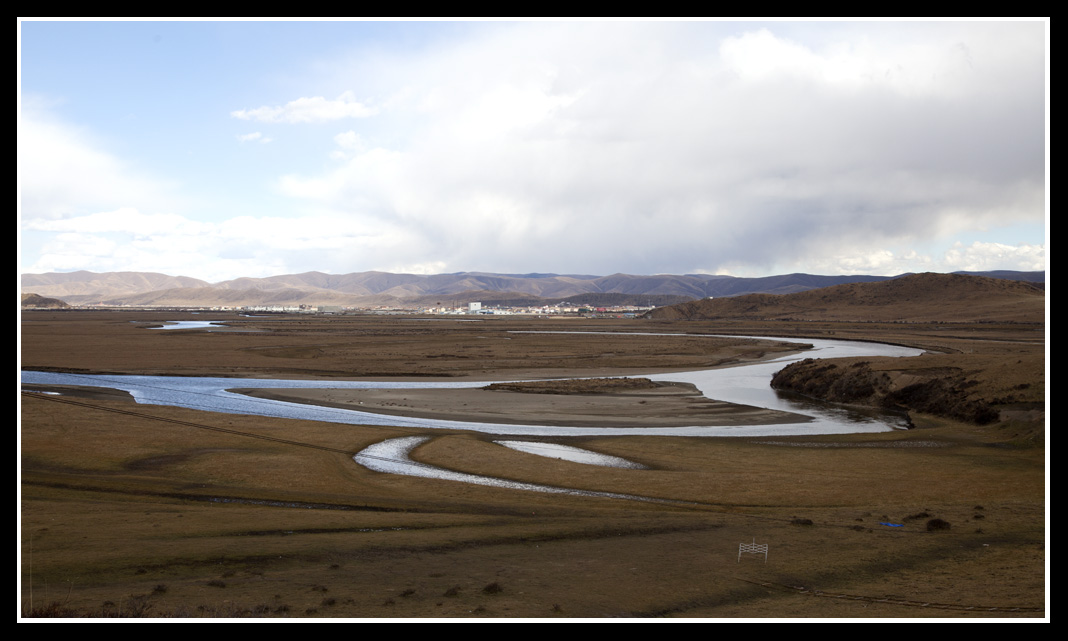 一些關於黃河九曲第一灣的資料:距離縣城61公里,是黃河與白河的匯合處。黃河從西南邊蜿蜒而來,源於紅原縣的白河在這裡匯入黃河,河面寬闊起來,河水分割出無數沙洲和小島。河畔有一座屬藏傳佛教格魯派寺院-索格藏寺,是看黃河九曲第一灣的最好地點,可惜我們沒有時間參觀。