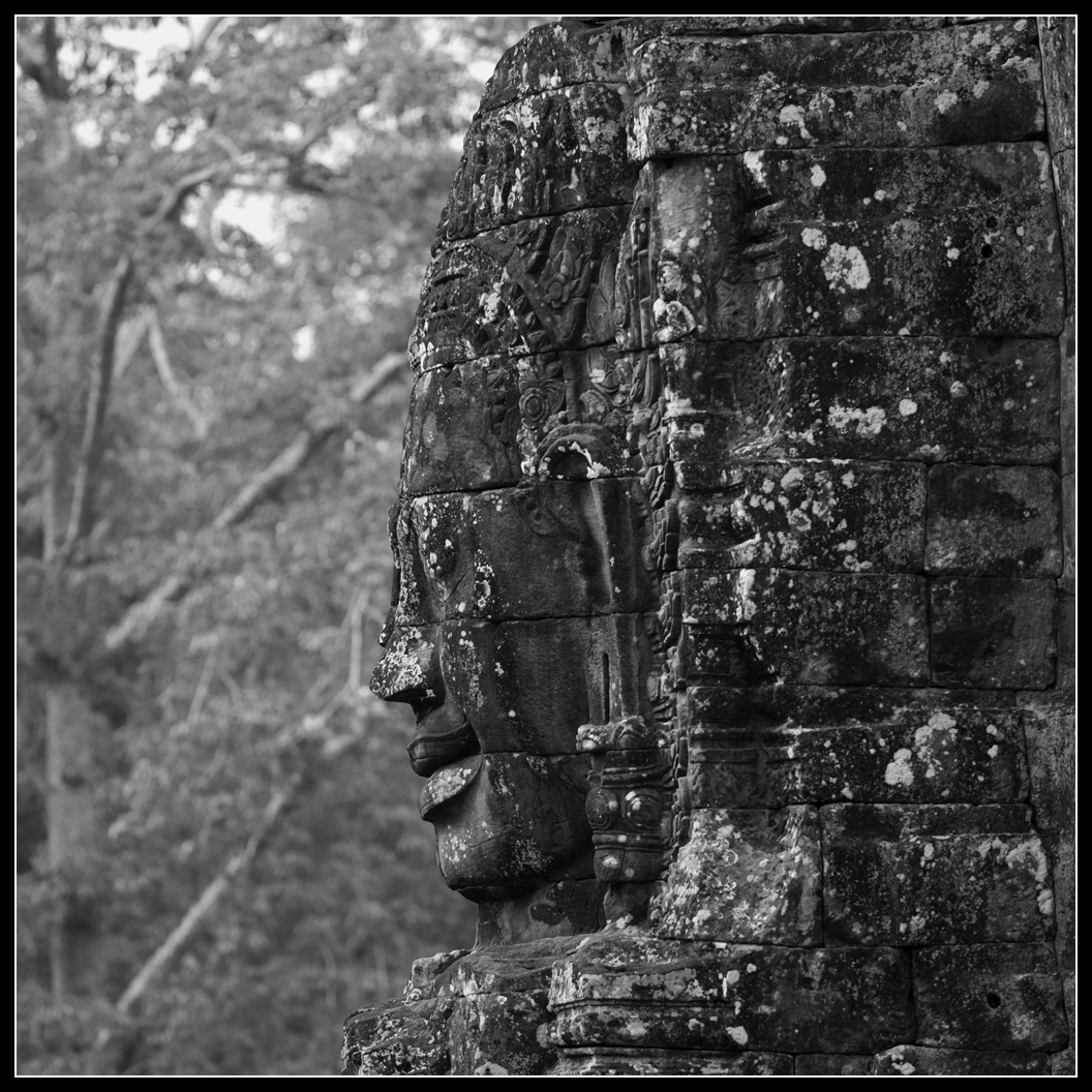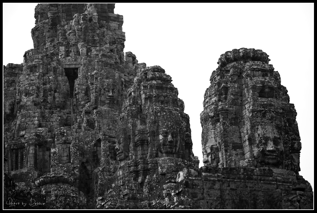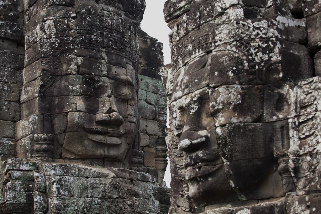 看完浮雕和壁畫,走上最頂層就可以看見佛塔上的笑面,每一座塔上四面都刻上巨型佛面,而每一個佛面的表情都略有不同,閉眼沈思或是微笑(高棉的微笑),看起來很慈祥,頓時令人覺得心境平靜。