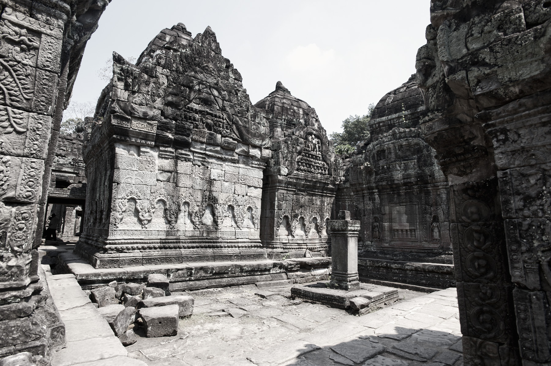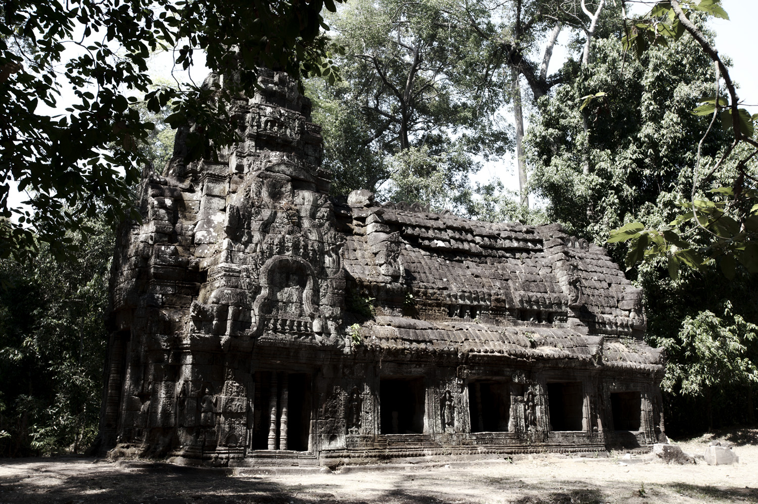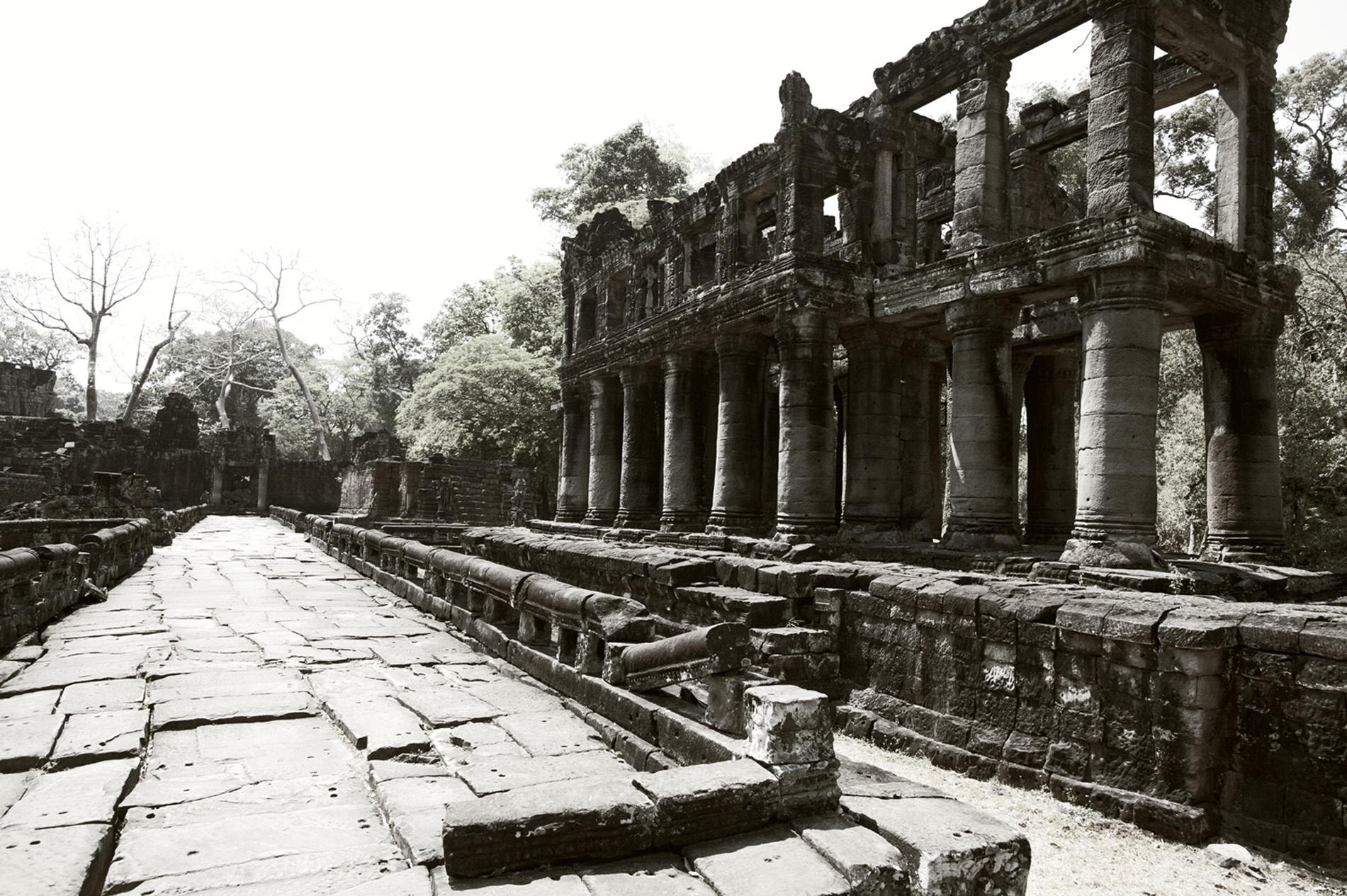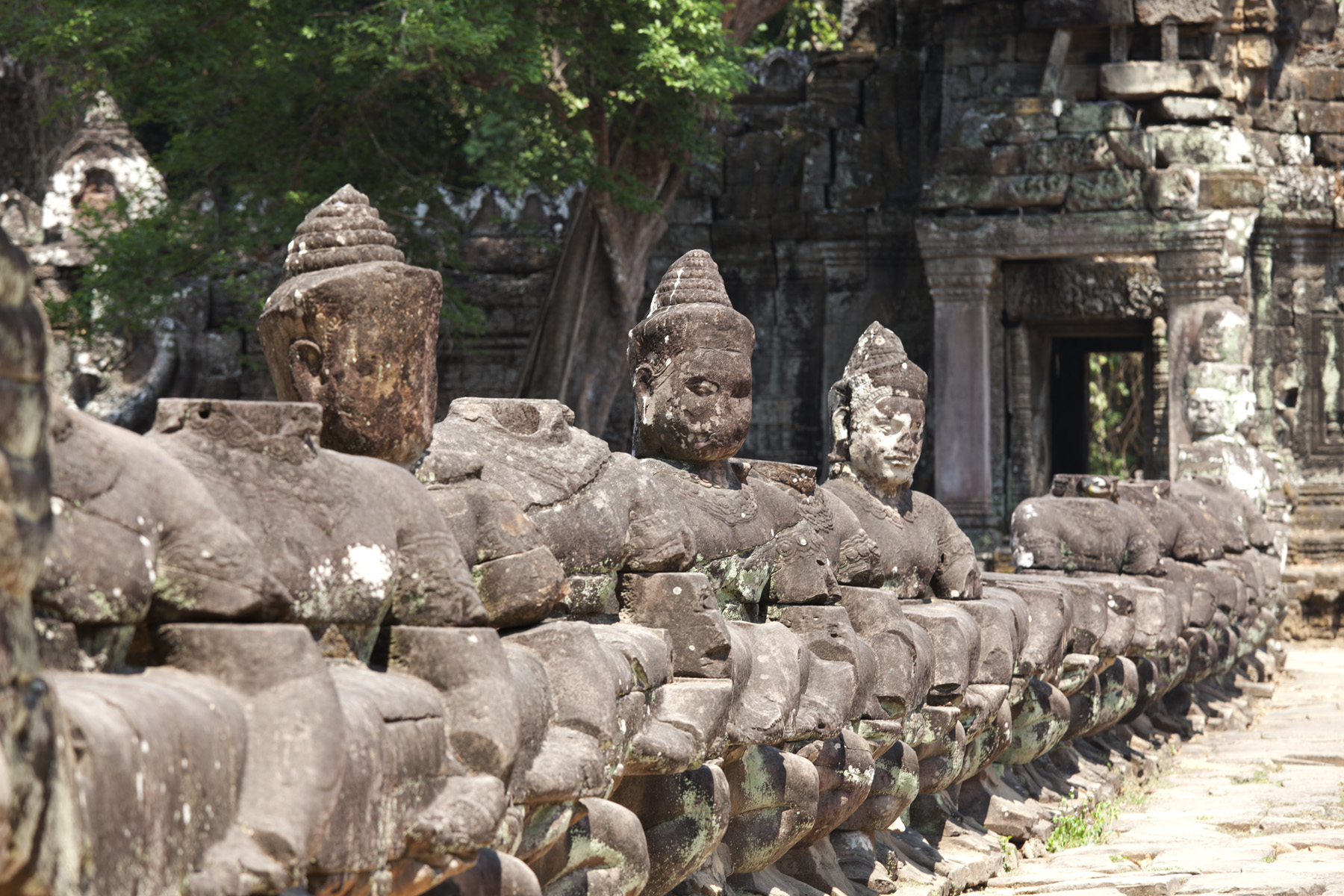 聖劍寺或叫聖劍寺,最初是一座佛教廟宇,但後來被用來祭祀印度教的濕婆神和毘濕奴,在神廟的西側和北側建了神殿。至於南側Jayavarman VII就用來祭祀自己的父親,因此也稱為父廟。我們從東門進入聖劍寺,經過一條長長的大道,兩旁是攪拌乳海的阿修羅和天神的石雕,但許多雕像已沒有頭部,身體也斷裂不完整。聖劍寺佔地遼闊,格局對稱,外圍有城牆環繞,彷如迷宮一般。寺內石壁、柱子、屋簷都雕有佛像、仙女、花紋、神獸等,可以慢慢欣賞。而最引人入勝的地方就是那一眼望不見盡頭的走廊,數之不盡的門框。