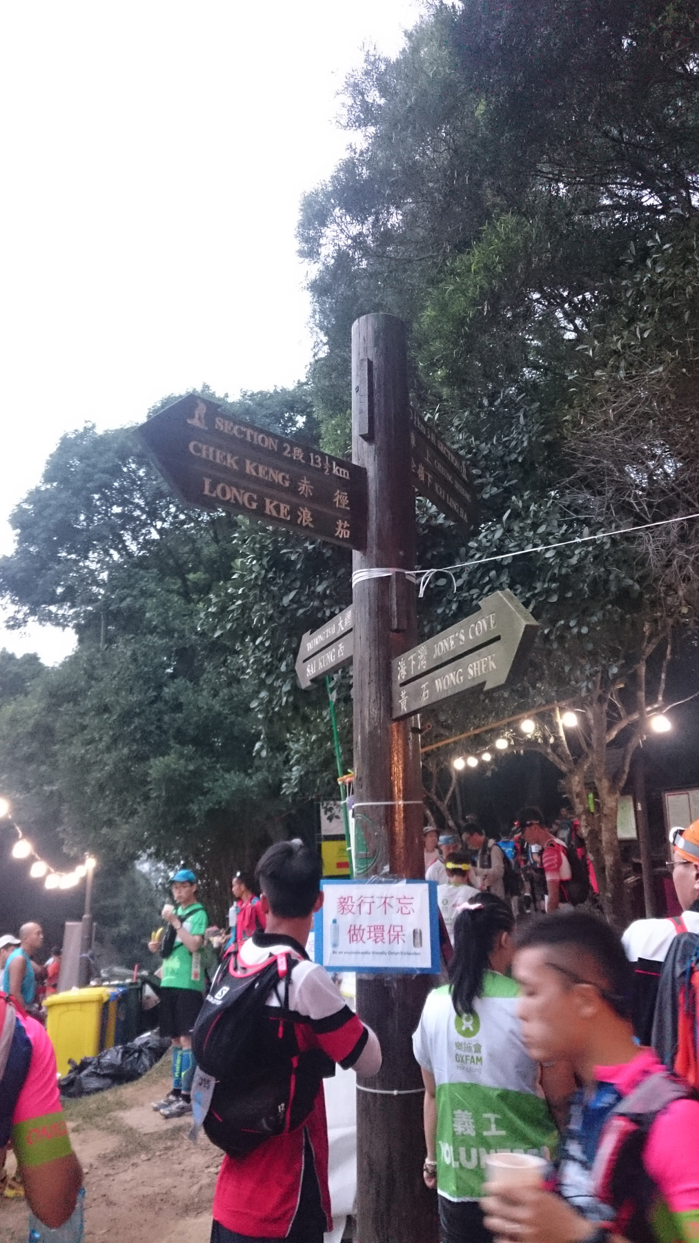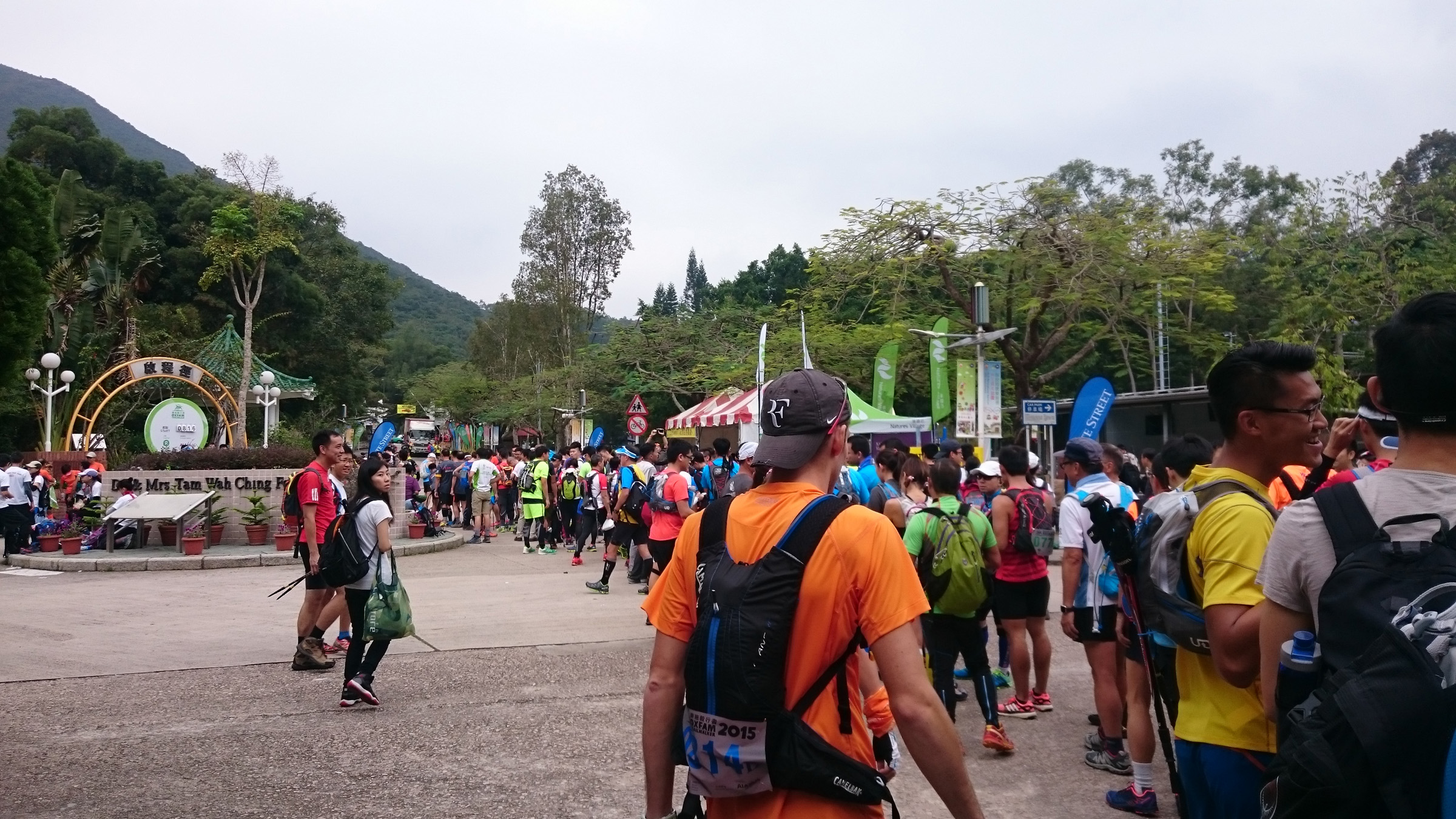 我們出發時間是12:30,起床後還可吃一個豐富的早餐。為免太趕時間,我們乘的士直接去北潭涌,會合隊友登記後便排隊影相,因為太多人,影完已是12:35,急忙跑去起點出發。大家事前已有共識,用快行又舒服的步速去完成頭兩段至北潭坳。下午的天氣預頗熱,濕度又高,太陽也一直照著我們,水也比平常喝得多。大會的水站水源供應充足,在西灣還預備了檸檬為參賽者解渴,十分貼心。大家一直保持適當的步速,在預期時間內到達水浪窩,支援隊已在這裏守候。我們停留了20分鐘食晚飯和換衫,又繼續前進。麥4比較長,後段也有些悶,幸好得到支援我和老公的朋友陪行,又可準時到達基維爾營。