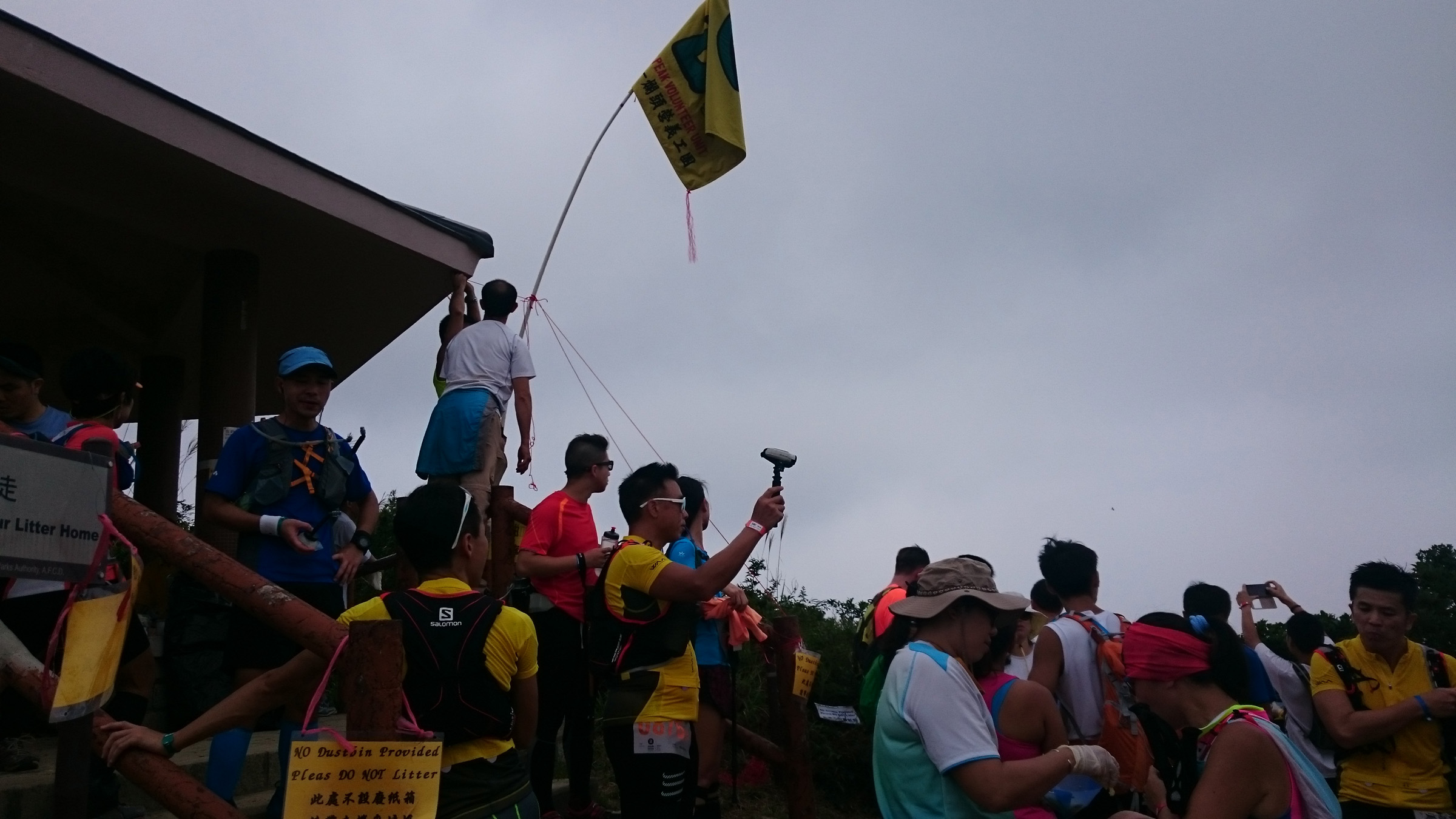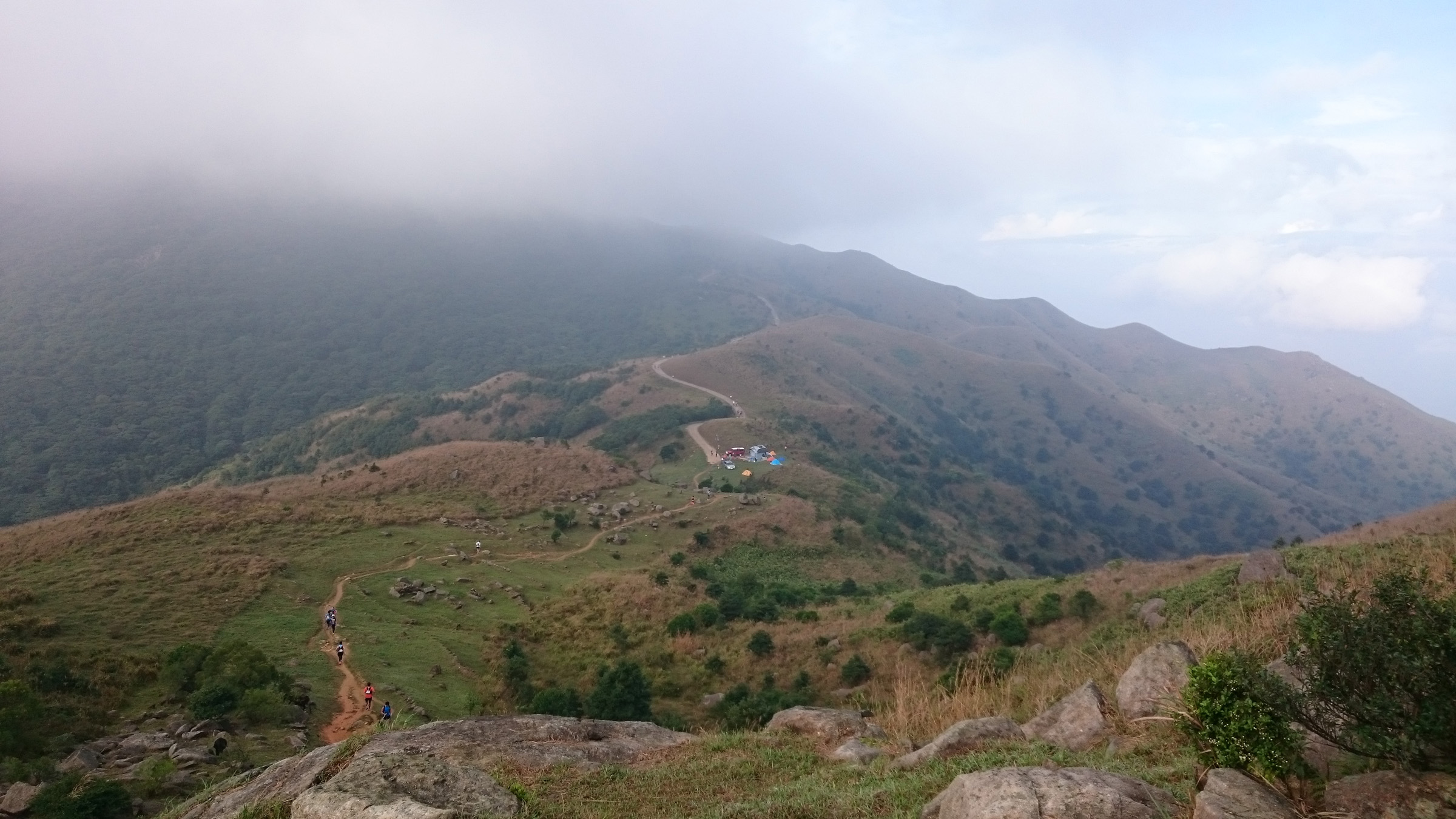 CP7有杯麵熱飲供應,趁著有點時間喝一杯熱茶提提神也不錯。來到鉛鑛坳已代表我們差不多完成最辛苦的路段,只剩下最後一座大帽山。沿著梯級一直上,終於完成上級路段,視野變得開揚,但空氣潮濕有霧,視野也變得模糊,滿山頭的芒草也沾上了露水。過了四方亭後又繼續上山,這段石屎路上斜很辛苦,也是時候用Z Pole,全靠它才可輕鬆到白波。