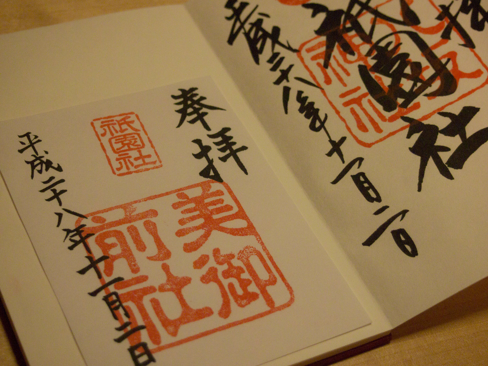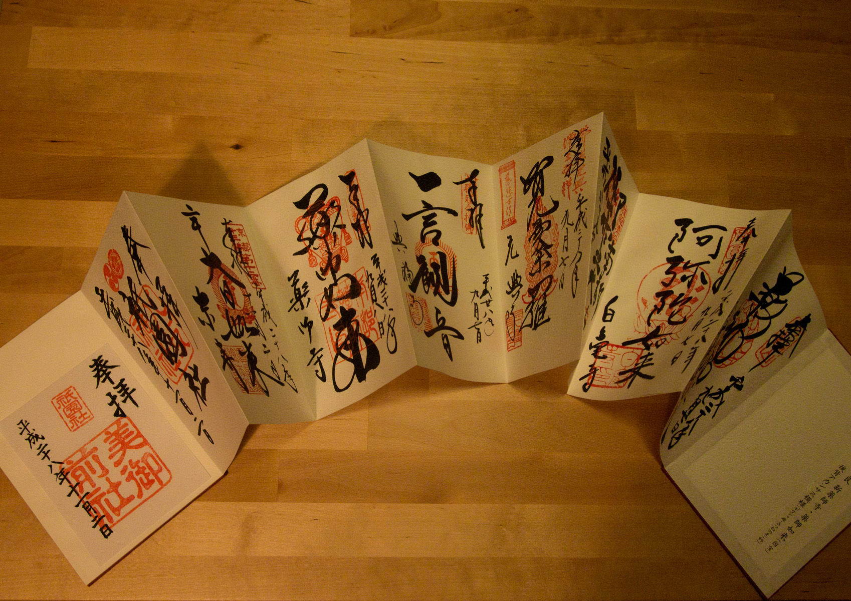 一向到神社都會帶御朱印帖,在日本神社參拜後的紀念,附上300 yen委託神社的神職人員寫,用朱砂蓋上社章,寫上神社名稱、地點和參拜日期,很有紀念價值。御朱印帖可在神社或書店買到,不能隨便拿一本薄來做御朱印帖。大部分神社都是即時在你面前寫上御朱印和蓋印,如不想等,可把帖留在御朱印所,先附錢然後在參拜完再回來取。每間神社都有幾款御朱印,可以選自己喜歡的。有些神社已預先把御朱製印寫好在紙上,不會即時為你寫在帖上,自己拿回家再貼上。