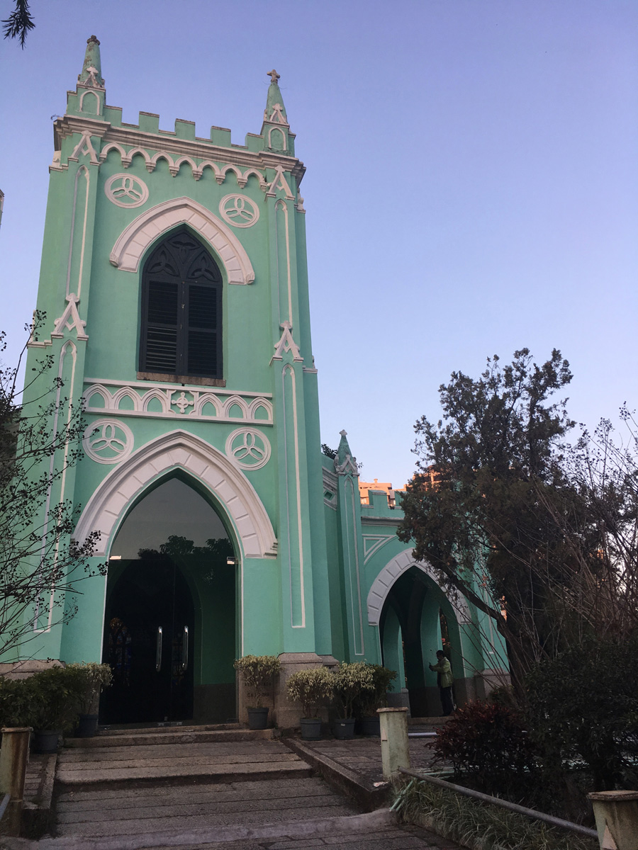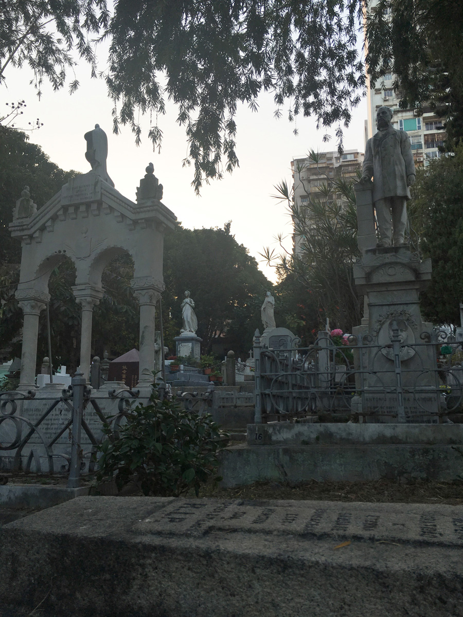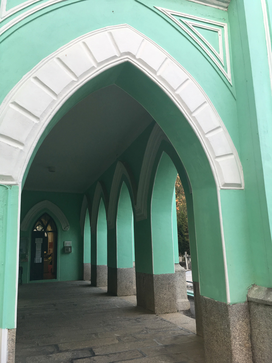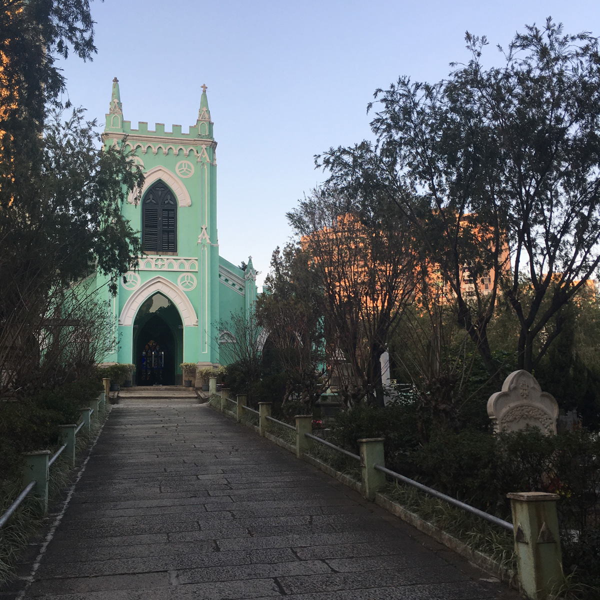 再往前走見到一列蘋果緑色和白色的牆,入面有一間小教堂,就到了西洋墳場。這裡不但沒恐怖、冷清及陰森的氣氛,墓園環境幽靜,每一個墓碑都是精心設計,揉合了中西風格,墓園更加像藝術館。園內還有一座小教堂 – 聖彌額爾小堂,當我們來到時已關門,未能入內參觀。