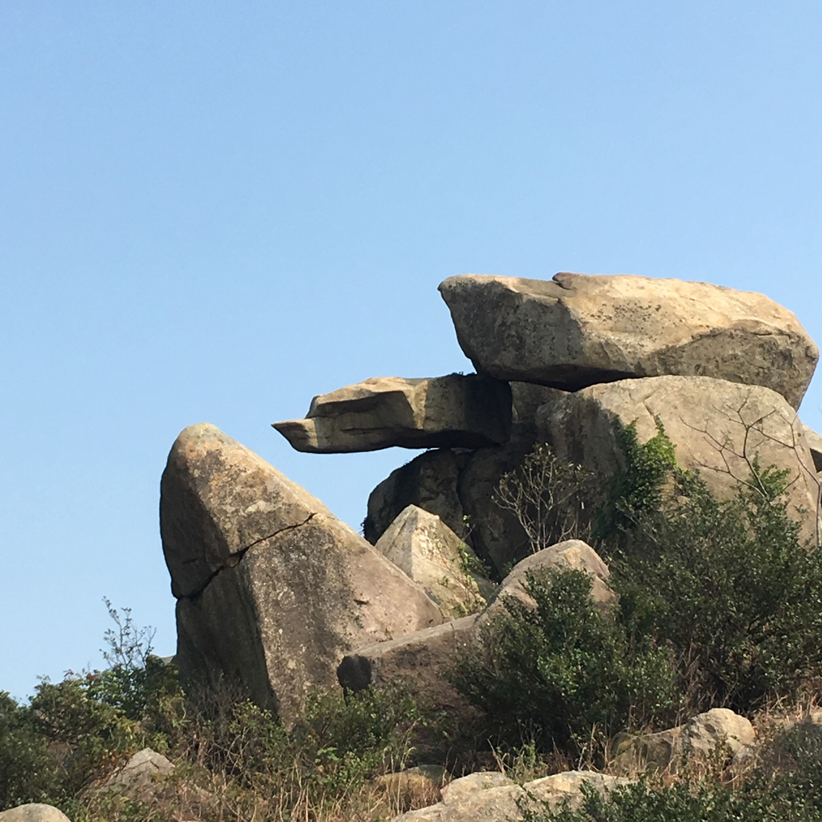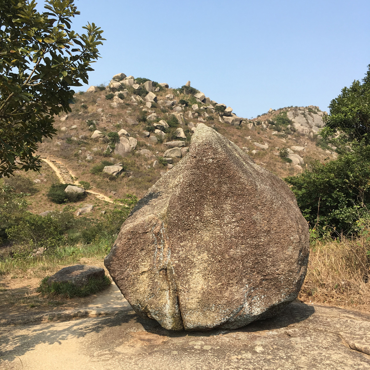 很快便到白芒,我們沒有入村,繼續往牛牯塱和梅窩方向行。走了一段上斜的石屎路到達分义口。直去往梅窩,我們轉向老虎頭郊遊徑方向,開始是泥路,不斷上山,偶爾比較平緩,然後又再上山,經過了一個怪石區之後不久終於到達老虎頭。今日天朗氣清,看到了美麗風景。小休拍照後便開始向愉景灣方向落山,這段落山的路頗難行,有很多外國人從愉景灣行上來,已上氣不接下氣。到愉景灣前接回石屎路,再下一段梯級就到了近碼頭的住宅區。