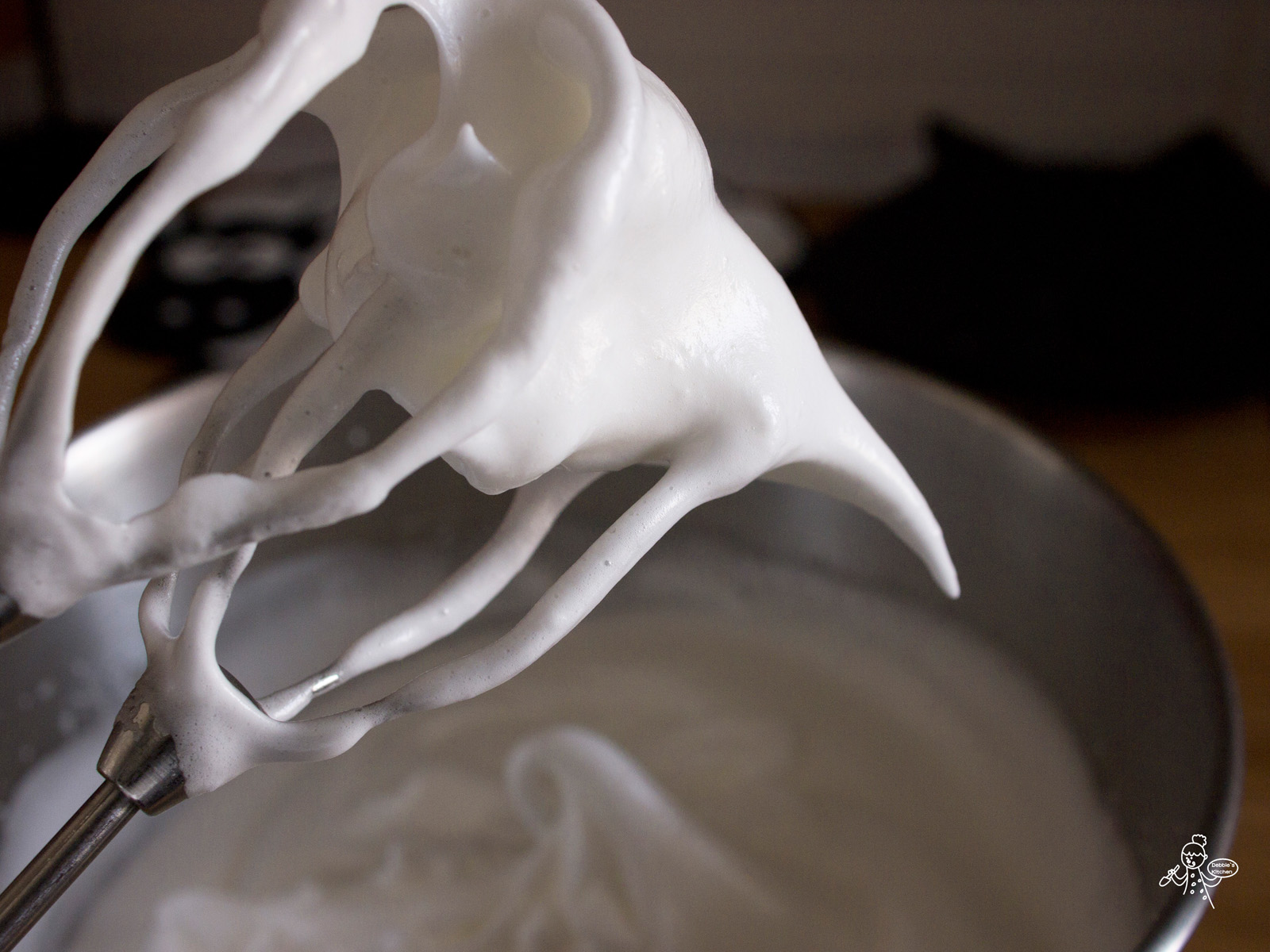 - Whisk egg whites on high speed until soft peaks form. Gradually add 50g sugar and continue whisking until still peaks form.