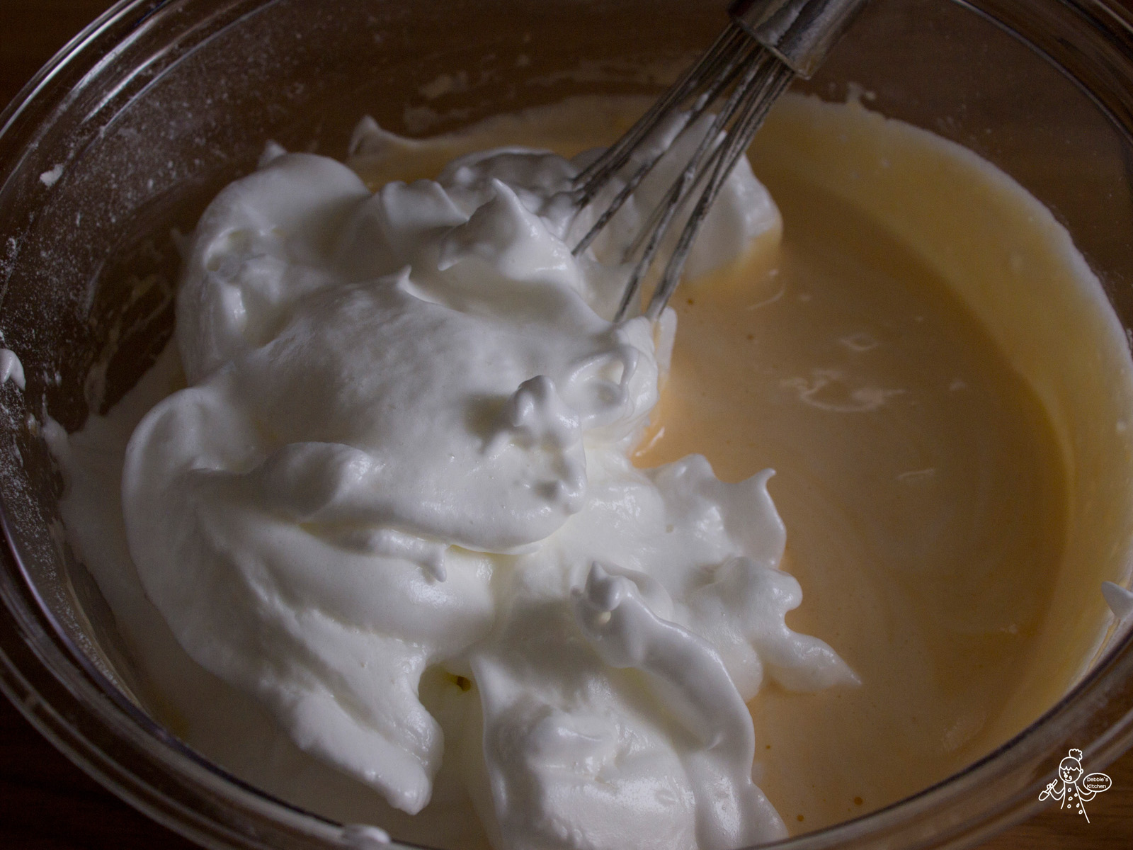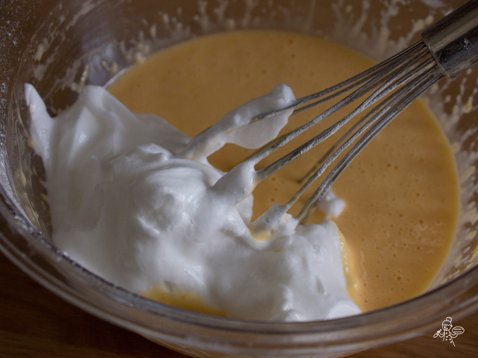 - Using a rubber spatula, fold a quarter of the egg whites into the batter until evenly incorporated. Then gently fold in the remaining egg whites until just combined.