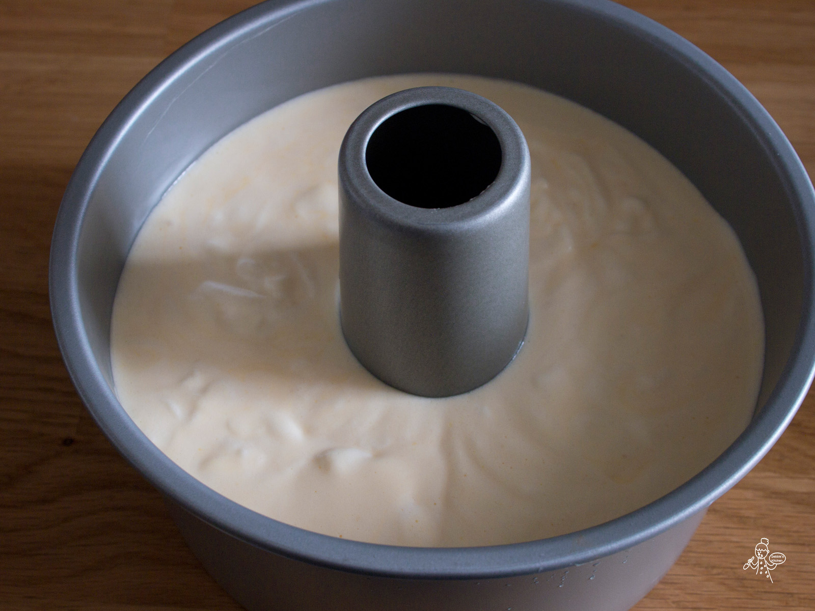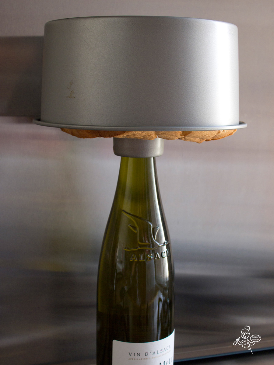 - Remove the cake from the oven, let it cool upside down by inserting a bottle to the tin hole.