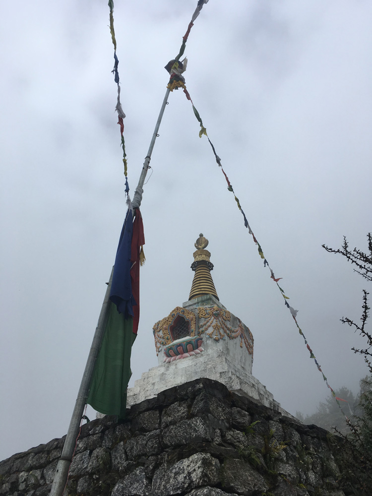 離開Hotel Namche我們踏上和昨天side trek一樣的石板路,直到Tengboche和Khumjung的路口。今天下著毛毛雨,石板路很濕滑,我們都慢慢拾級而上,之後連接泥路,行了約一個小時經過一個白色佛塔,塔的四週掛了五色彩旗,上面寫滿經文。這時天氣也好轉,可以看到Mt Everest。我們和其他登山者都停下來休息,收好雨衣和fleece jacket,然後再繼續。