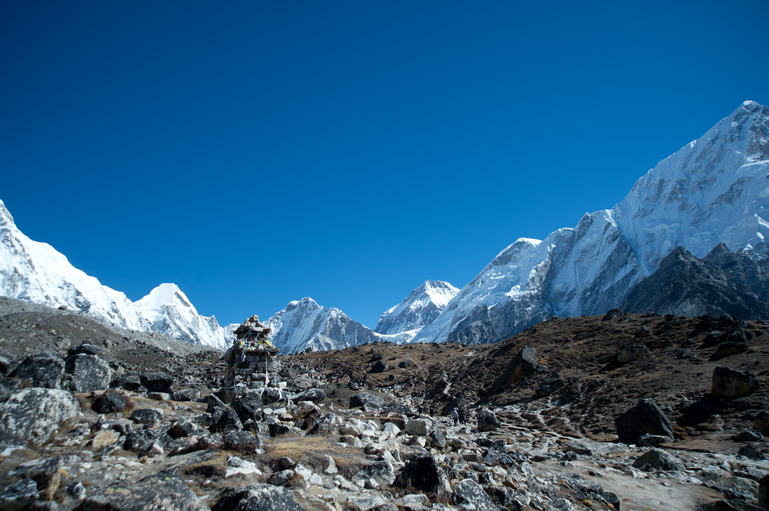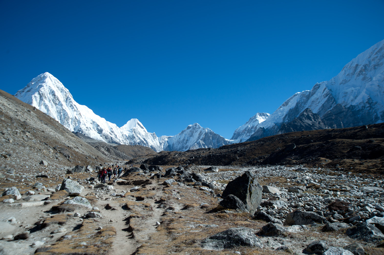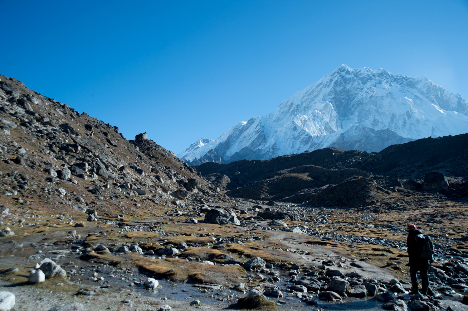 高海拔的清晨下陽光特別耀眼,天藍得一片雲也沒有,我們就在明媚陽光下離開Lobuche。今天上午去Gorakshep的距離只得5KM,比任何一天走的路少,但這5KM絕不簡單,因為我們是在海拔五千米上升二百多米,所走的每一步都比低海拔辛苦。加上由Lobuche開始沿著Khumbu glacier行,路上已沒有任何植物,只得石頭和塵土,偶爾會看到一些小水洼,上面被冰塊蓋住。