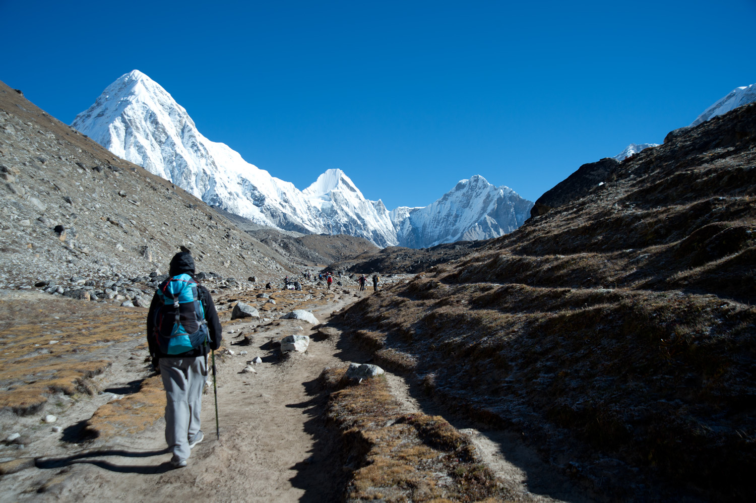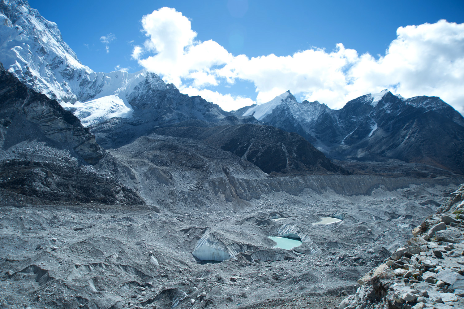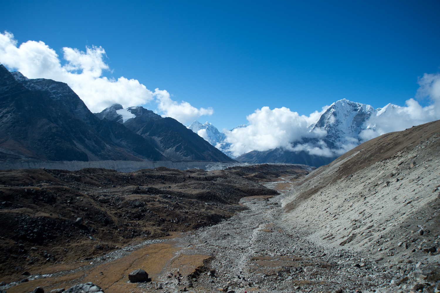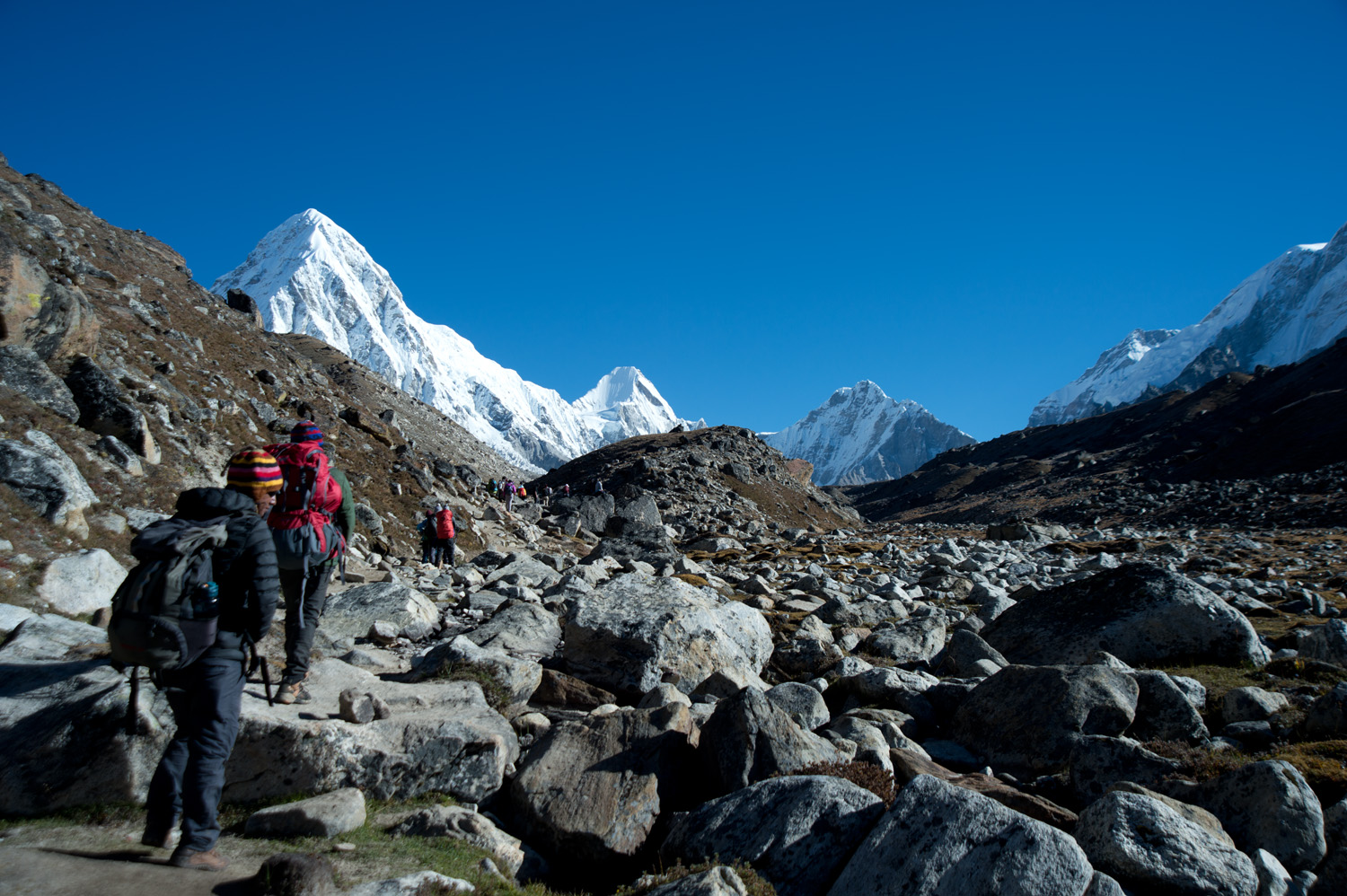 高海拔的清晨下陽光特別耀眼,天藍得一片雲也沒有,我們就在明媚陽光下離開Lobuche。今天上午去Gorakshep的距離只得5KM,比任何一天走的路少,但這5KM絕不簡單,因為我們是在海拔五千米上升二百多米,所走的每一步都比低海拔辛苦。加上由Lobuche開始沿著Khumbu glacier行,路上已沒有任何植物,只得石頭和塵土,偶爾會看到一些小水洼,上面被冰塊蓋住。