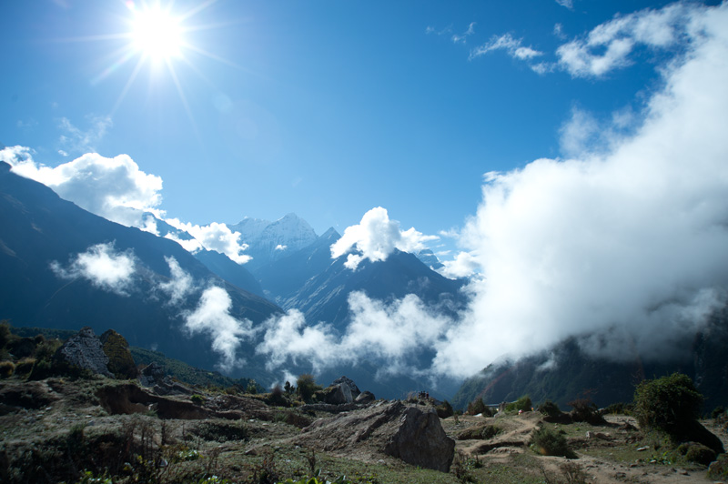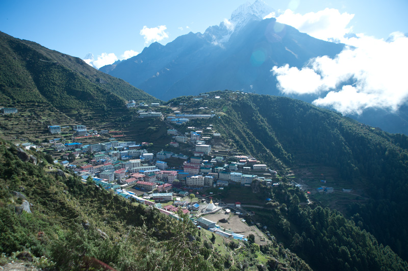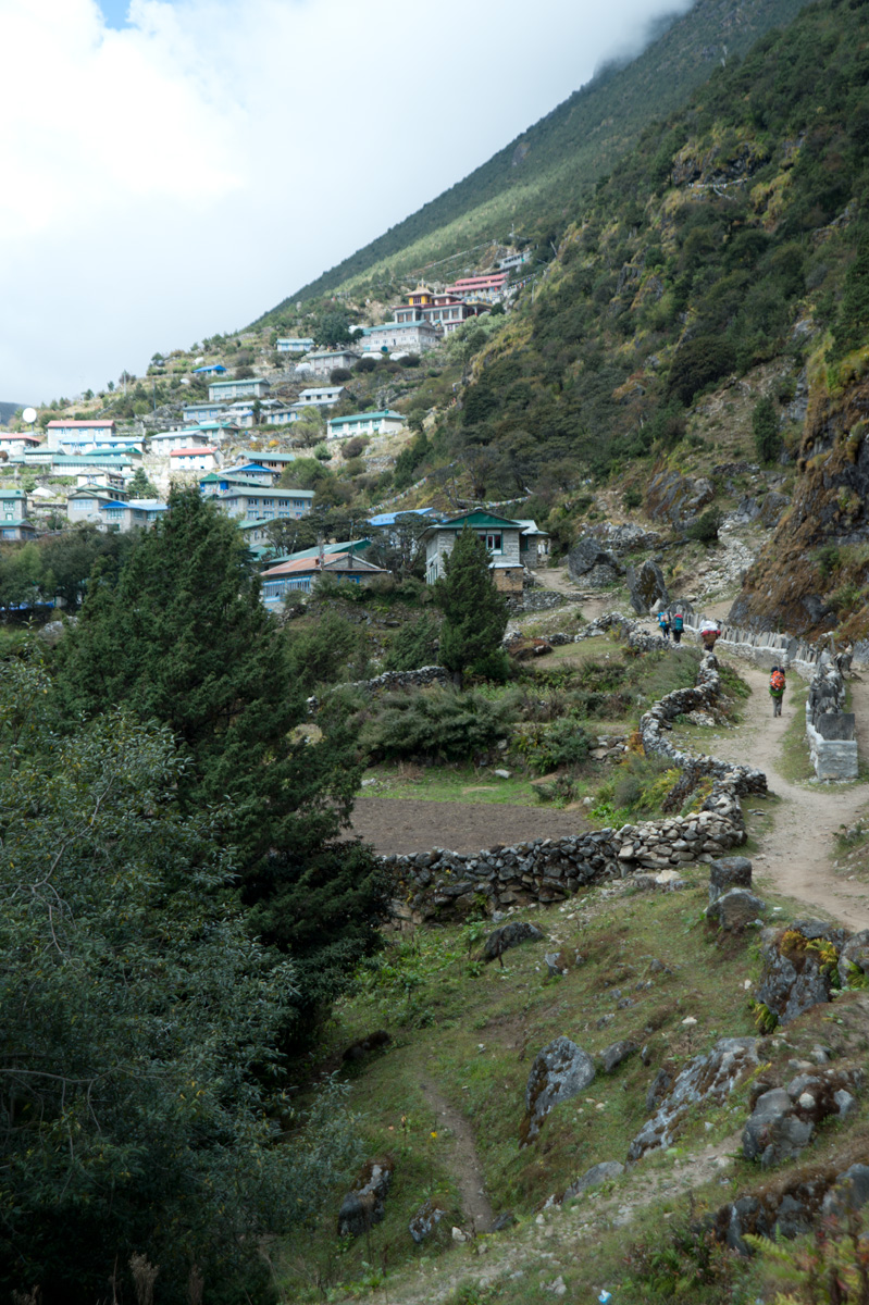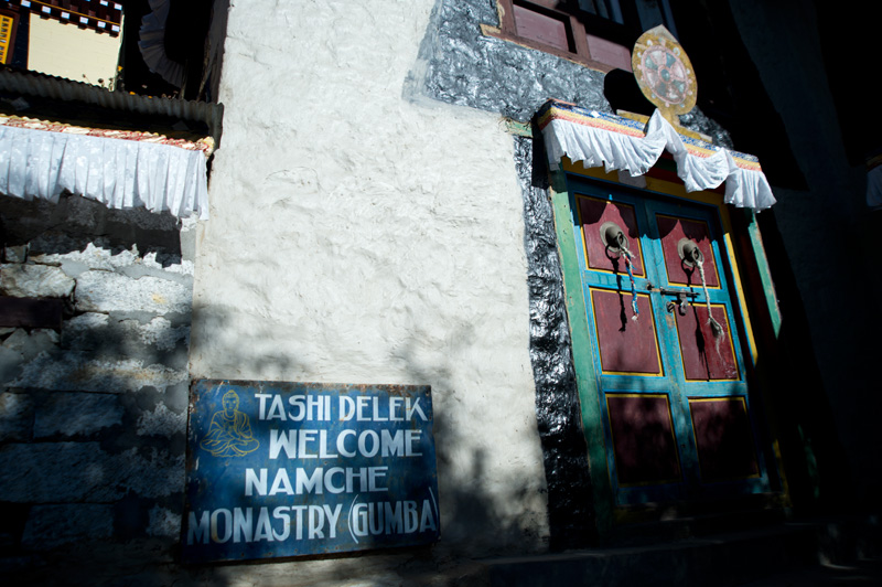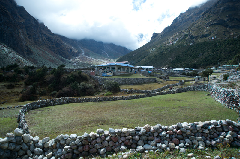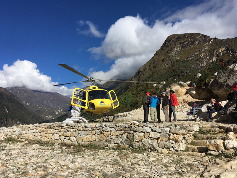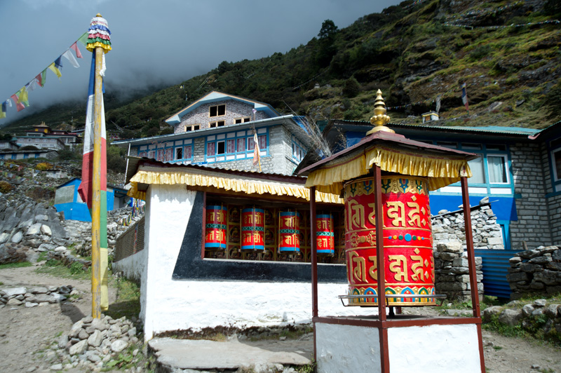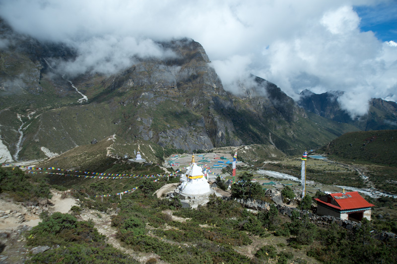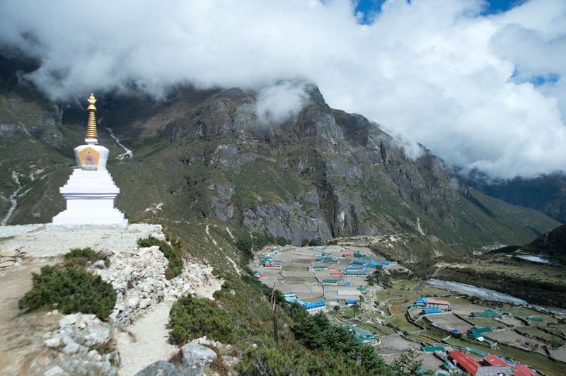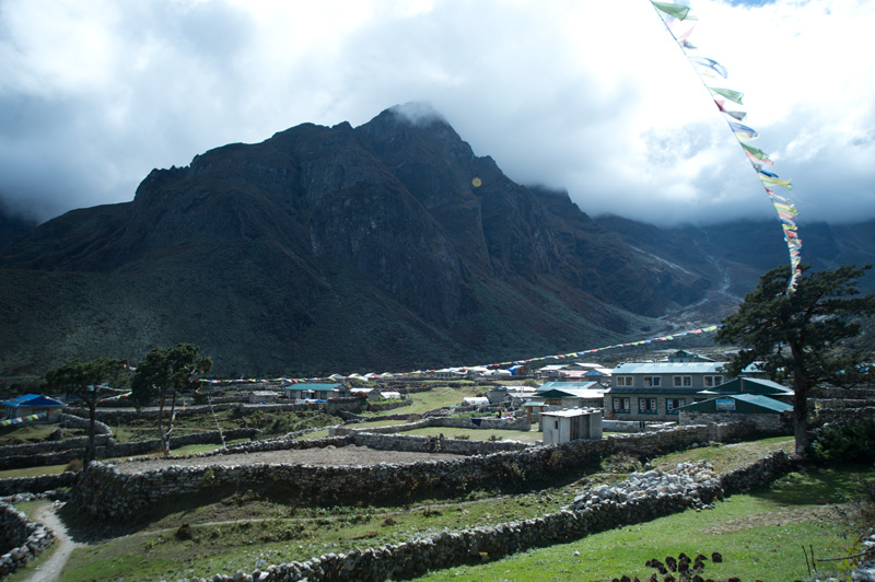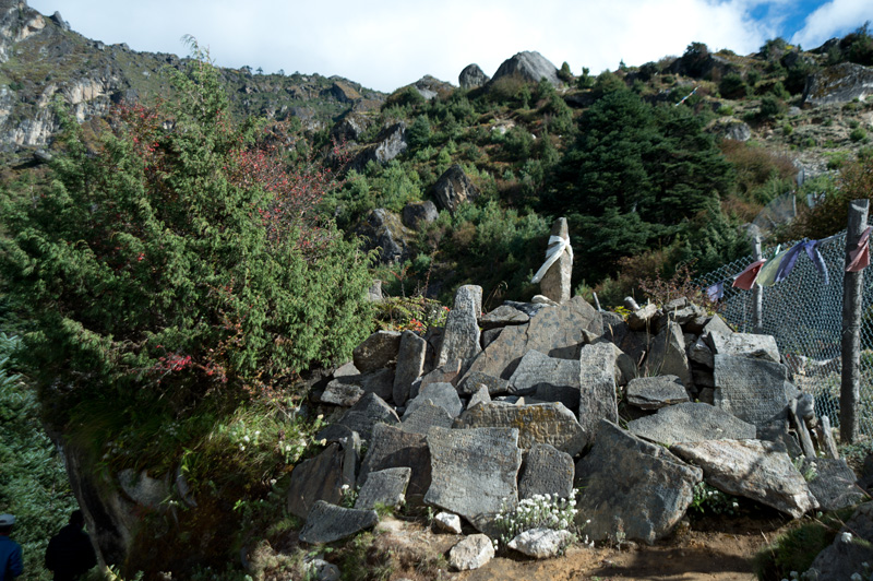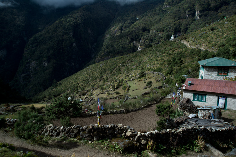 今早的Namche Bazaar不像一個多星期前那麼濕冷,一早起來已有陽光,看到這種天氣心情份外興奮。由tea house出發,經過Namche Gompa,內有很多壁畫,也有一個很舒服的庭園。過了Gompa 是上山的路,沿著山邊的trail走可以看到整個山谷,背景就是Ama Dablam。經過很多刻有經文的大石後,終於來到分支路,這裡有一個直升機停機坪 Shyangboche,剛好有直升機降落。
