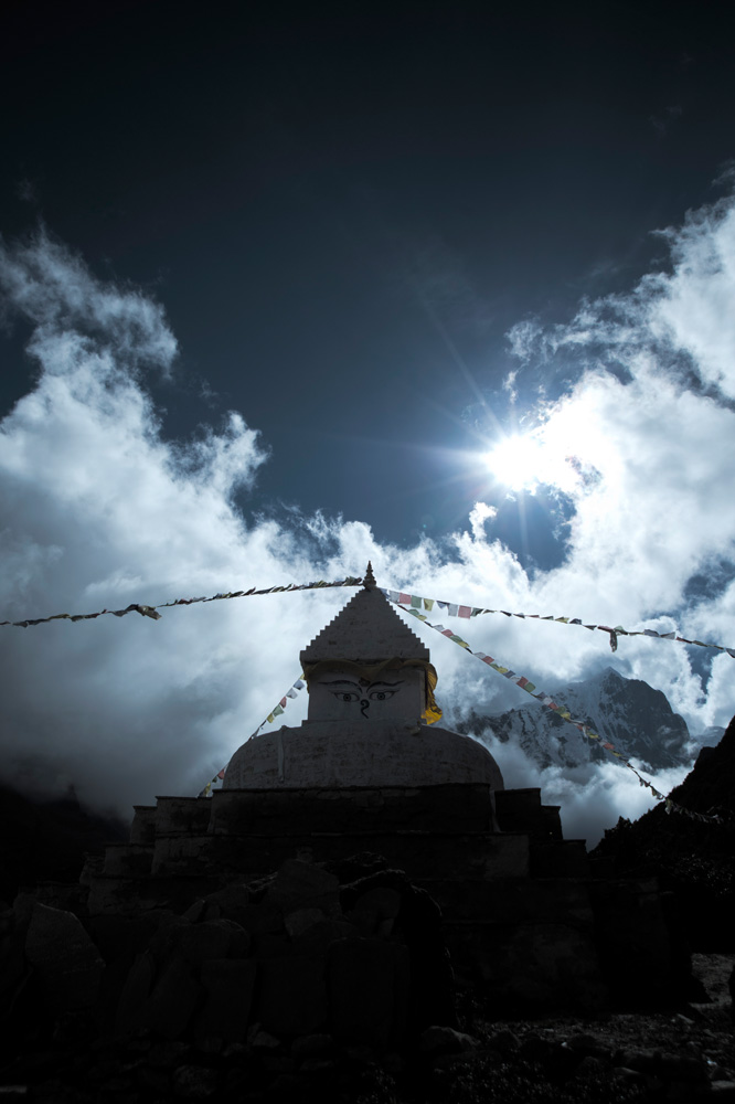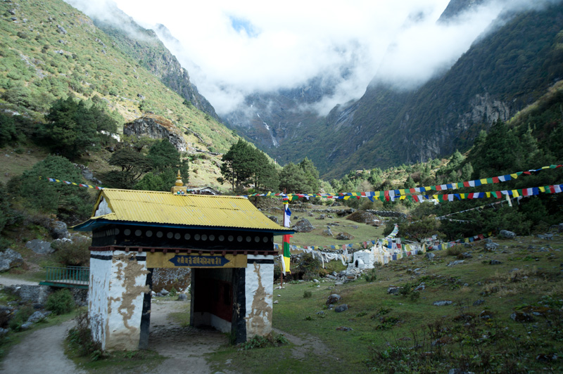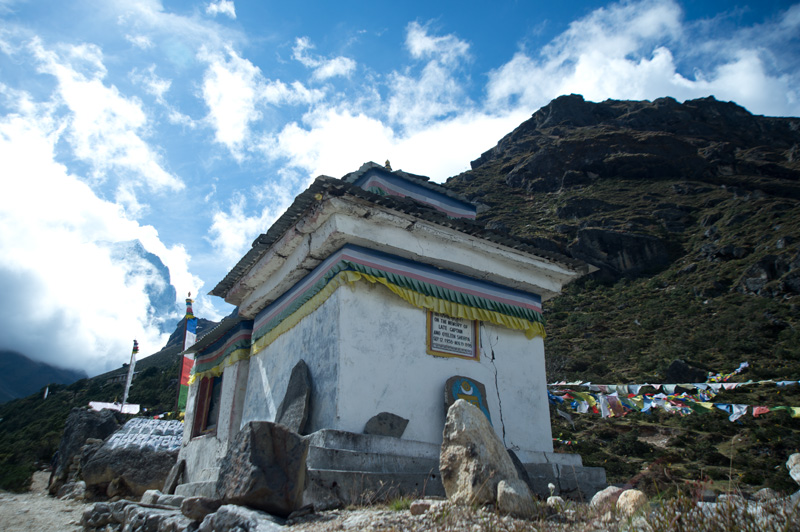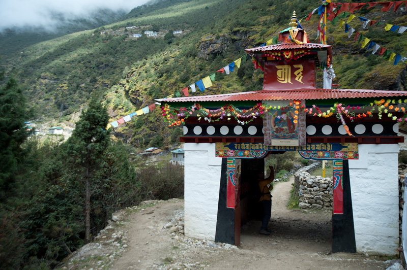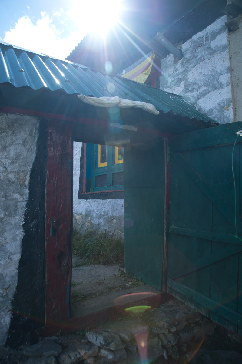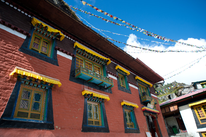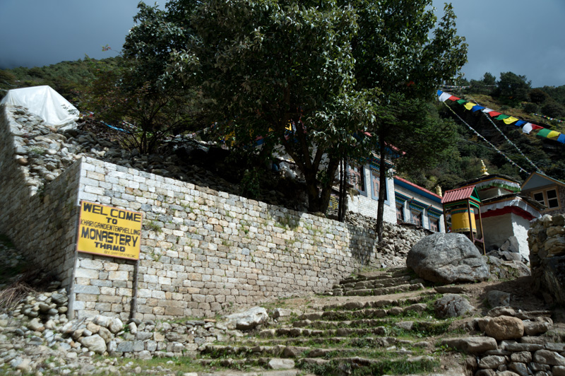 Thame Gompa在山坡上,去Sunder Peak的路在寺廟右邊。沿著路行上去,可以望見Thame valley和冰川。沿著路上去,也會看到上去寺廟的喇嘛。寺廟在山頂上,外牆髹上鮮豔的橙紅色,屋頂掛滿彩旗。一位年青的喇嘛開門給我們入內參觀。