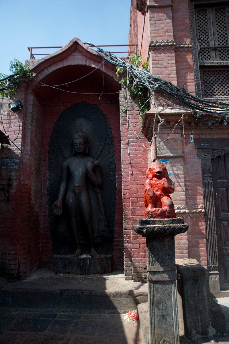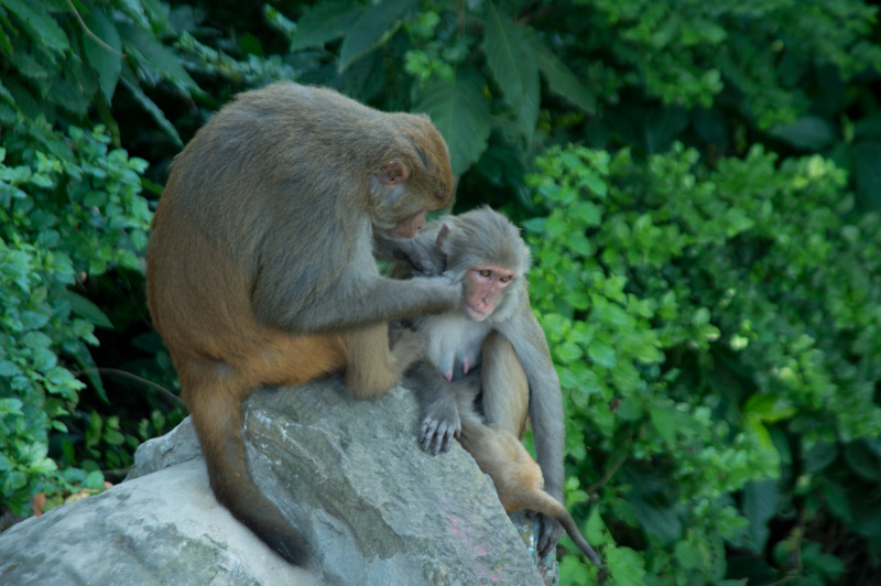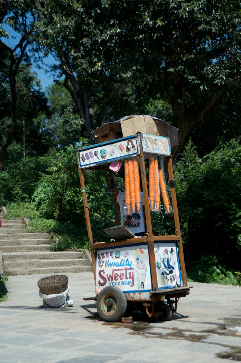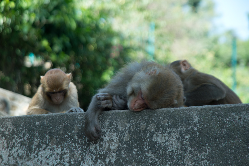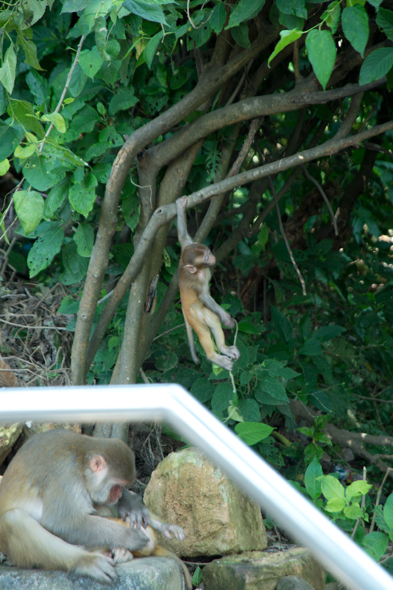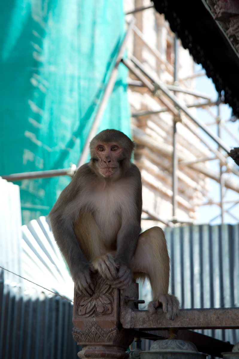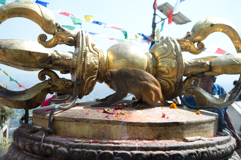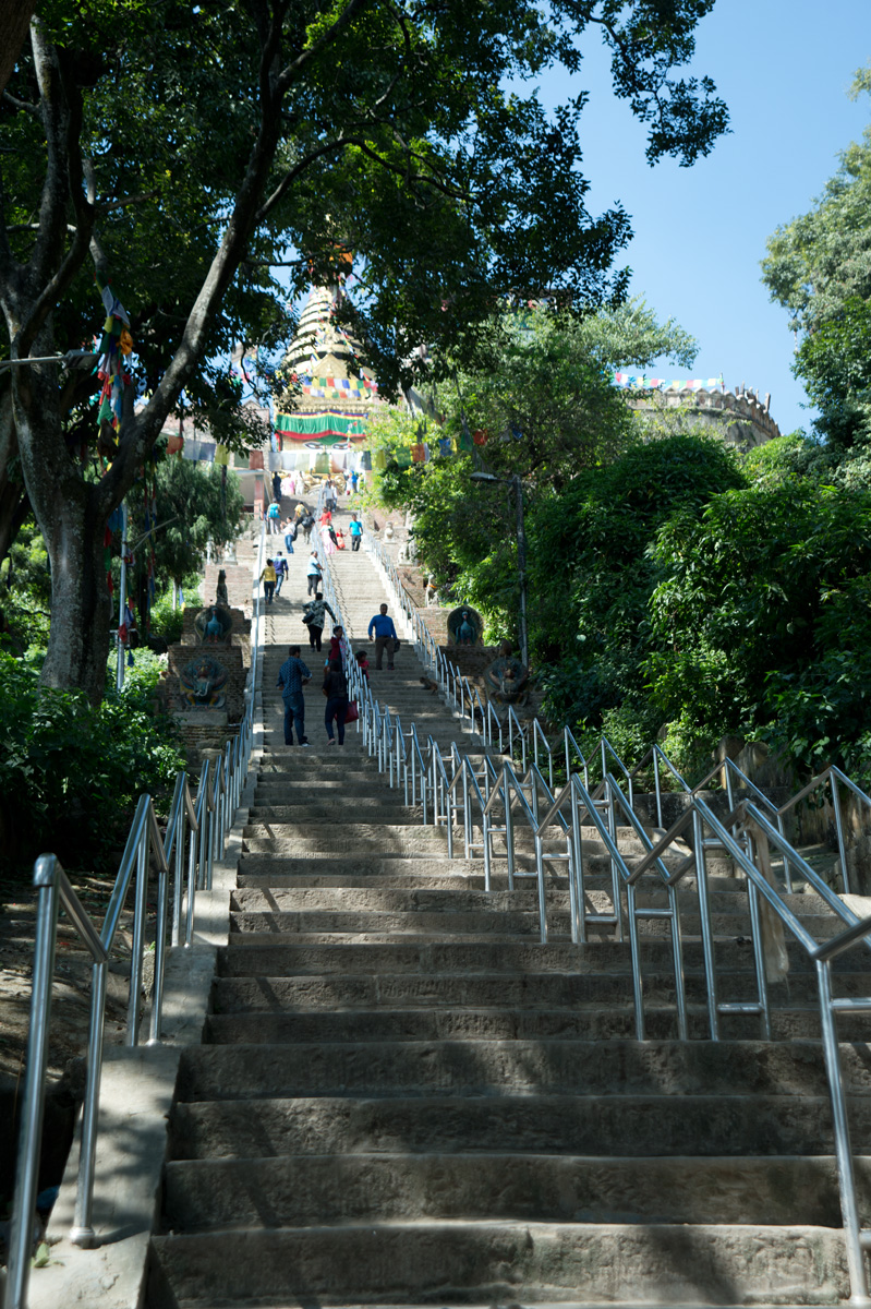 我們從Thamel的酒店行來,沿途順道逛逛市集,不一會便到了。到猴廟少一點體力也不行,因為需要走上三百多級樓梯才到達佛塔。樓梯兩旁有不少佛像,也有售賣手工藝品、石頭、串珠的小攤檔,當然還有這的住客猴子。這的猴子很友善,也許住在廟內,牠們都比較溫和,不會欺負遊客,我們還看到小子開始學習爬樹,不一會已可以由一棵樹跳到另一棵,十分調皮。