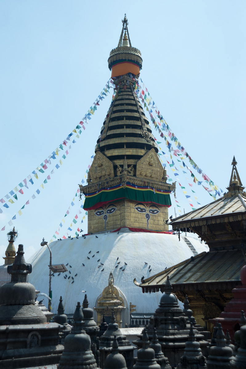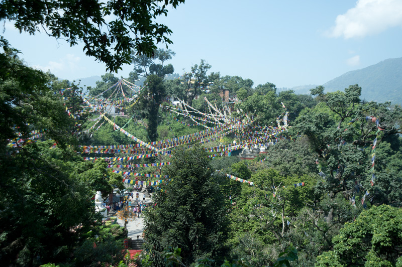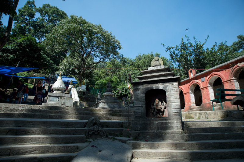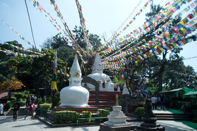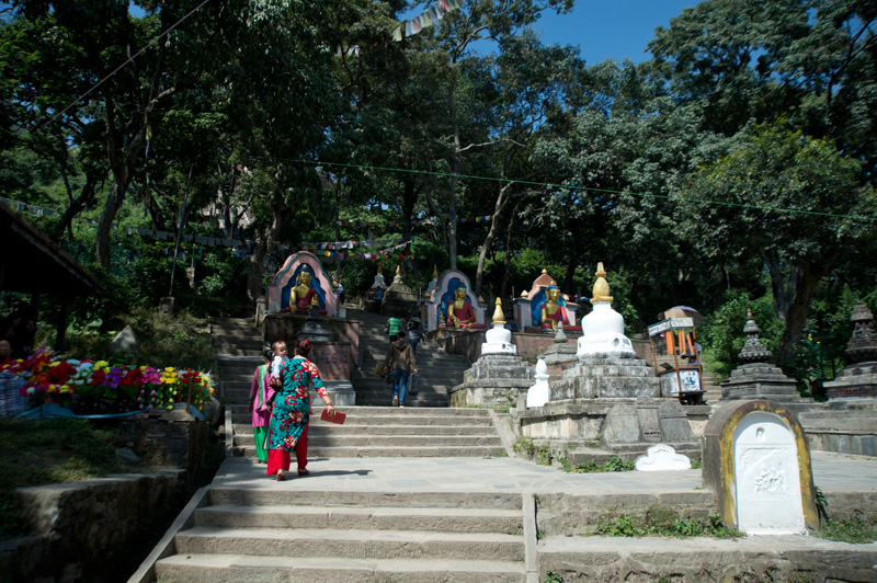 位於加德滿都市區以西約 3 公里外的一座山丘上有一座建於5世紀的寺廟,融合了印度教和佛教,是佛教徒一個重要朝聖地。寺廟附近時常有大群子聚集,以廟為家,所以又稱猴廟。