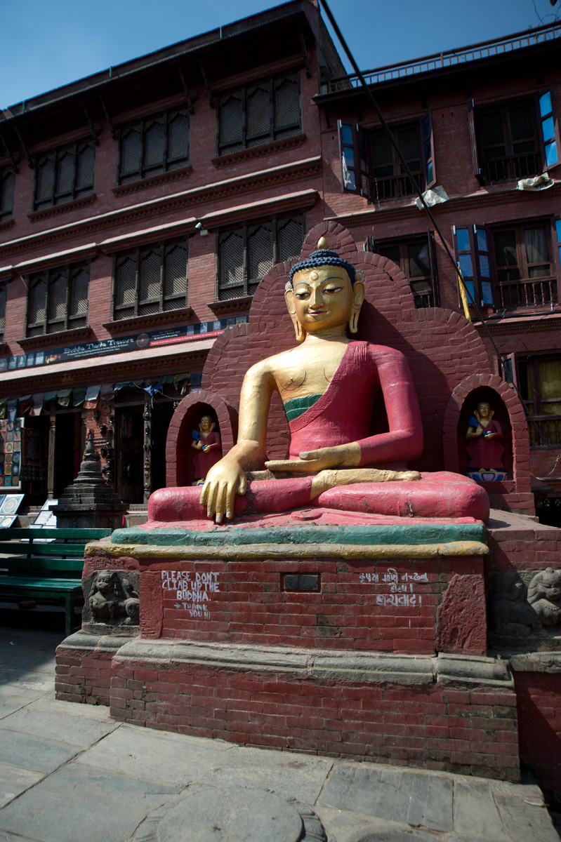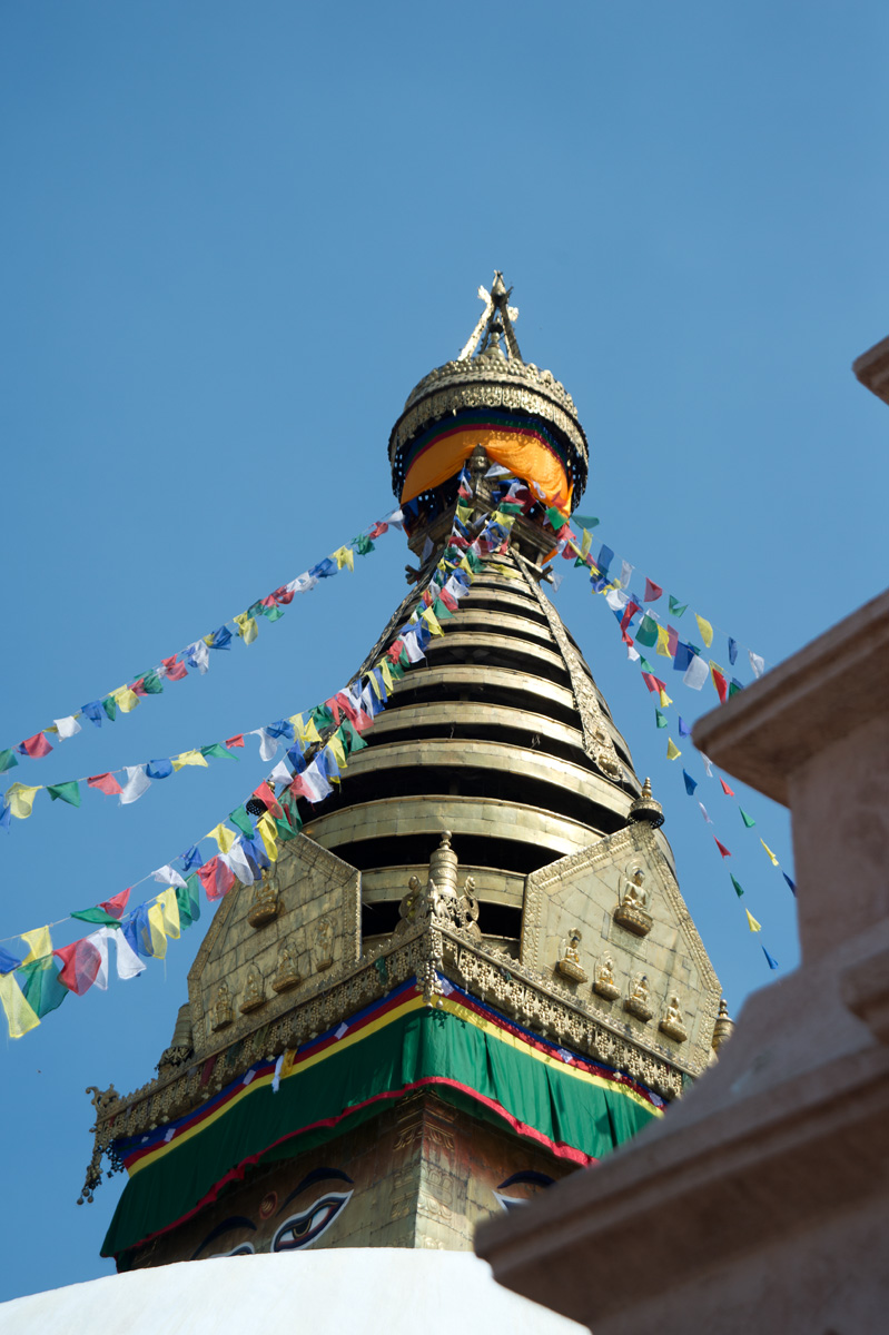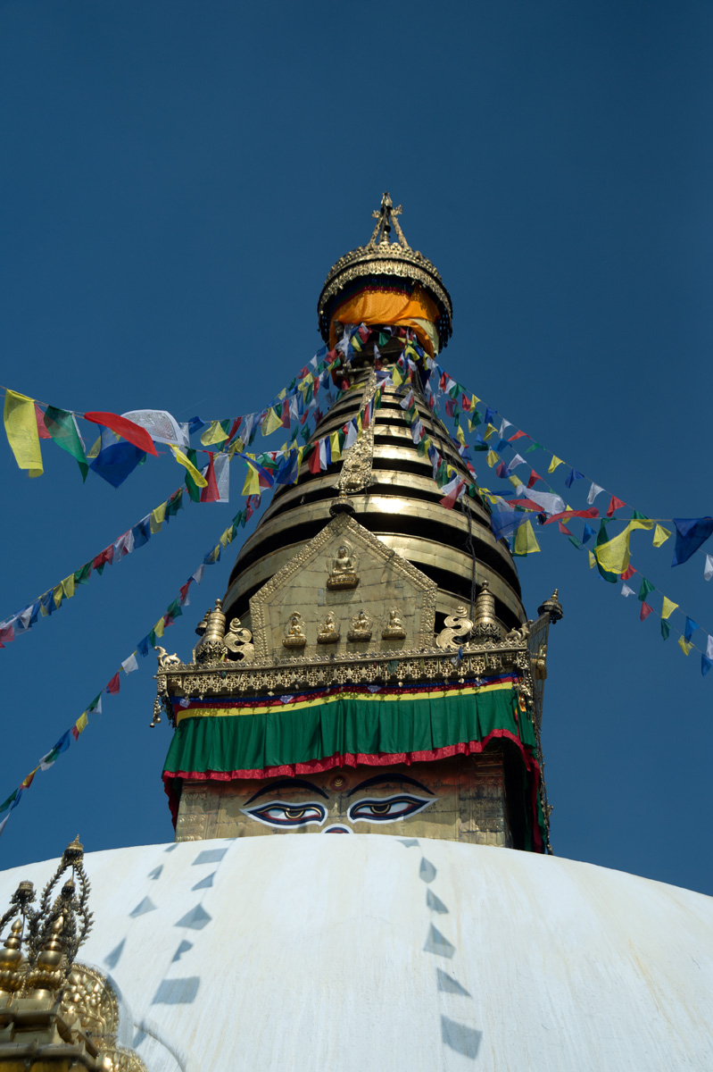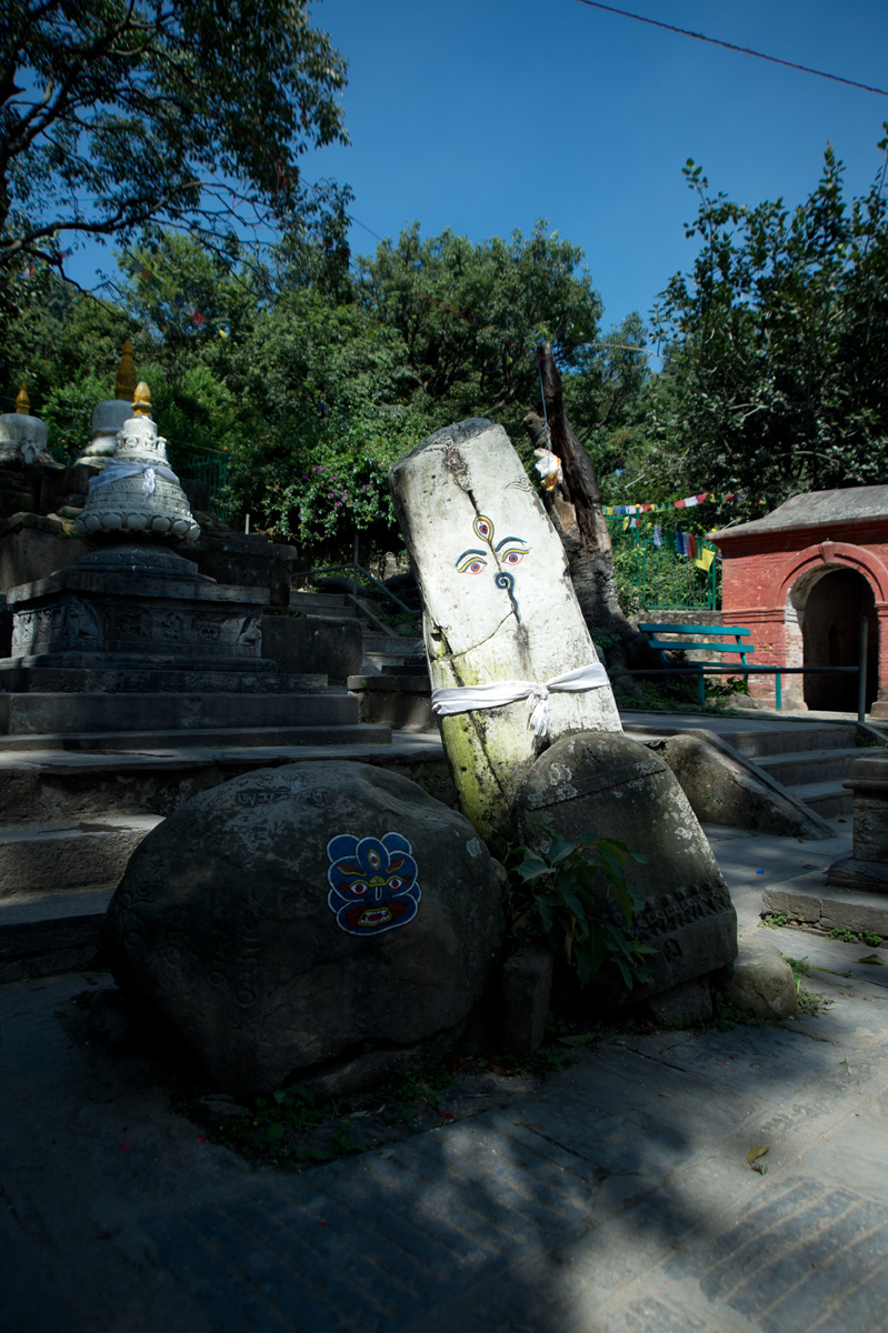 廟最引人注目是的佛塔上的眼睛,塔的四面都刻上了一對佛的眼睛(Buddha Eye),代表佛的智慧和慈悲之眼無處不在,注視著眾生。像?的鼻子是尼泊爾數字的1,代表unity。主塔下面是一個大廣場,有一排轉經輪圍繞著塔,要轉的話就必須向右邊轉。