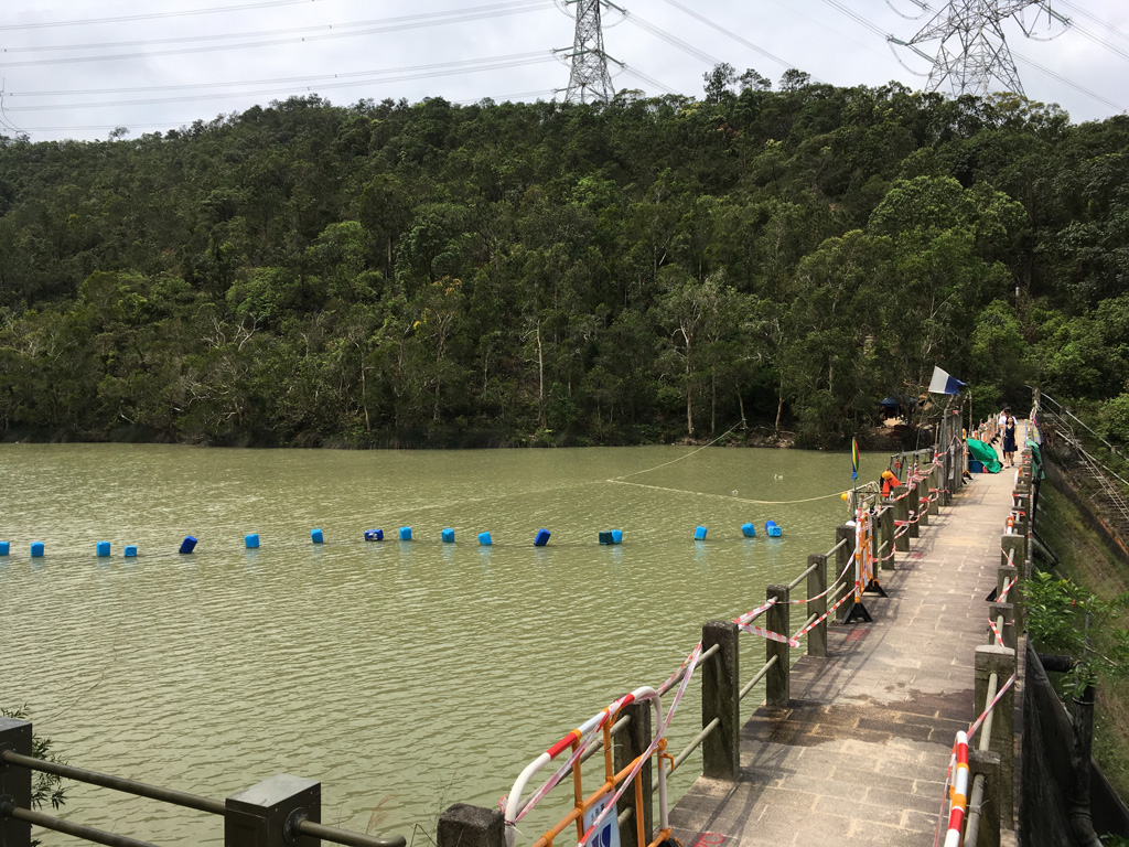 距離藍地水塘不遠有另一個水塘-洪水坑水塘,到這個水塘沒有山徑連接,須要走一小段馬路和繞過石礦場範圍後才有石級通往下面水塘主壩。洪水坑水塘比藍地水塘寧靜,還可走到水塘邊。