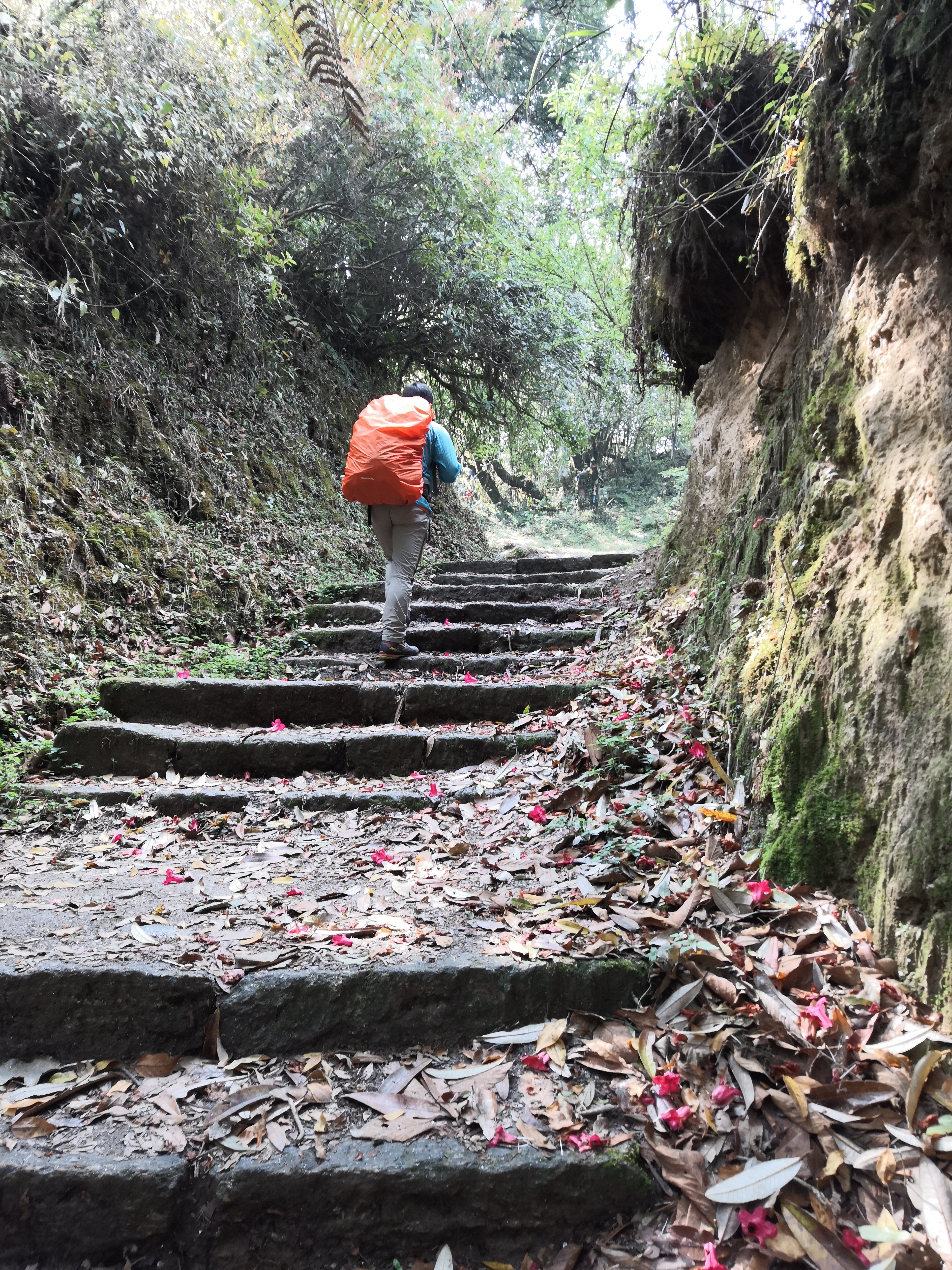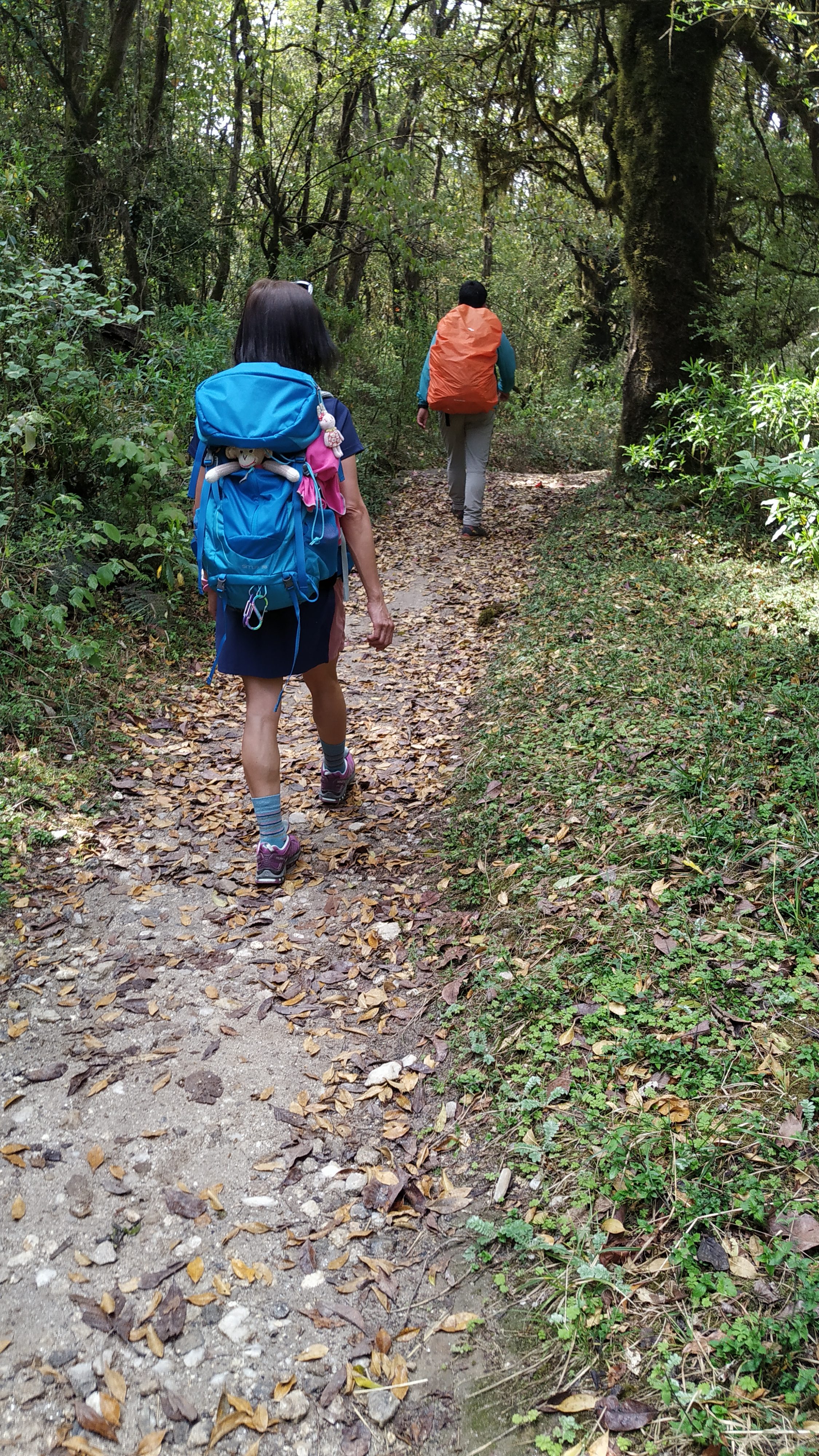 走入森林仍然遍地黃葉,早上和黃昏後氣溫也在20度以下,帶著一點清涼。行了一小段山徑便走馬路,其實只是一條比較濶和可以行車的路。這條路是zic zag而行,緩緩上山,上了一個小時後轉行山徑,一直下山,途中經過小村莊和梯田,大約行了4個小時便到Sundarijal,也是旅程的終點。
