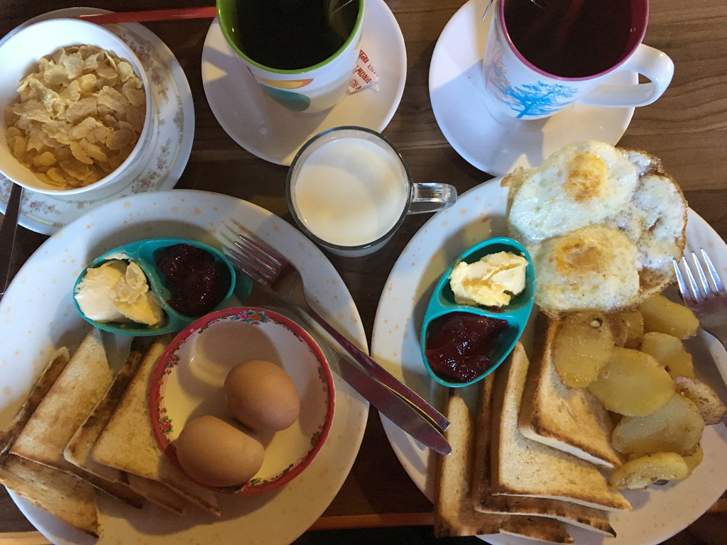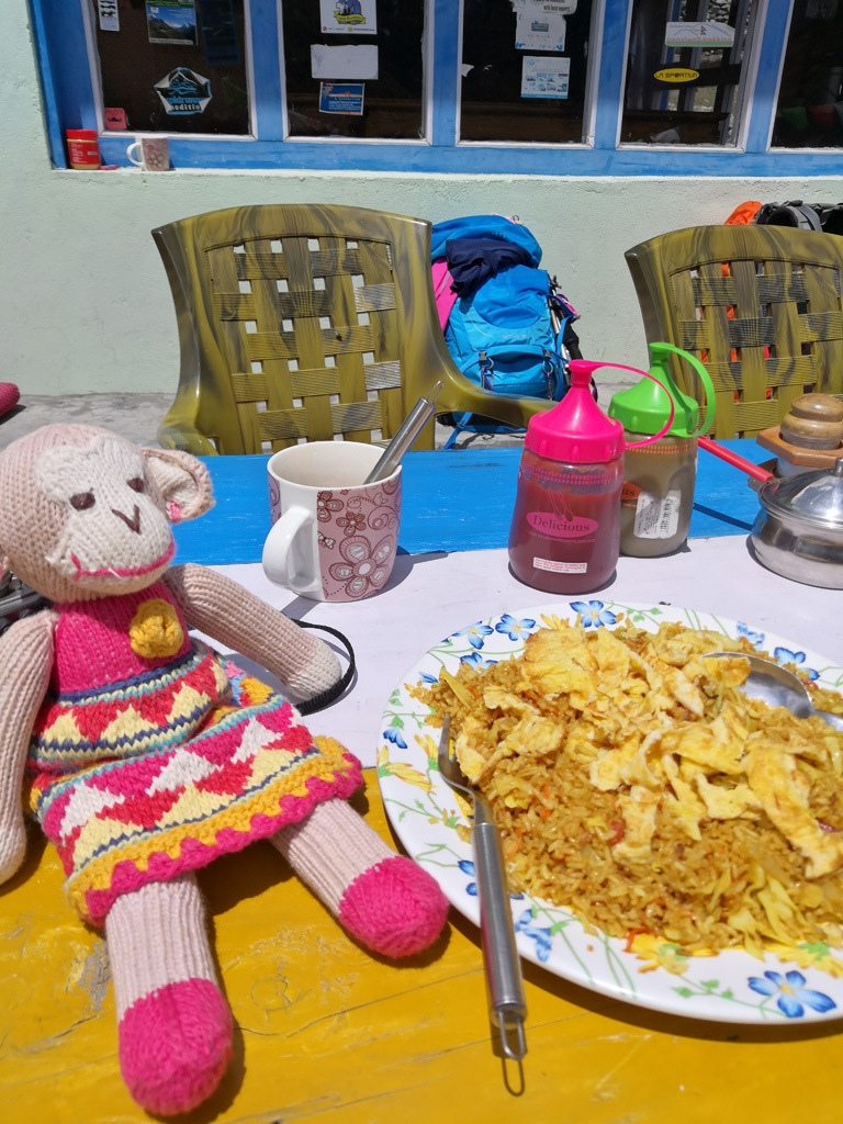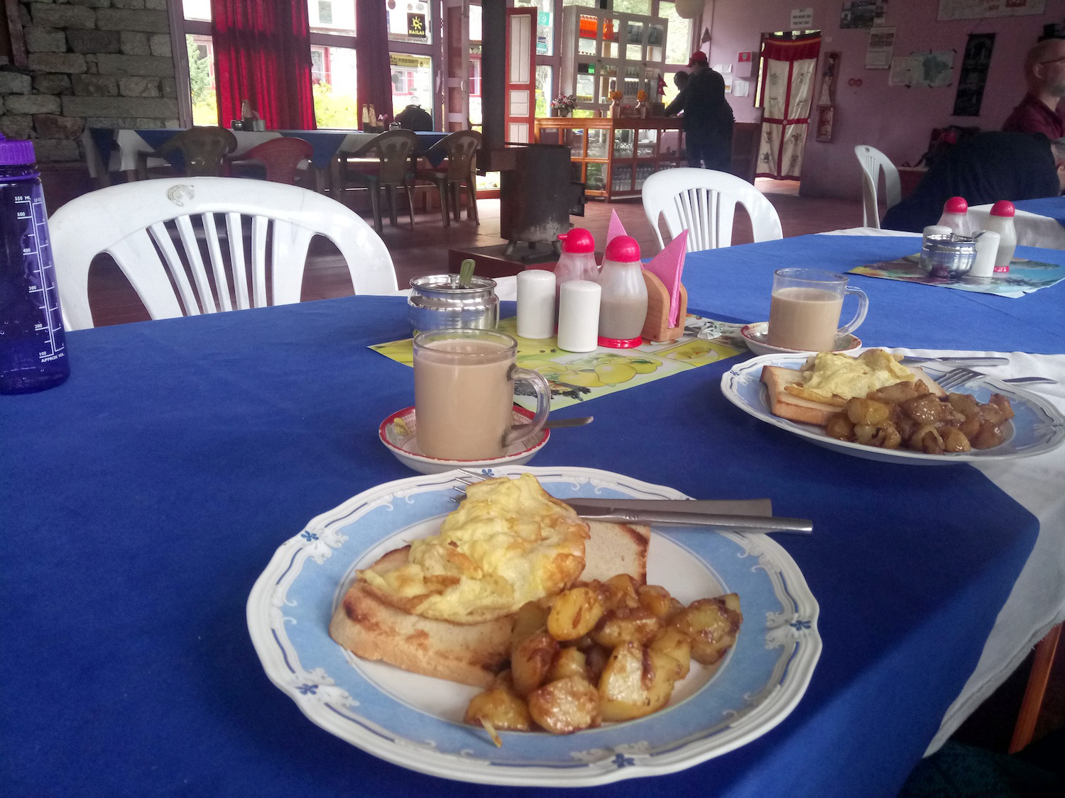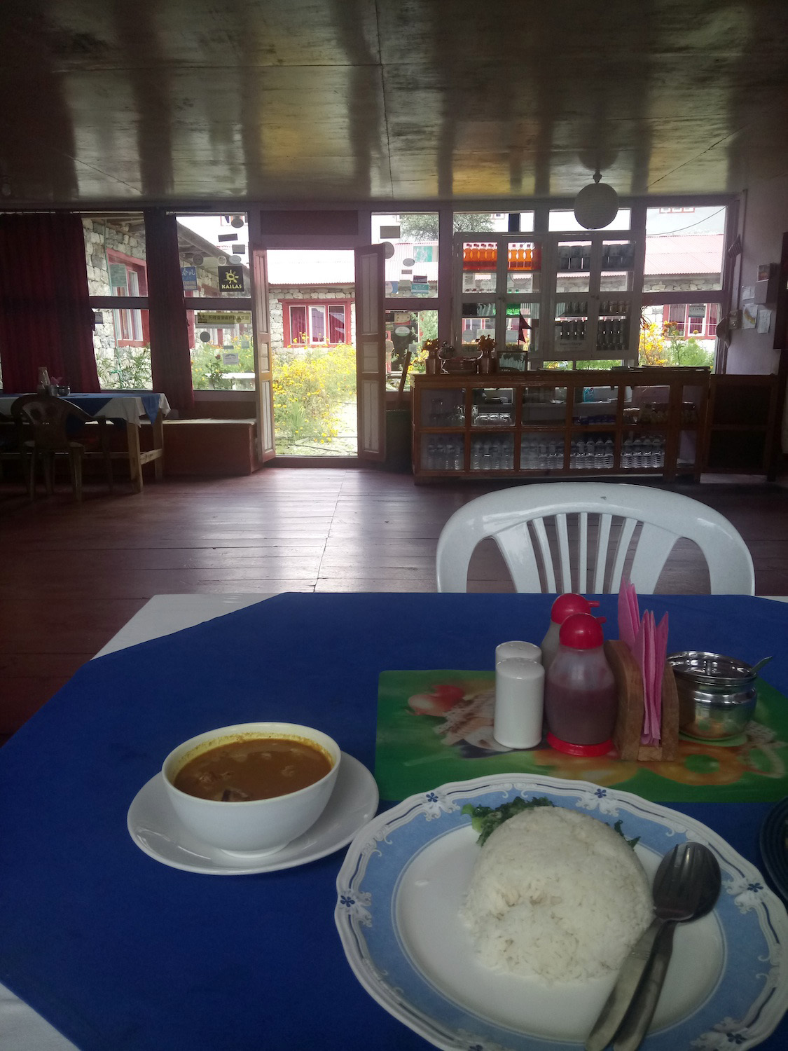另外,由於tea house房間的成本很便宜,營運tea house 的家庭將大部分資金用於食物和飲品上,因此,他們希望登山者在住宿的tea house 內用餐。每一間tea house都有一本數簿,每一個房間的入住和用餐記錄都寫在這裡。如有trekking guide同行,他會寫下我們所點的食物和用膳時間,tea house會根據記錄準備,而沒有guide的登山者就須要自己寫下交給廚房。