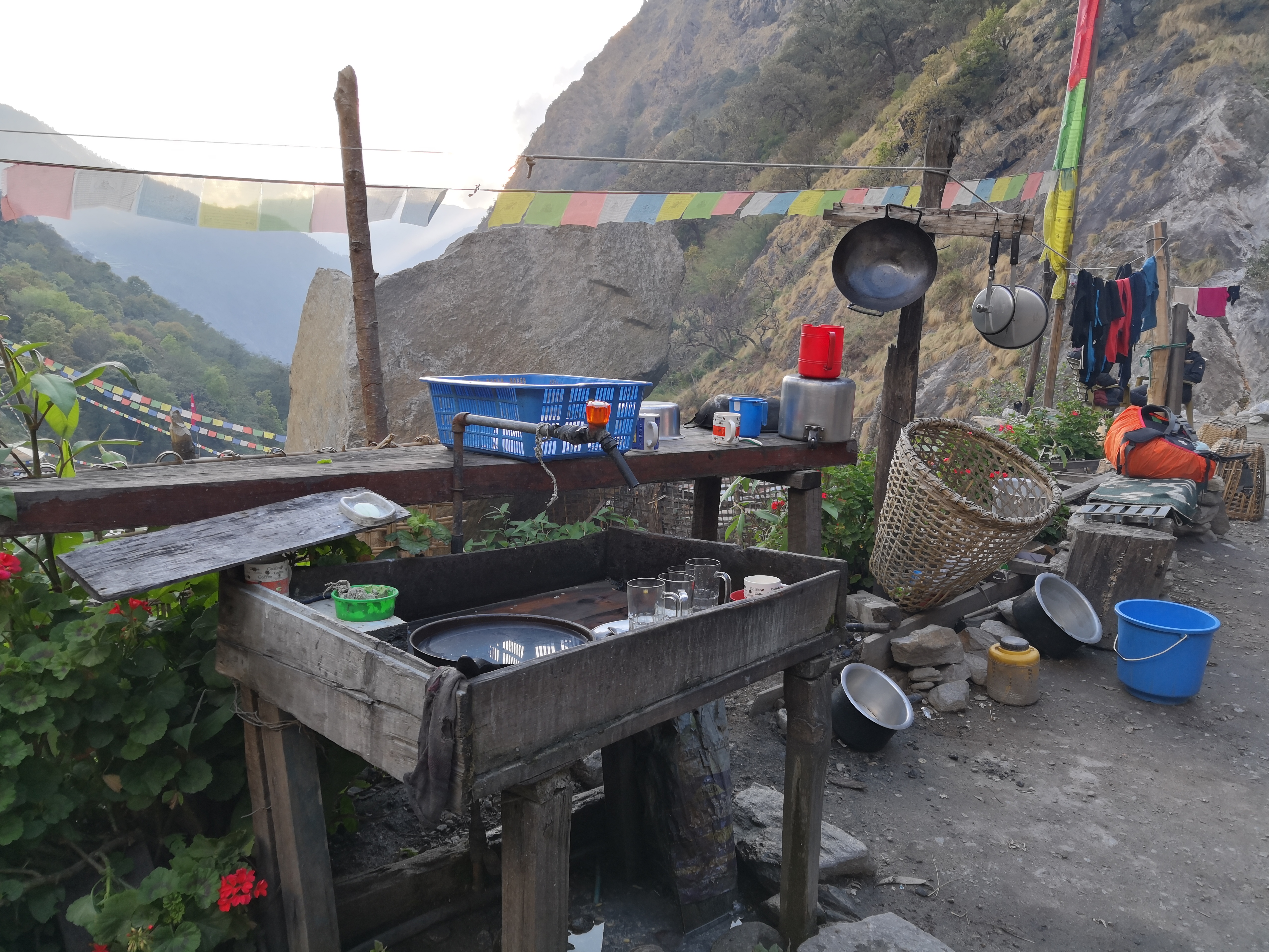 Toilets – 山區的廁所很簡單,多數是蹲式廁所,設在走廊盡頭,有1至2個,都是共用,廁所旁邊會有一桶水供沖廁用。有些tea house的廁所設在室外,最好帶備頭燈或電筒以免晚上摸黑。由於今次很多路段沿河流而行,tea house也建在河邊,水從河引入,所以有水的地方都設在室外。由於水都是從雪山流下來,所以十分冰冷,我們都只用body wipe抹手和洗面,真的佩服他們用冰水洗碗洗衣服。