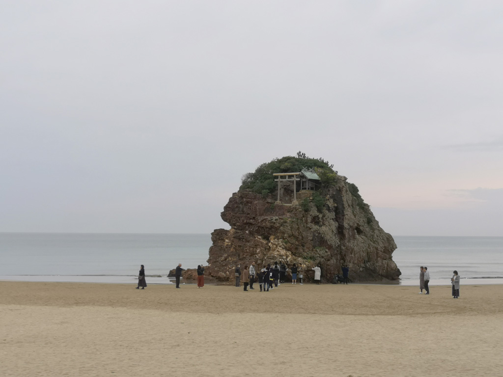 出雲大社佔地非常之大,境內有許多不同的小神社。我們先去御本殿的『素鵞社』,是祭拜主神大國主父親的神社,是境內相當重要的神社。神社前大排長龍,我們沒有排隊去參拜,因為被神社外面的兩個裝滿砂的箱子吸引了,又偶爾看到參拜者帶著砂倒進去一個砂箱,然後又在另一個砂箱取走大約相同份量的砂,覺得有點奇怪,直到我們離開神社去稻佐之濱就明白是什麼一回事了。由於『素鵞社』後面的八雲山是知名的power spot, 擁有強大的能量,所以取得這些砂會帶來好運。如果想帶回家供奉和作御守,就先要去稻佐之濱建有神社的『弁天島』底下挖取適量的砂,接著回到『素鵞社』參拜,將砂倒入砂箱,然後再取適量的砂帶走。