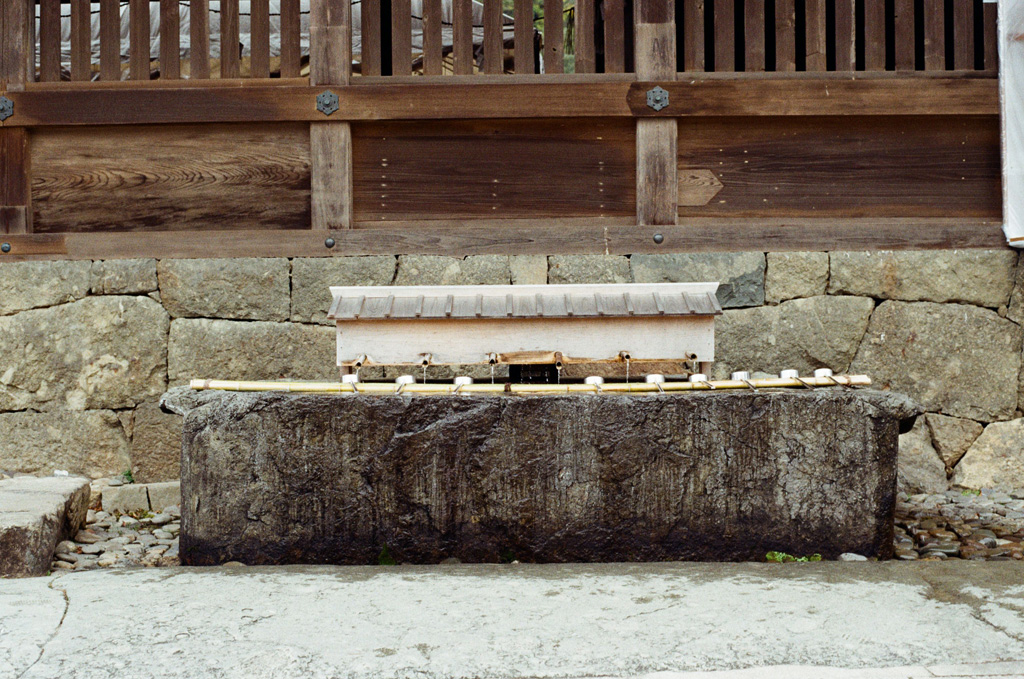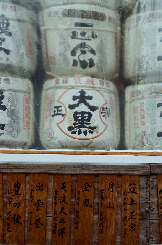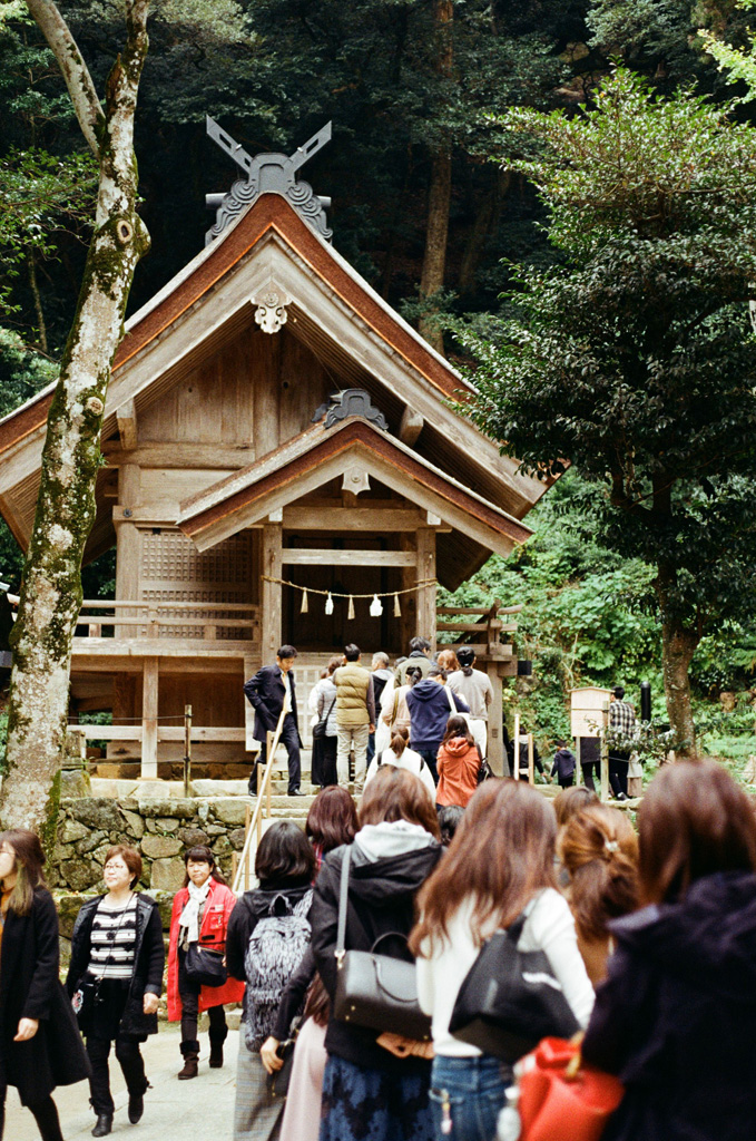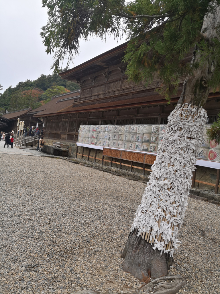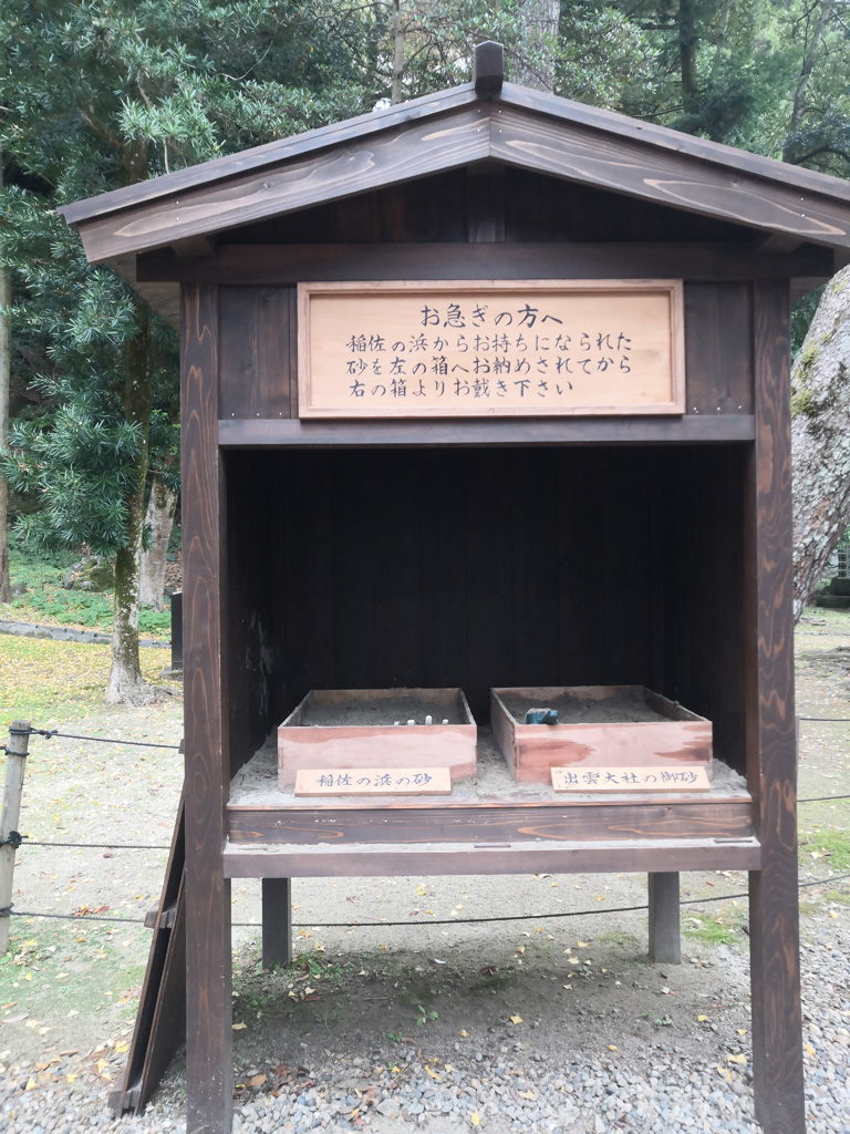 出雲大社佔地非常之大,境內有許多不同的小神社。我們先去御本殿的『素鵞社』,是祭拜主神大國主父親的神社,是境內相當重要的神社。神社前大排長龍,我們沒有排隊去參拜,因為被神社外面的兩個裝滿砂的箱子吸引了,又偶爾看到參拜者帶著砂倒進去一個砂箱,然後又在另一個砂箱取走大約相同份量的砂,覺得有點奇怪,直到我們離開神社去稻佐之濱就明白是什麼一回事了。由於『素鵞社』後面的八雲山是知名的power spot, 擁有強大的能量,所以取得這些砂會帶來好運。如果想帶回家供奉和作御守,就先要去稻佐之濱建有神社的『弁天島』底下挖取適量的砂,接著回到『素鵞社』參拜,將砂倒入砂箱,然後再取適量的砂帶走。