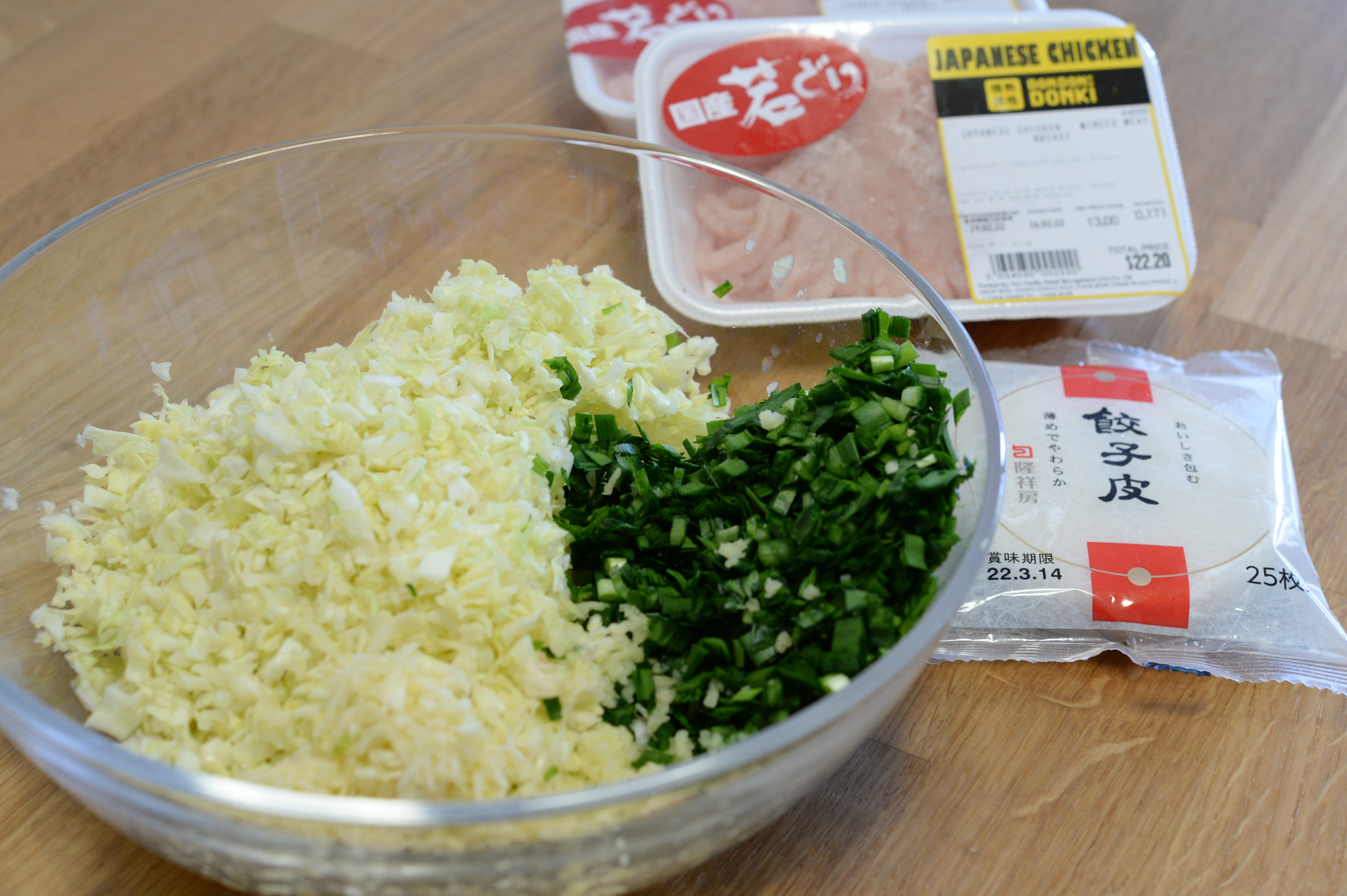 - 椰菜洗淨瀝乾,切碎,再撒少許鹽把水份擠乾。