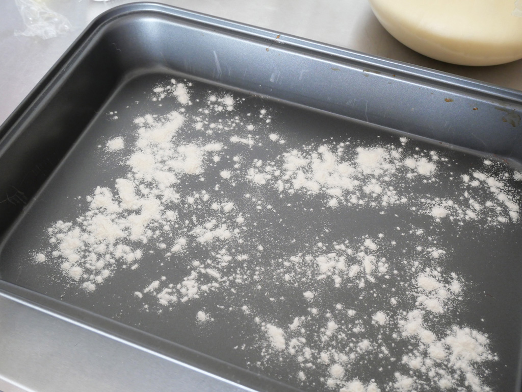 2. 完成發酵後,用手排氣及整成長方形,放在已灑上高筋麵粉的長方盤中,蓋上保鮮紙放入冰箱冷藏約30分鐘 。