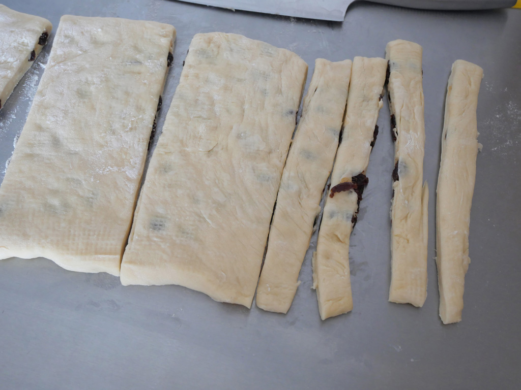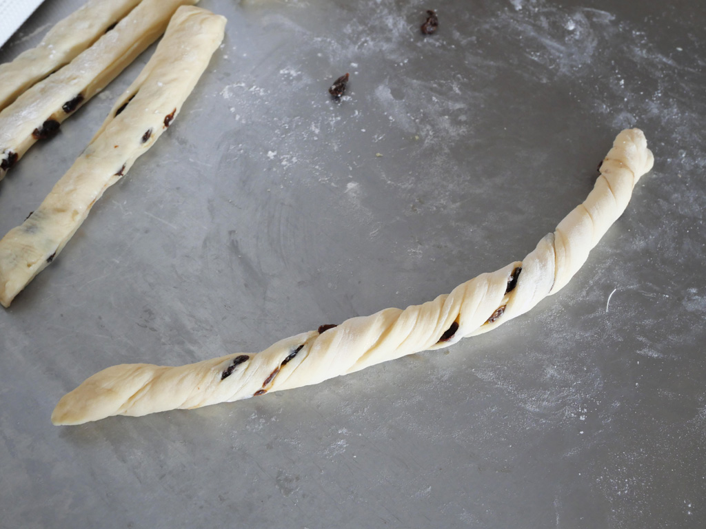 4. 取出麵糰略為整理一下,用刀切成16條,取2條疊在一起,將麵糰略為伸展,兩隻手各按著麵糰一端,分別向上和下滾,直到成為一條長辮子,然後再將辮子對摺扭緊。