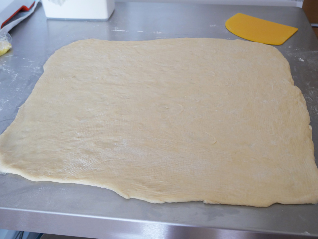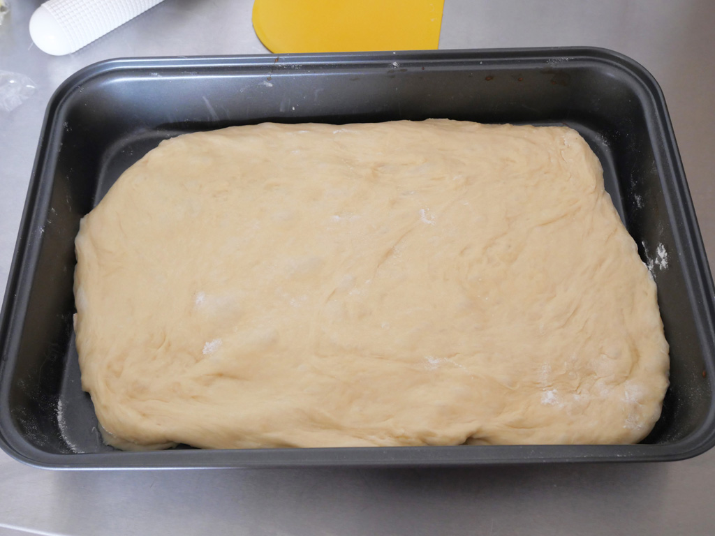 2. 完成發酵後,用手排氣及整成長方形,放在已灑上高筋麵粉的長方盤中,蓋上保鮮紙放入冰箱冷藏約30分鐘 。