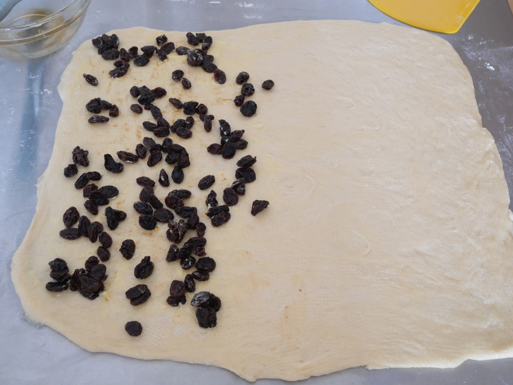3. 取出麵糰,擀成長方形,一半麵團上塗牛油及鋪上提子乾,對摺壓平,放回長方盤中,蓋上保鮮紙放入冰箱冷藏約30分鐘 。