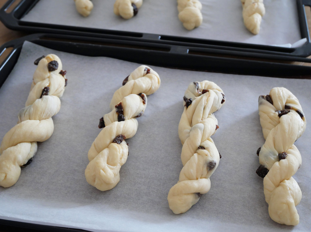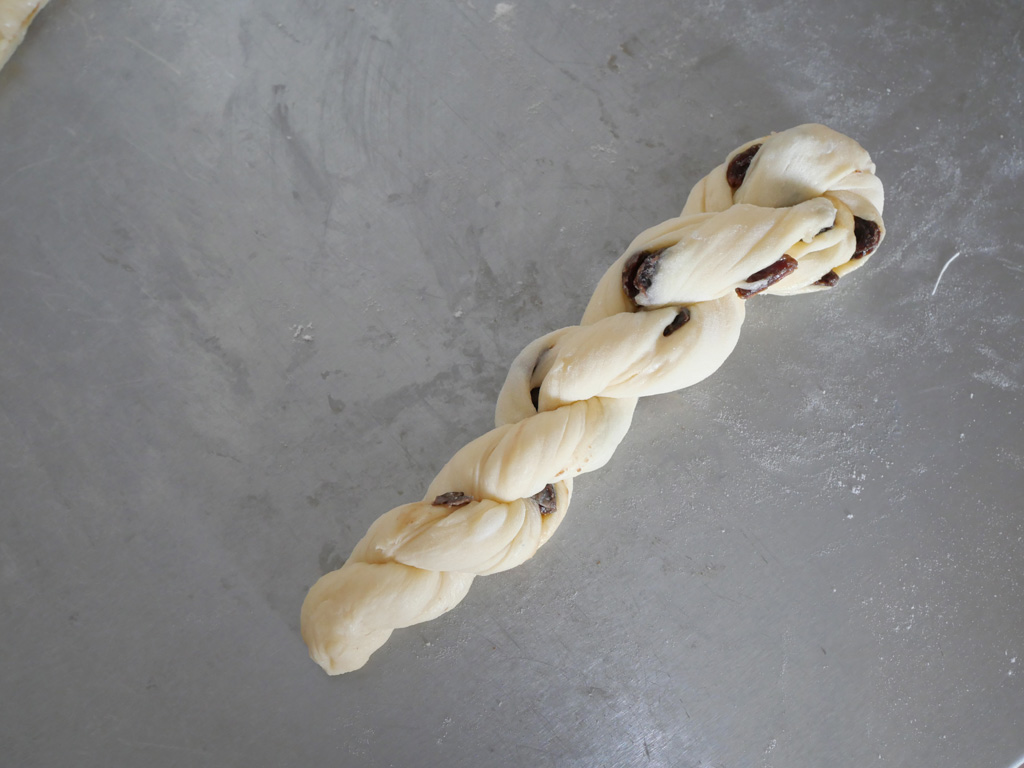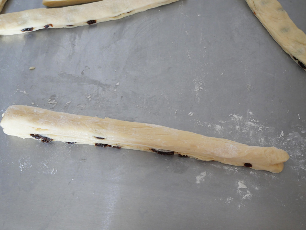 4. 取出麵糰略為整理一下,用刀切成16條,取2條疊在一起,將麵糰略為伸展,兩隻手各按著麵糰一端,分別向上和下滾,直到成為一條長辮子,然後再將辮子對摺扭緊。