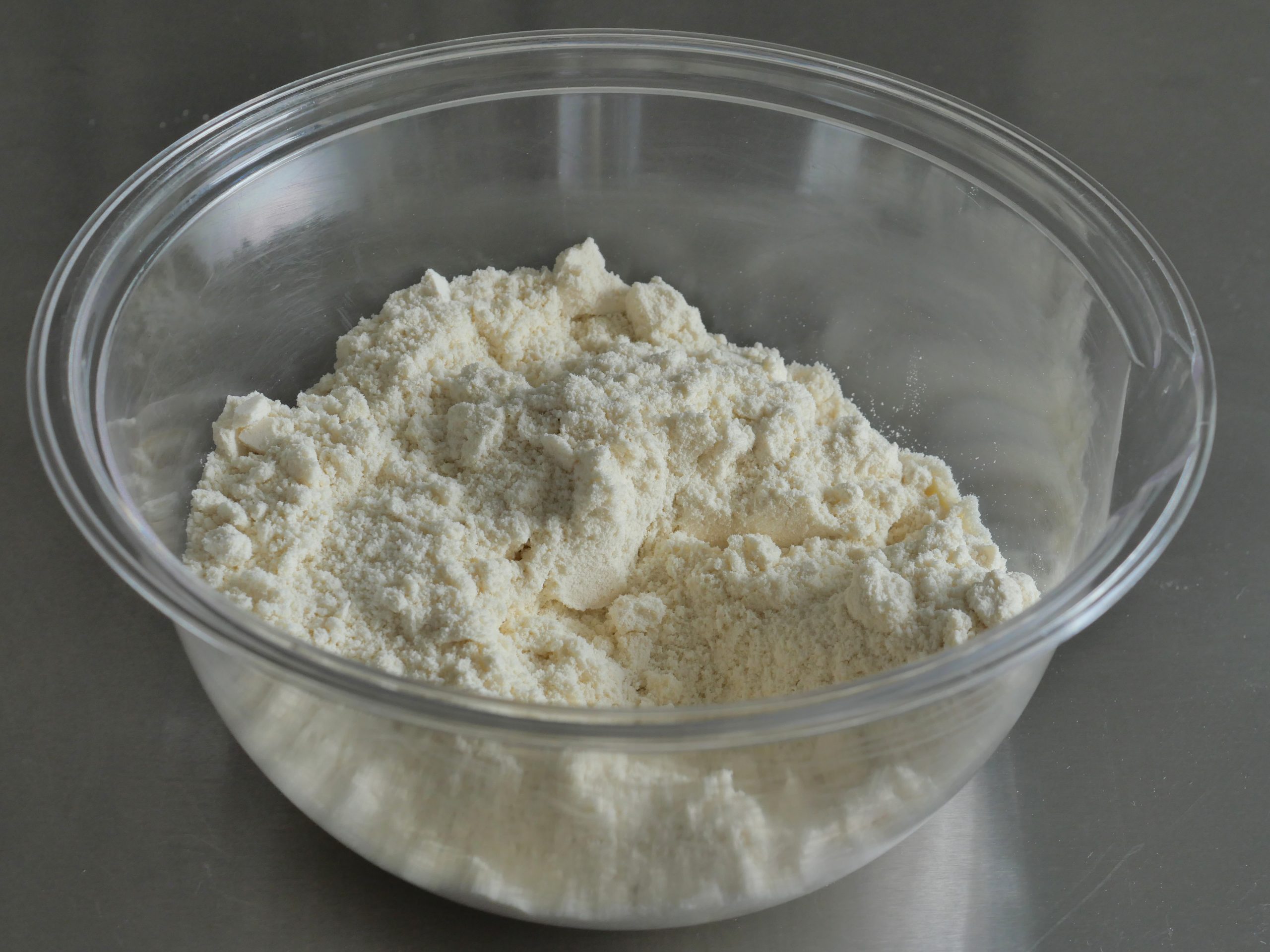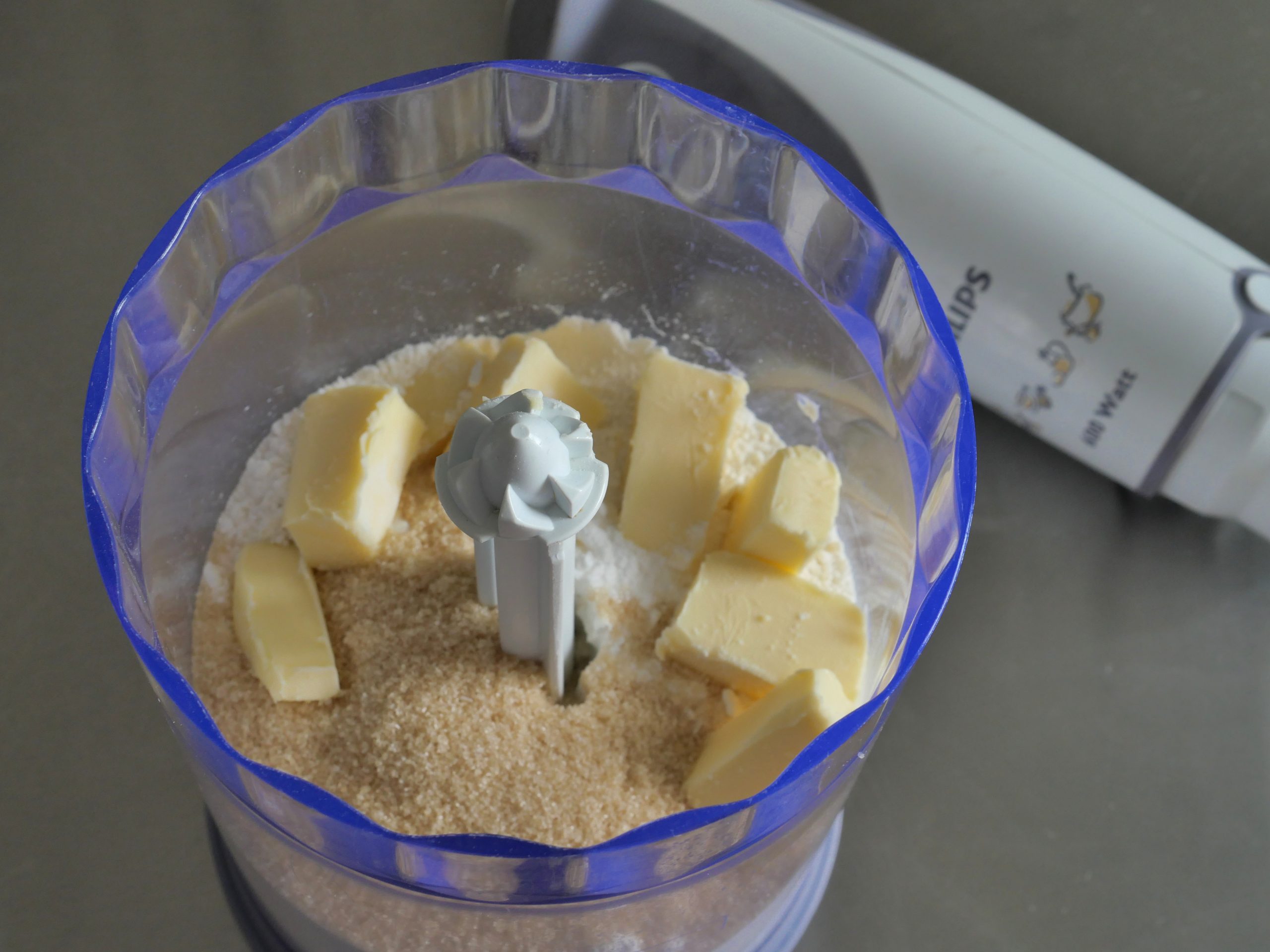 - Place flour, baking powder, sugar, salt in a food processor, add cold butter. Mix until the mixture resembles breadcrumbs.