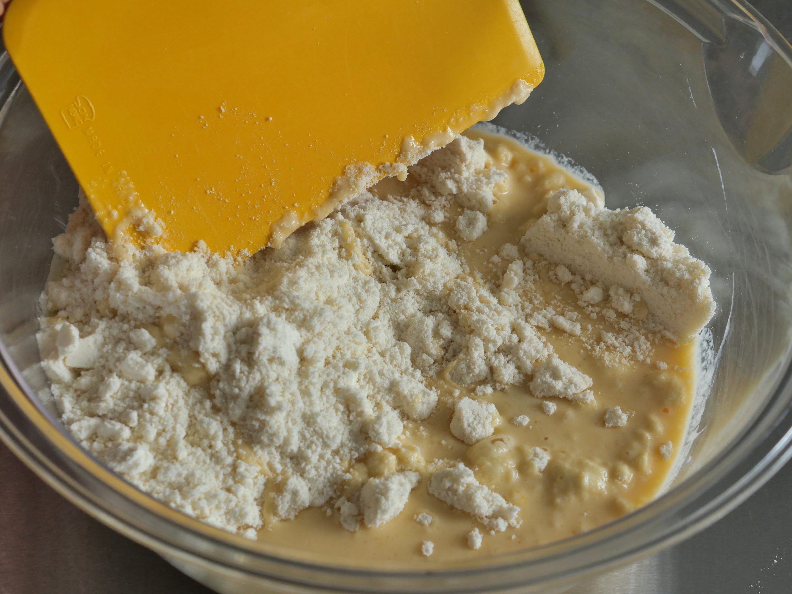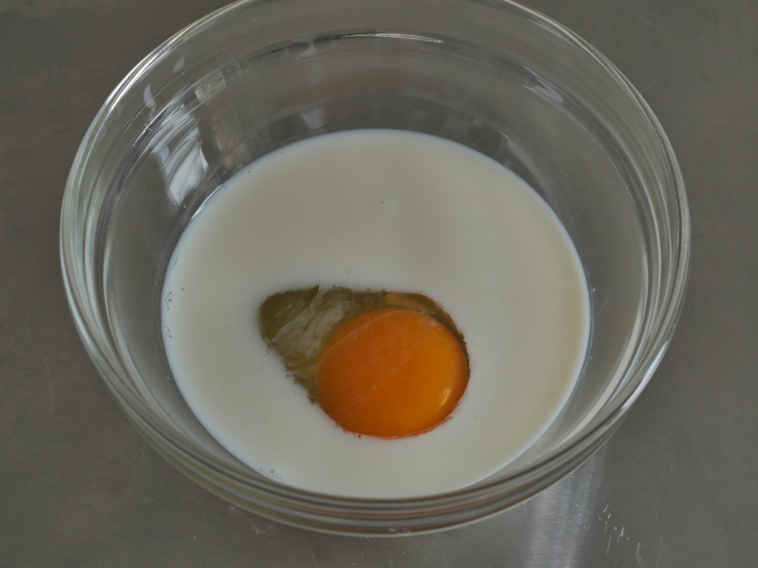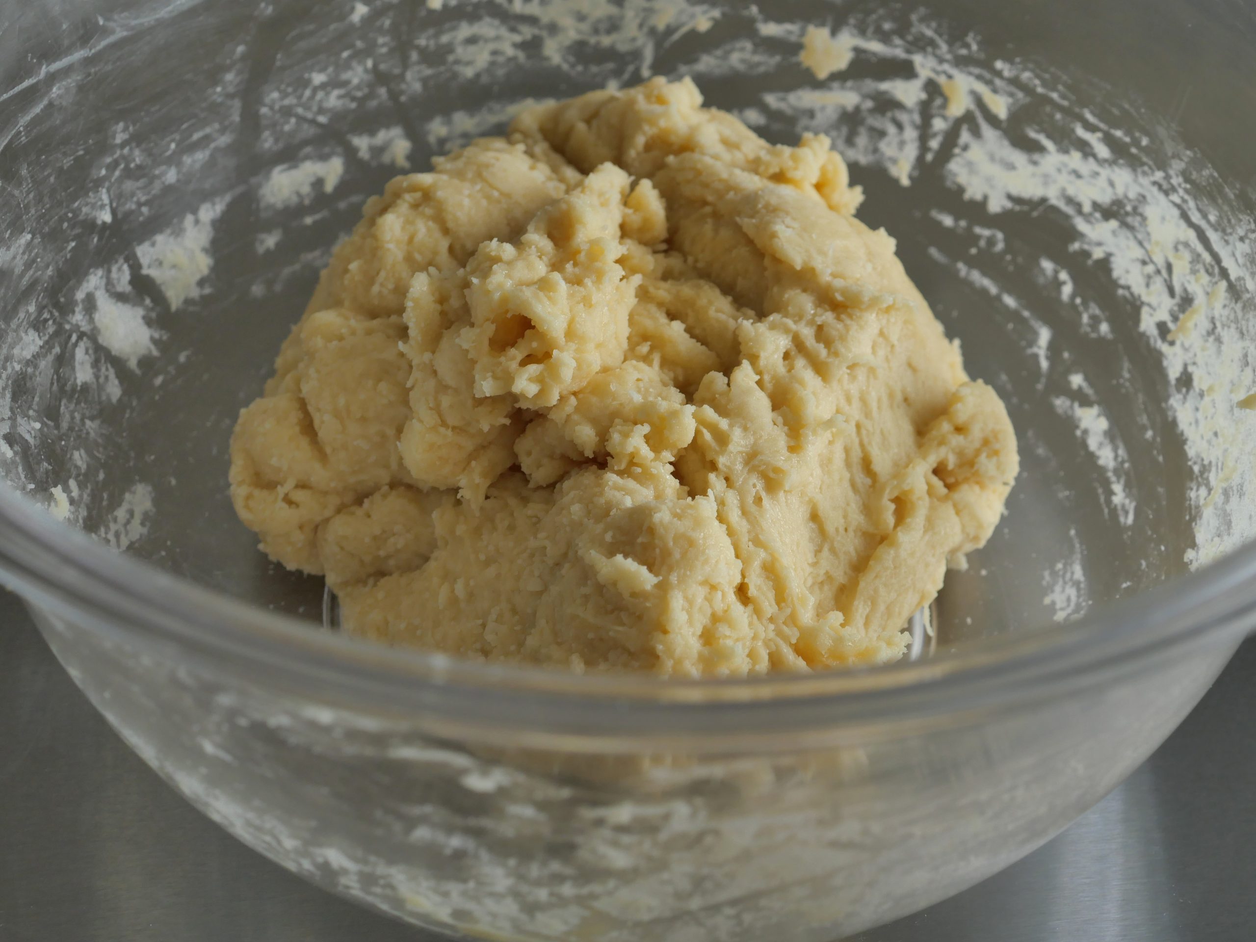 - Gradually stir in the egg and milk. Mix slightly with a scraper in cutting motion to form a dough. Then fold 3 – 4 times while pressing lightly.