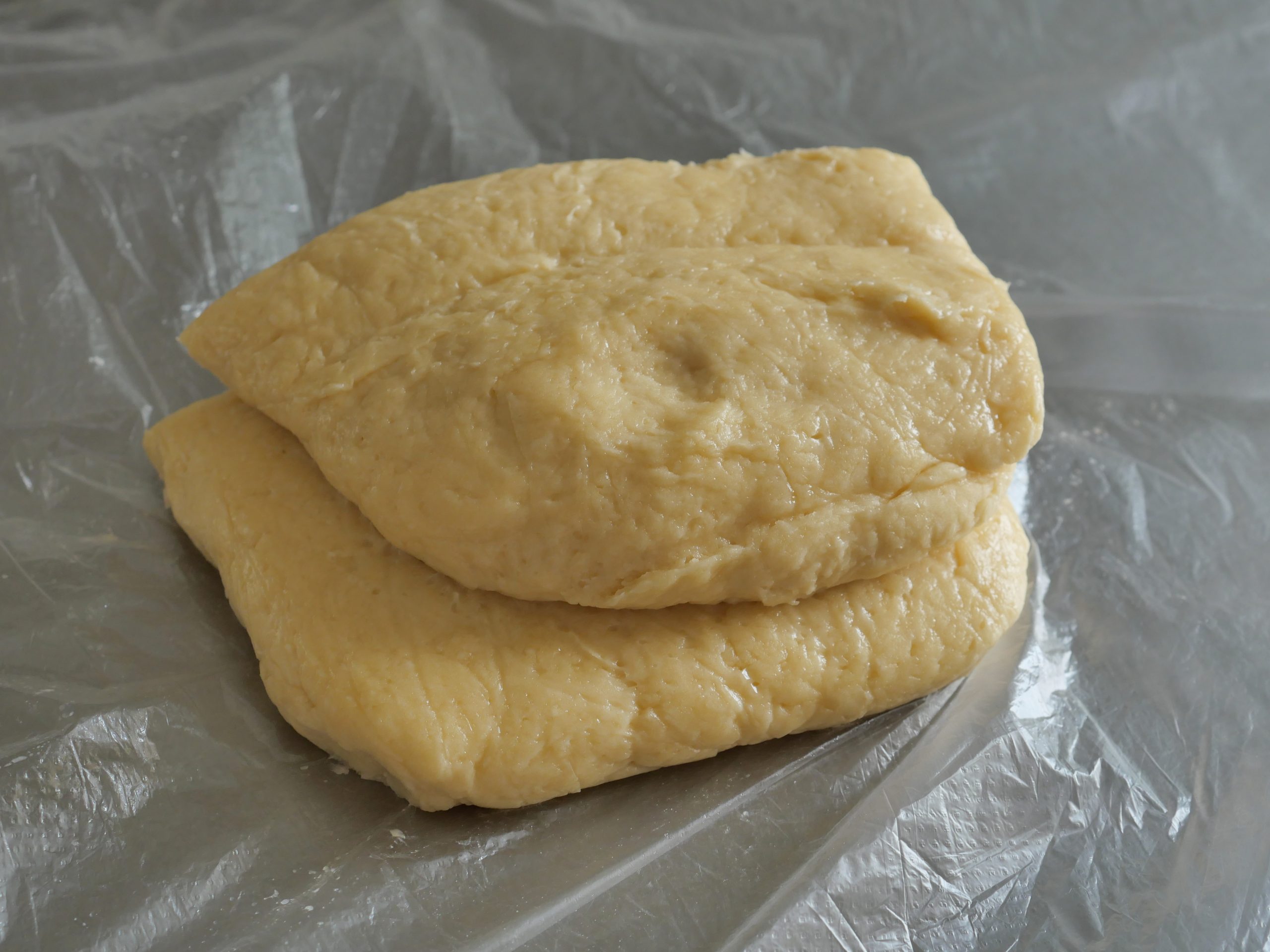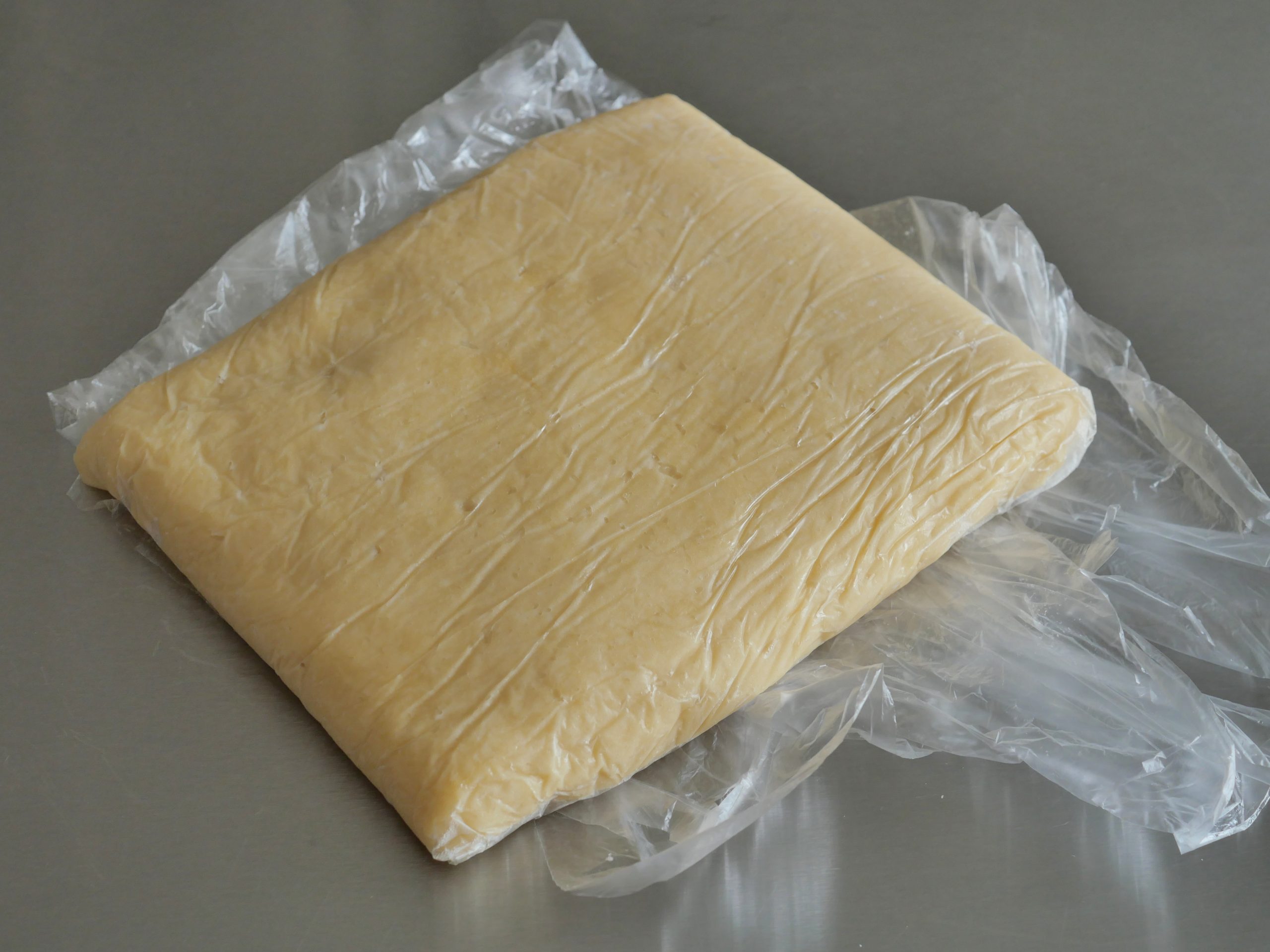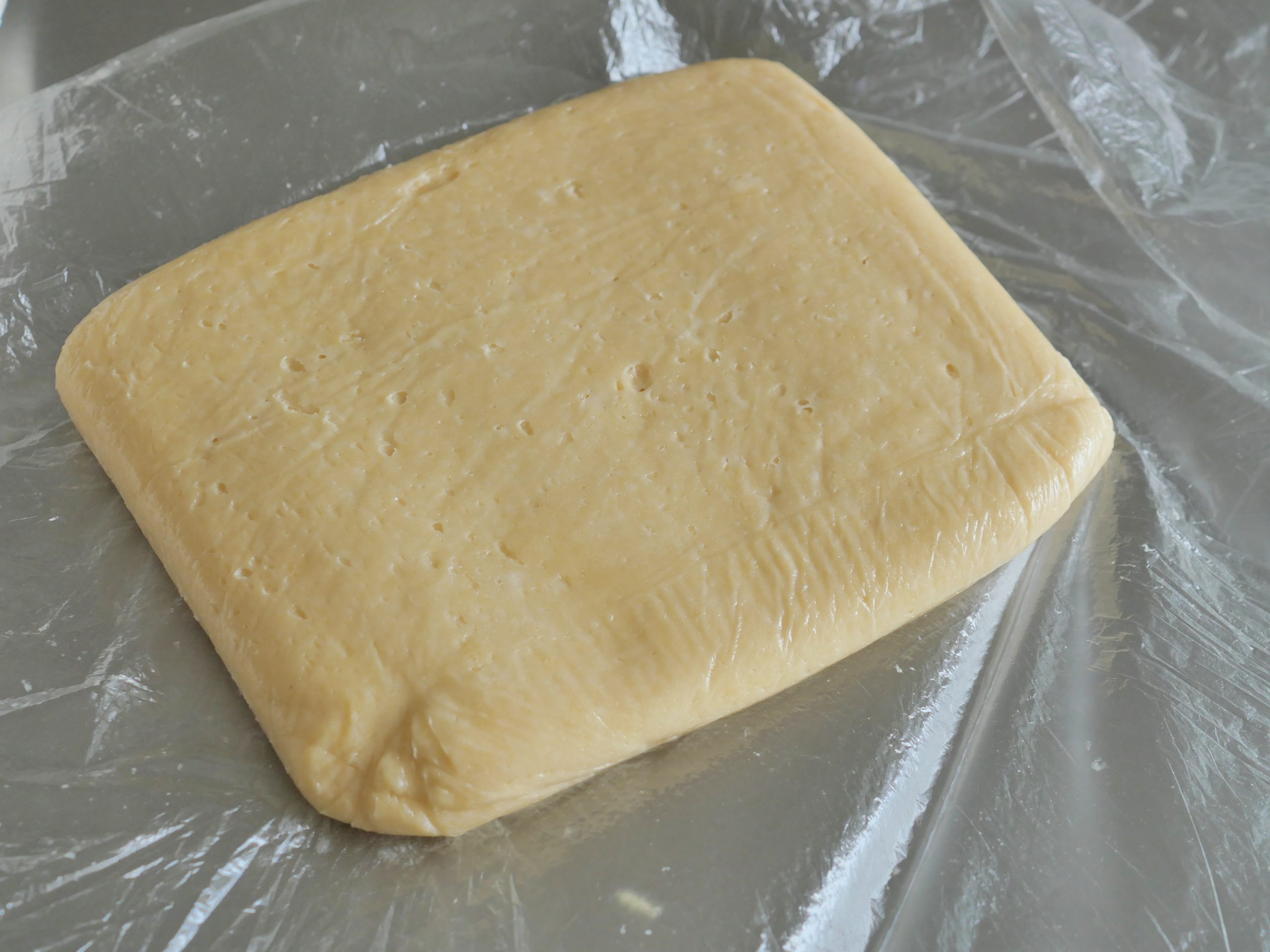 - Place the dough onto a plastic, wrap the dough, slightly press and roll out. Open the wrap and cut into 2 pieces. Pile up, wrap and roll out again. Repeat this roll out, cut, pile process 3 times. Then wrap and store in the refrigerator for 30 minutes.