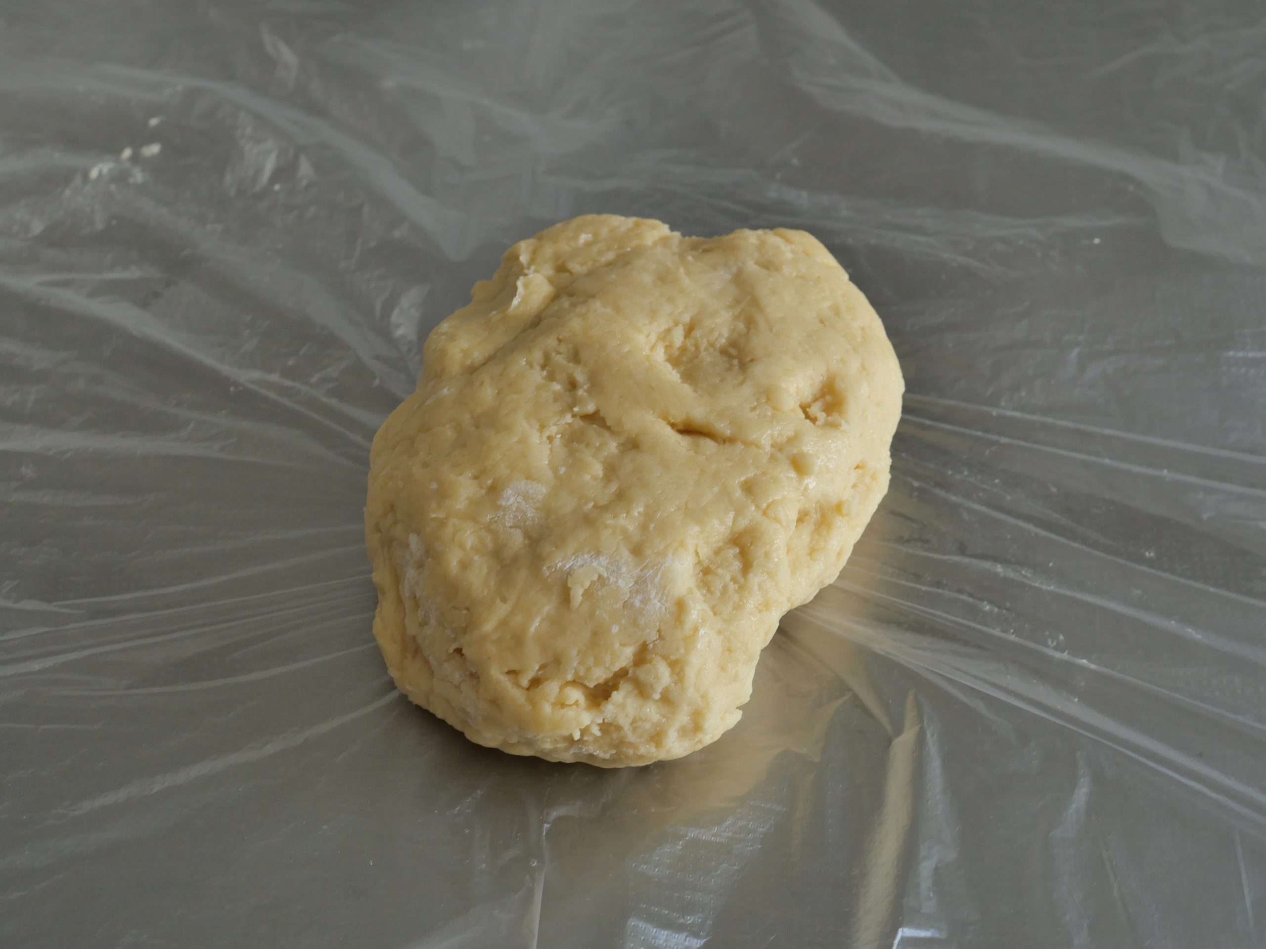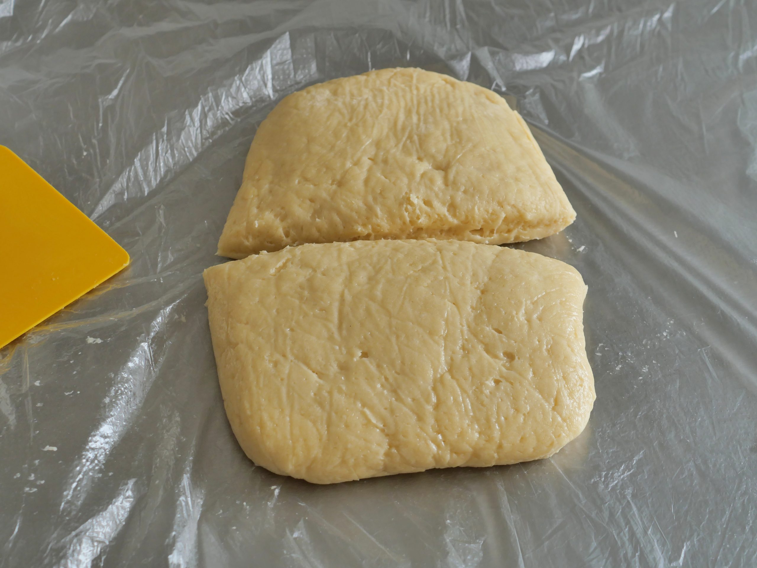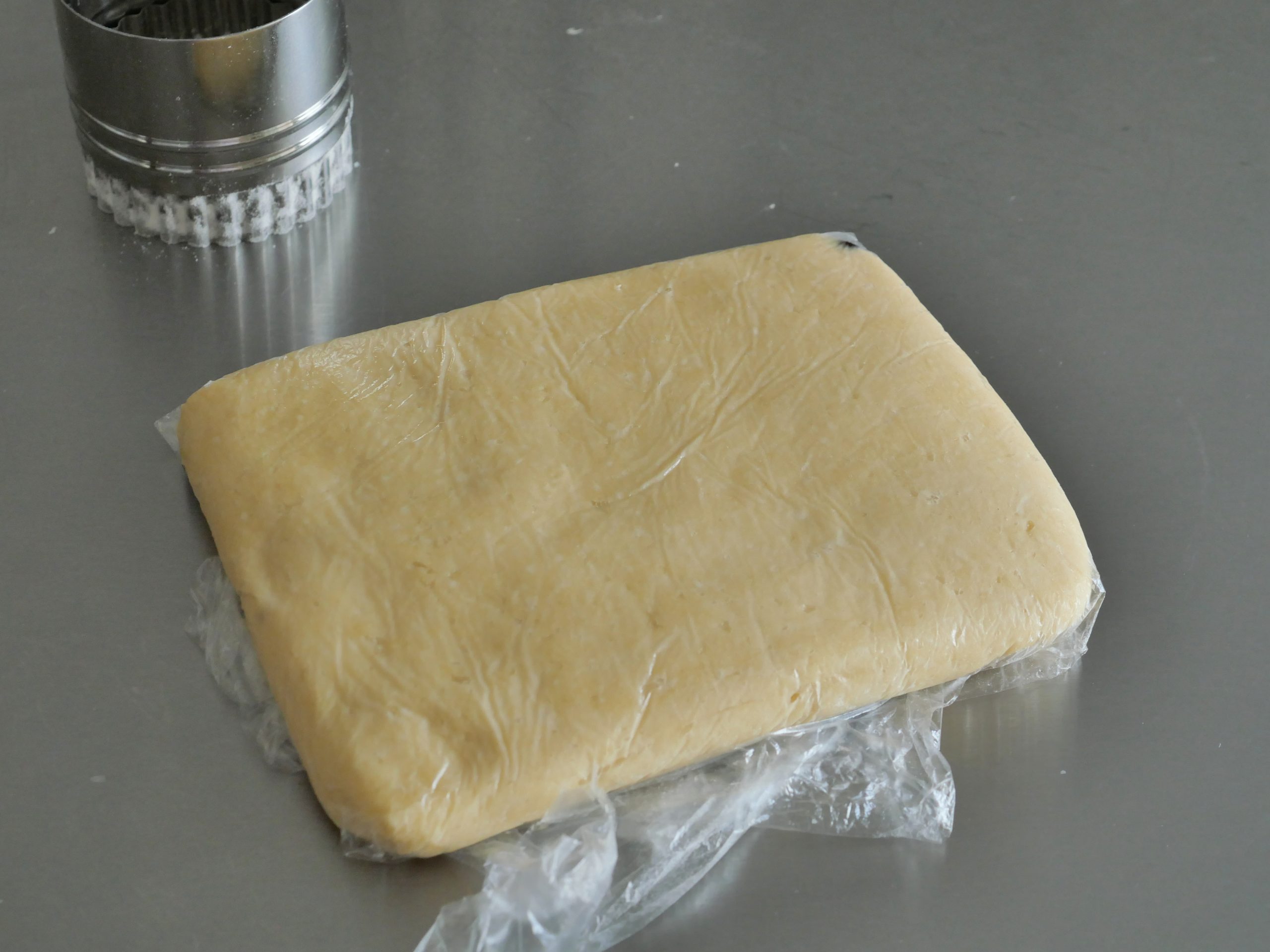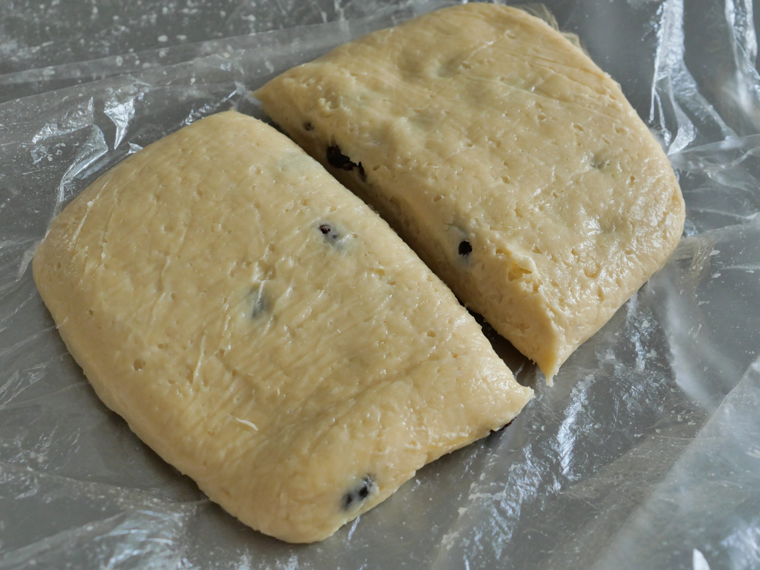 - Place the dough onto a plastic, wrap the dough, slightly press and roll out. Open the wrap and cut into 2 pieces. Pile up, wrap and roll out again. Repeat this roll out, cut, pile process 3 times. Then wrap and store in the refrigerator for 30 minutes.
