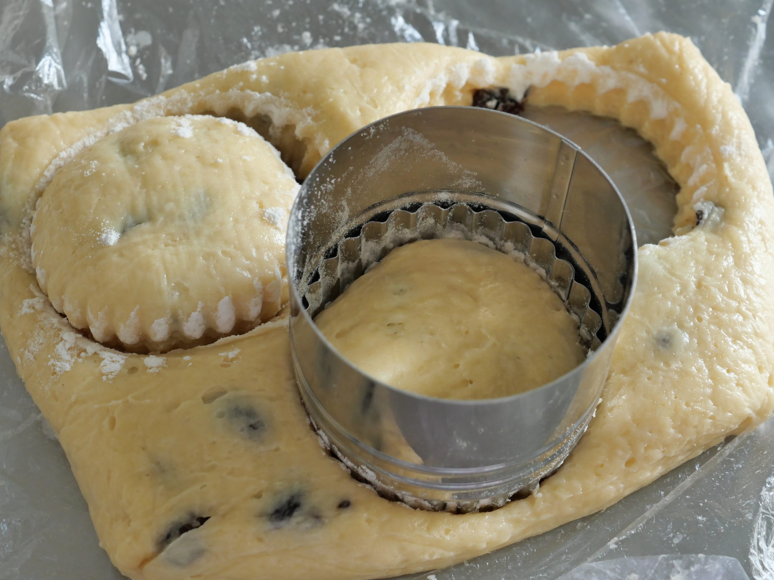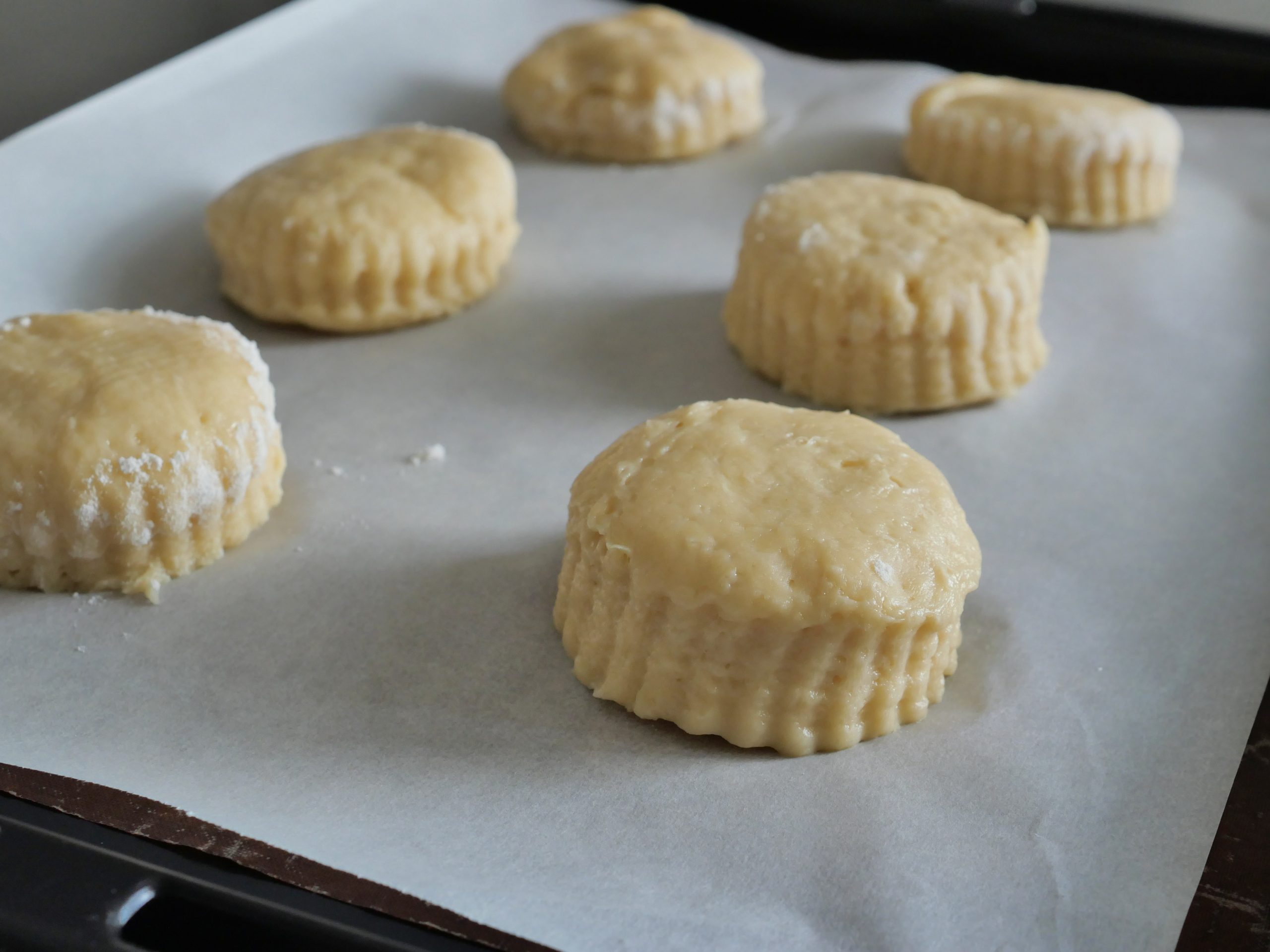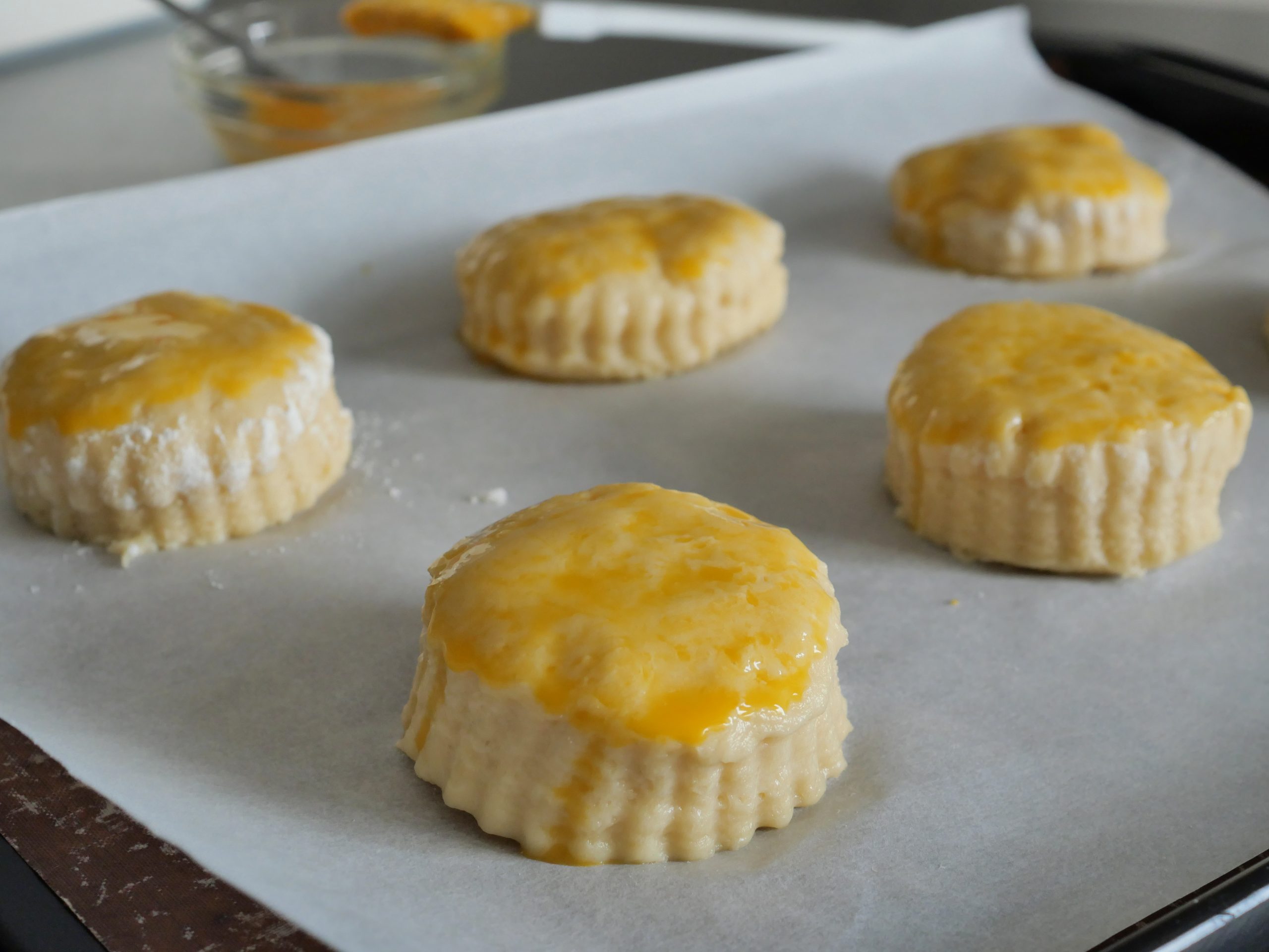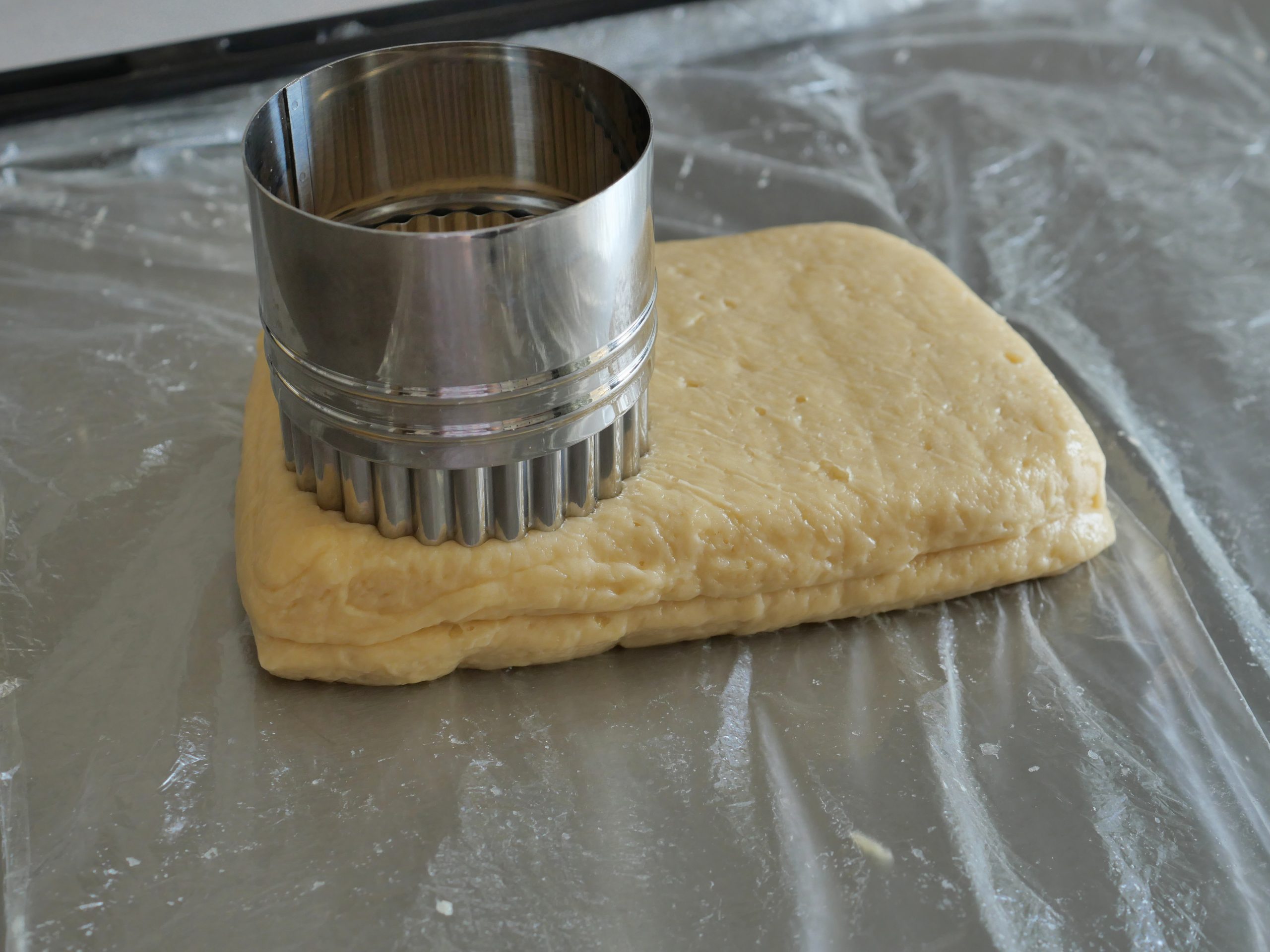 - Take the dough out from the fridge, repeat the roll out, cut, pile process 2 times, then cut into rounds with the cutter (if the cutter stick to the dough, lightly dust the edge of the cutter with flour).